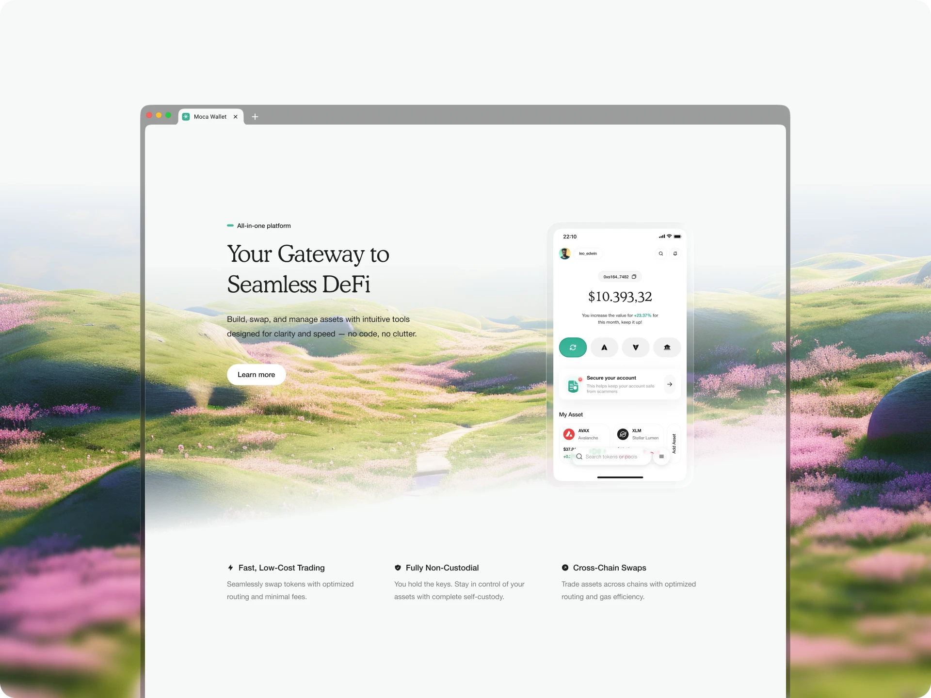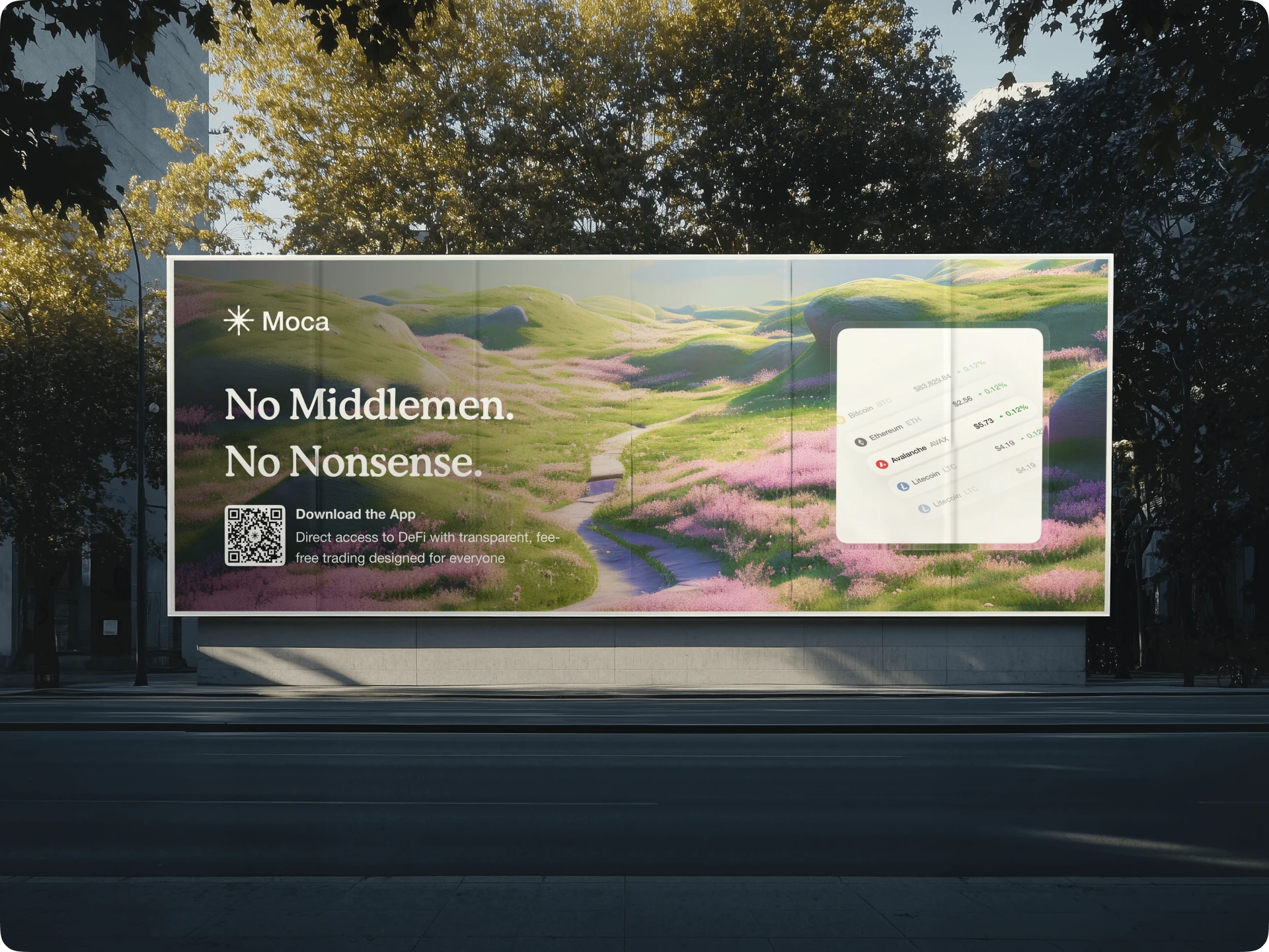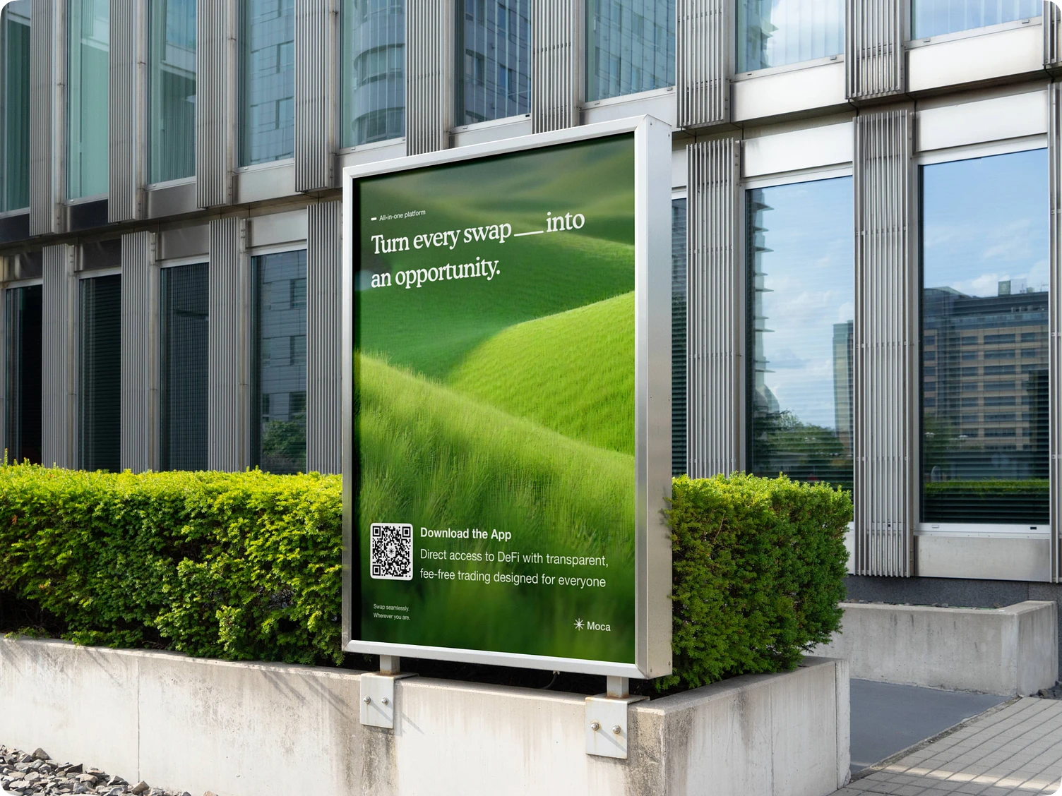 The use of lush, rolling landscapes ties the brand visually to nature, reinforcing Moca’s commitment to sustainability. The imagery communicates freshness, renewal, and a lighter ecological footprint, positioning Moca as the eco-conscious choice in decentralized trading.