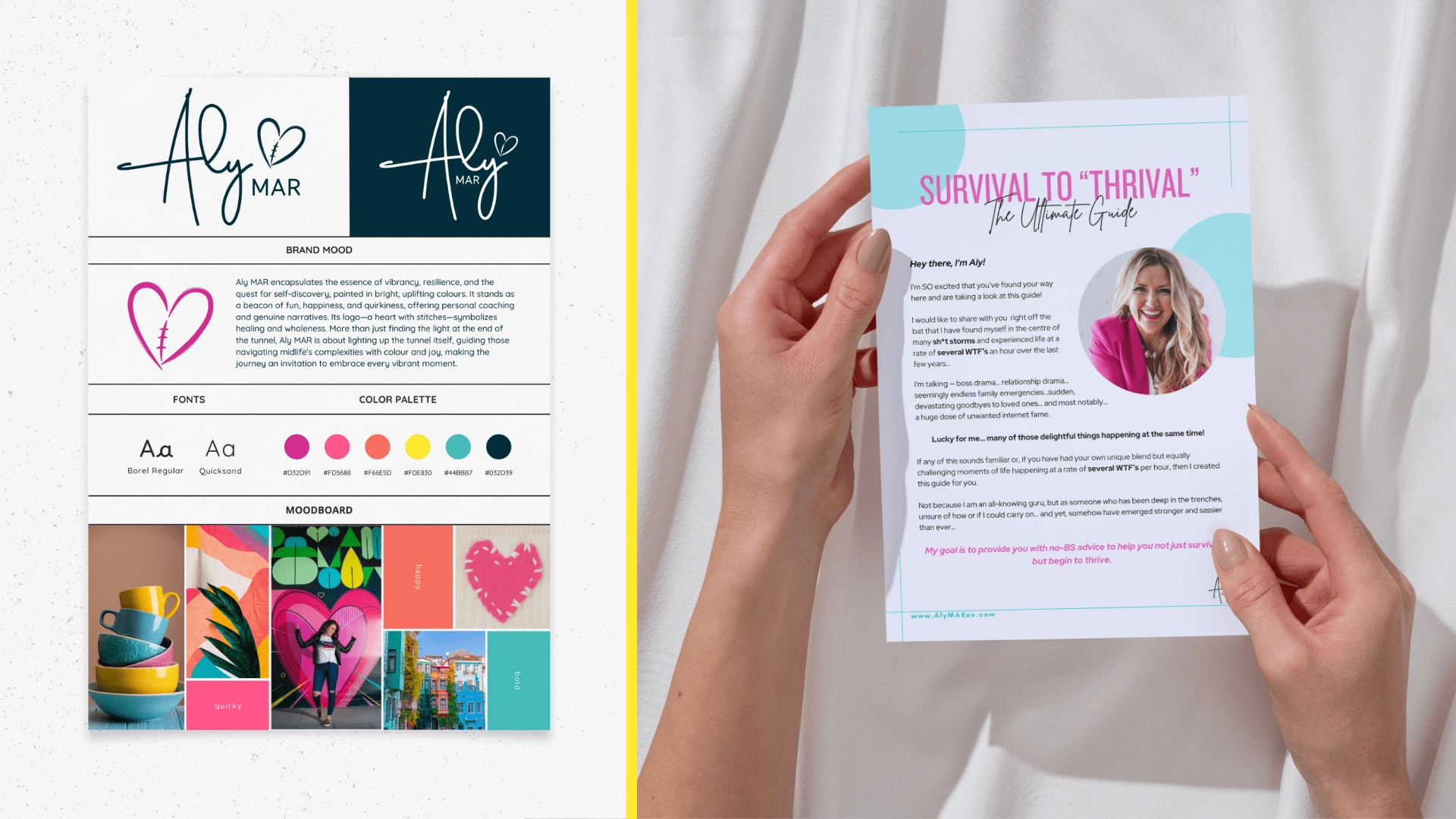 The workbook, "Survival to Thrival: The Ultimate Guide", was designed as a lead magnet to engage Aly's audience. It blends interactive elements and practical advice, with a layout that aligns with the brand’s vibrant aesthetic.