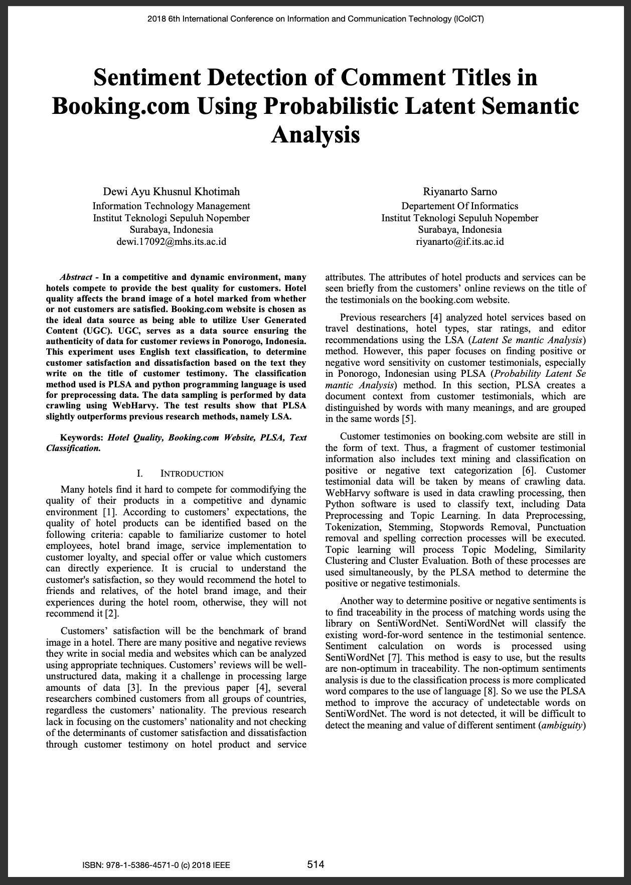 IEEE conference paper on sentiment detection in Booking.com reviews using Probabilistic Latent Semantic Analysis (PLSA).