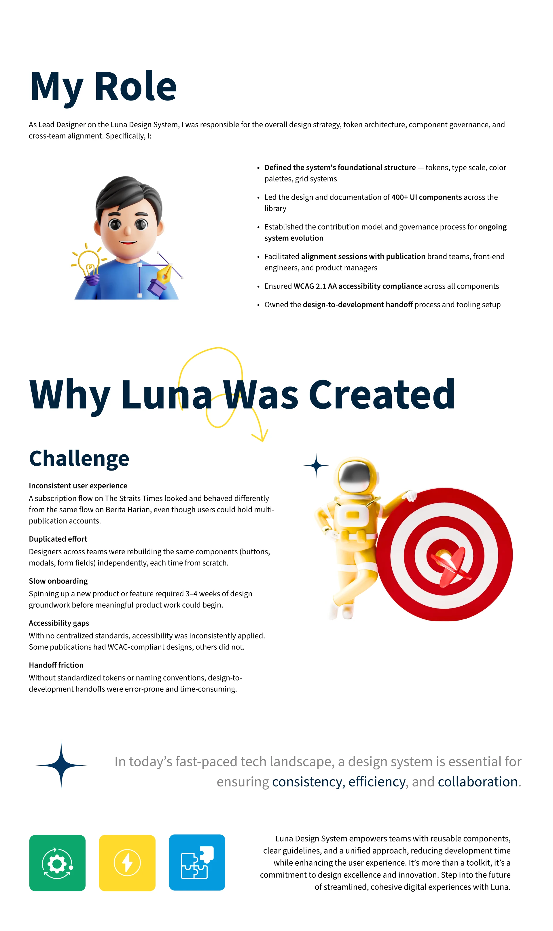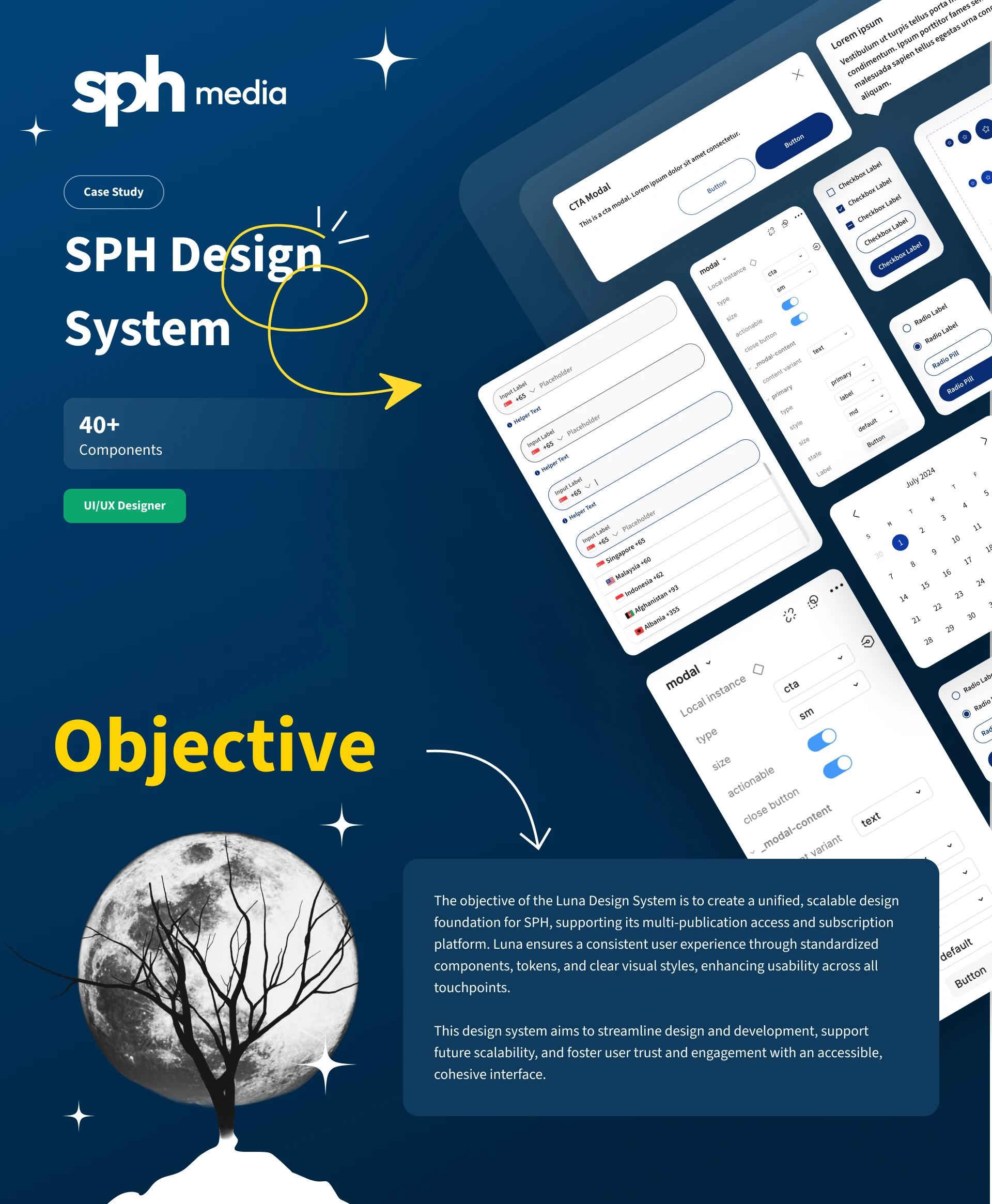 The objective of the Luna Design System is to create a unified, scalable design foundation for SPH, supporting its multi-publication access (15+ Publications) and subscription platform. Luna ensures a consistent user experience through standardized components, tokens, and clear visual styles, enhancing usability across all touchpoints. This design system aims to streamline design and development, support future scalability, and foster user trust and engagement with an accessible, cohesive interface.