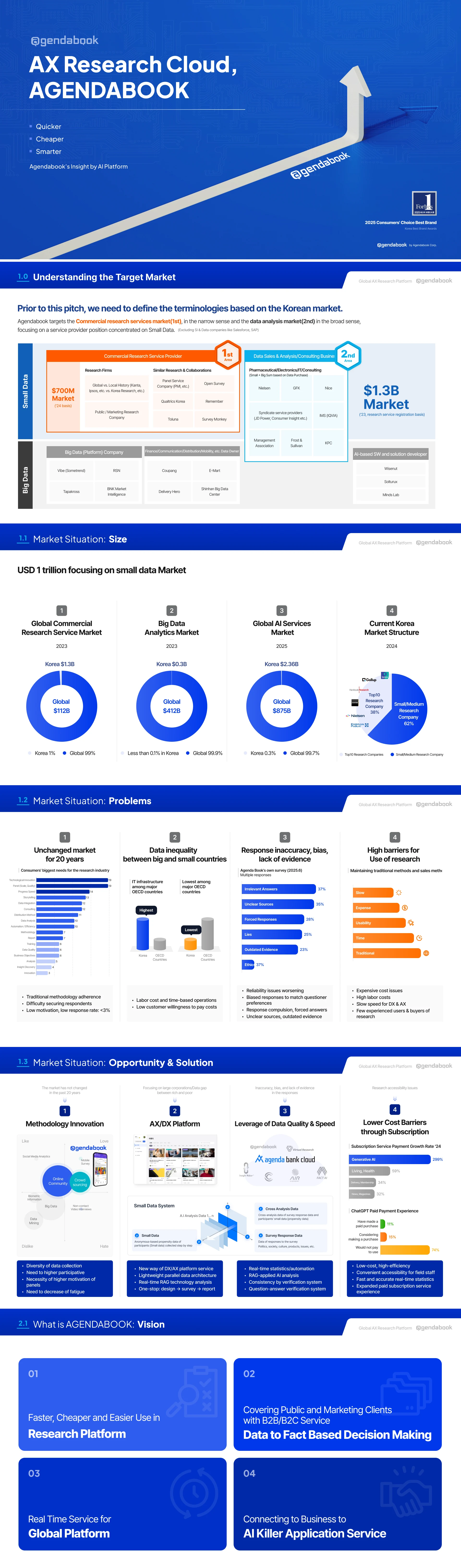 Designed Agendabook’s investment pitch deck, emphasizing brand identity and highly readable compression of dense content.