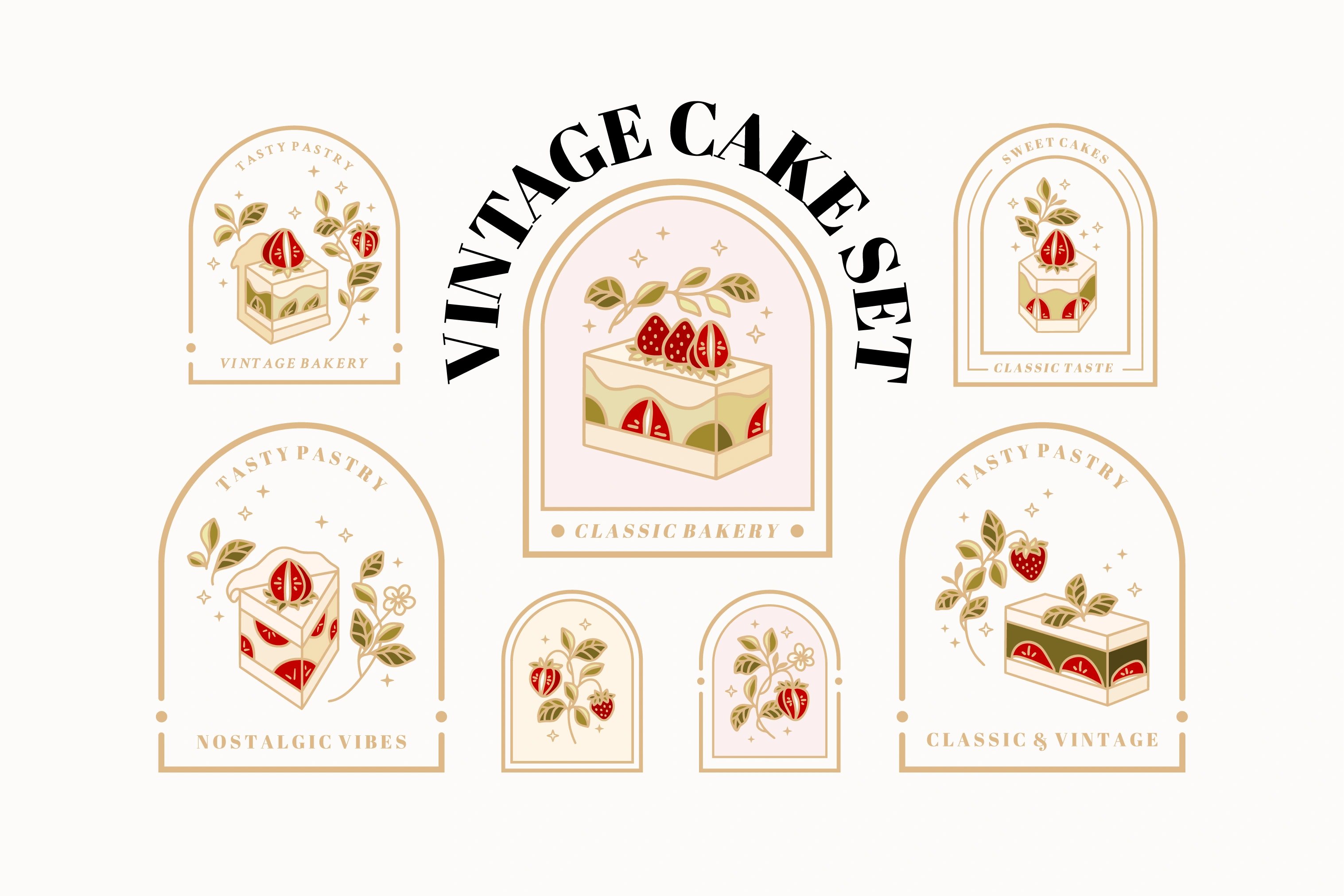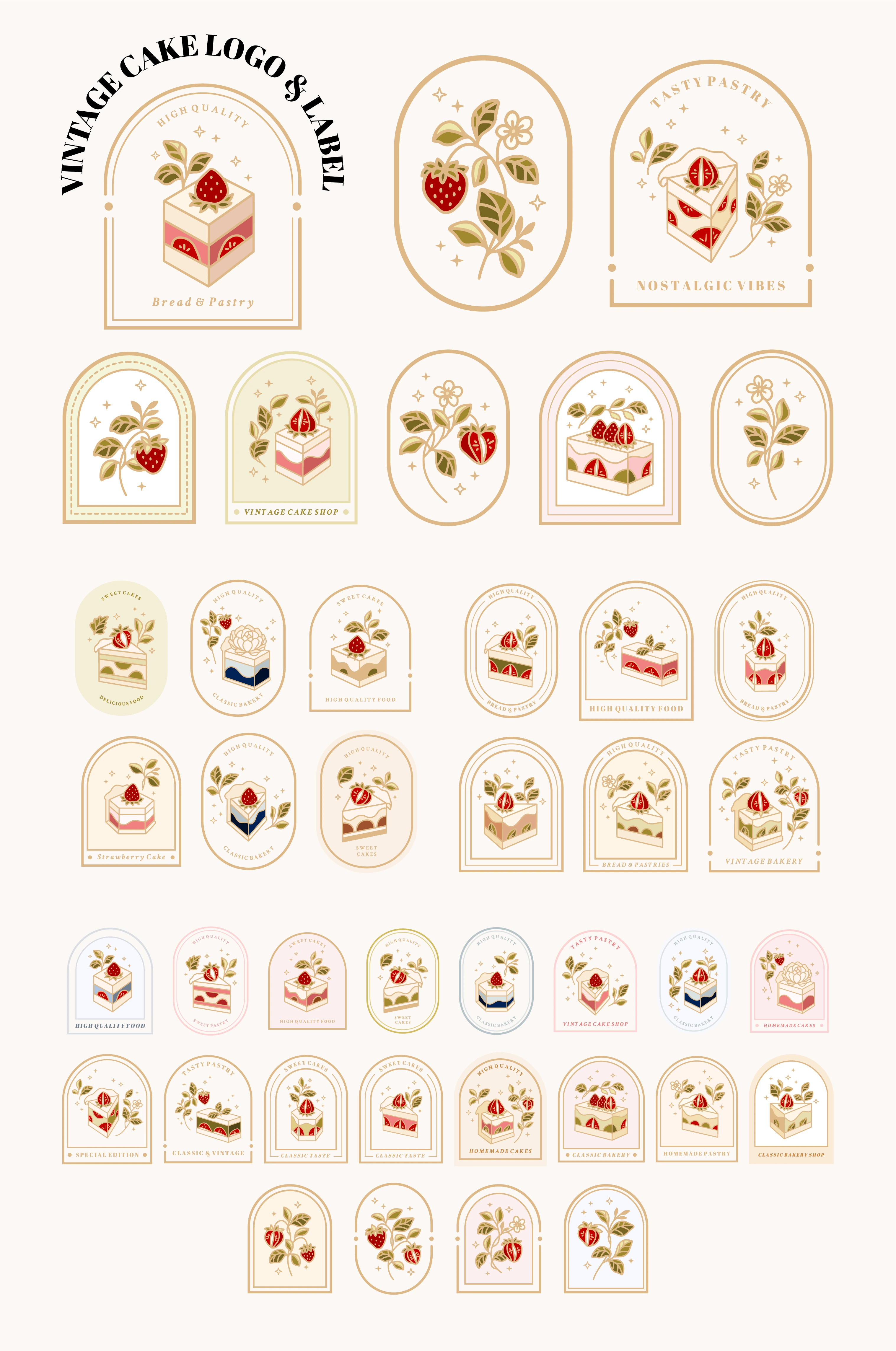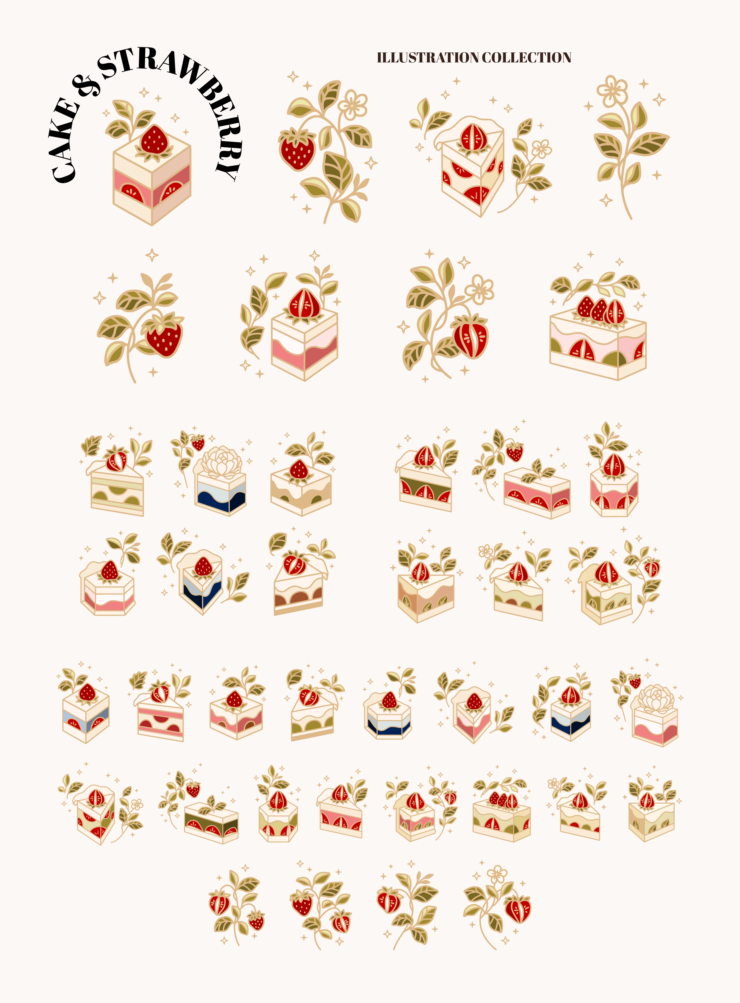 A large set of vintage cake designs with strawberry and floral elements. These elements are suitable for clip art, stickers, food label, branding, logo, etc.