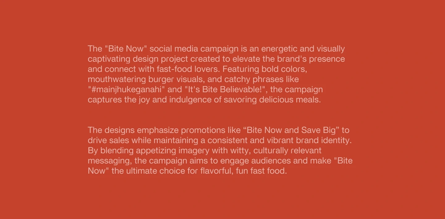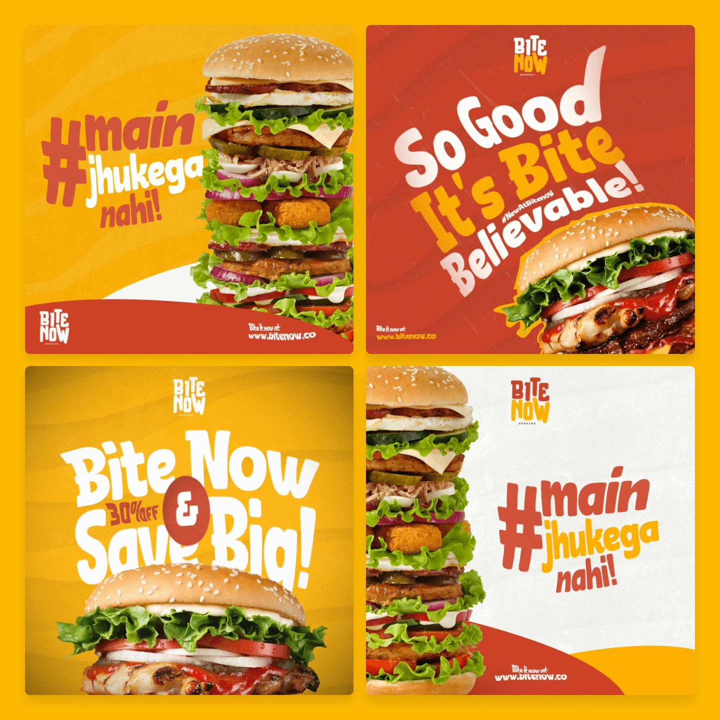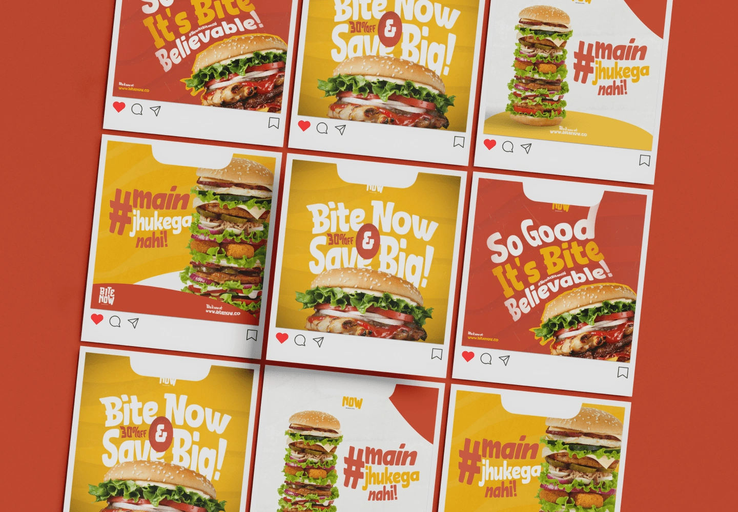 designed a bold and energetic social media ad campaign for Bite Now, focused on grabbing attention instantly & driving fast food cravings with creative visuals.
