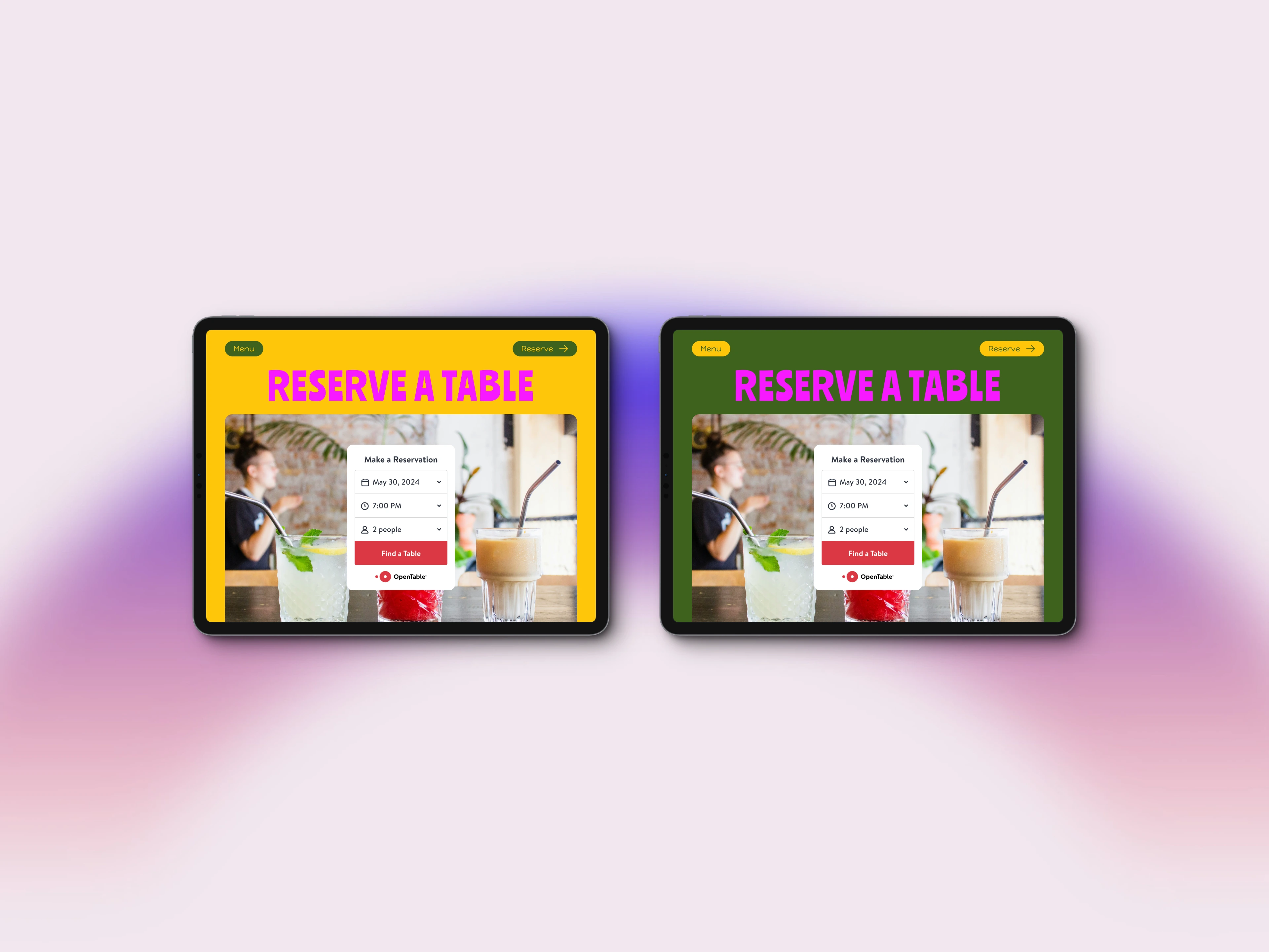 Art direction and branding for multi-page restaurant template rework with dynamic CMS content, automatic dark and light color themes, and OpenTable widget.