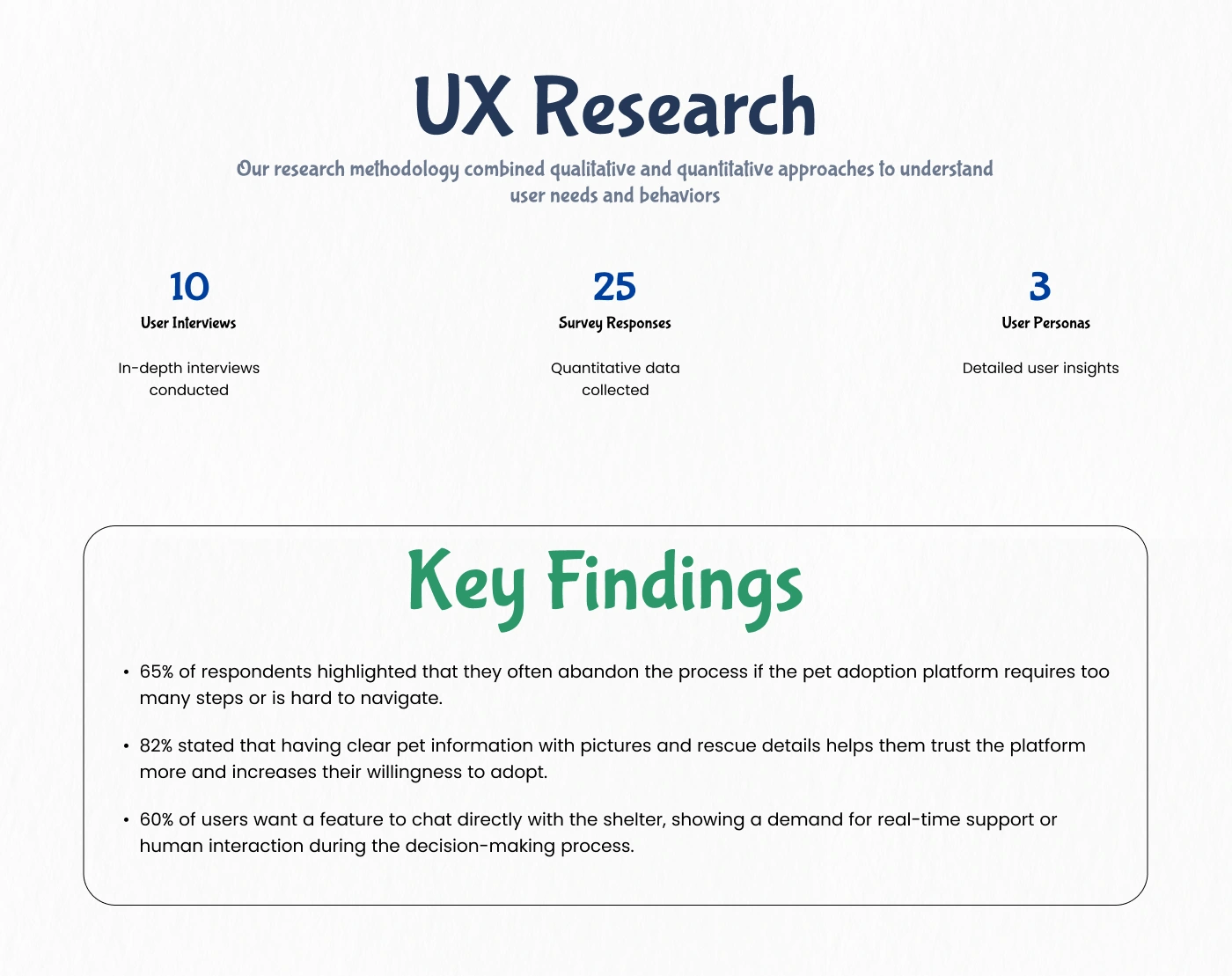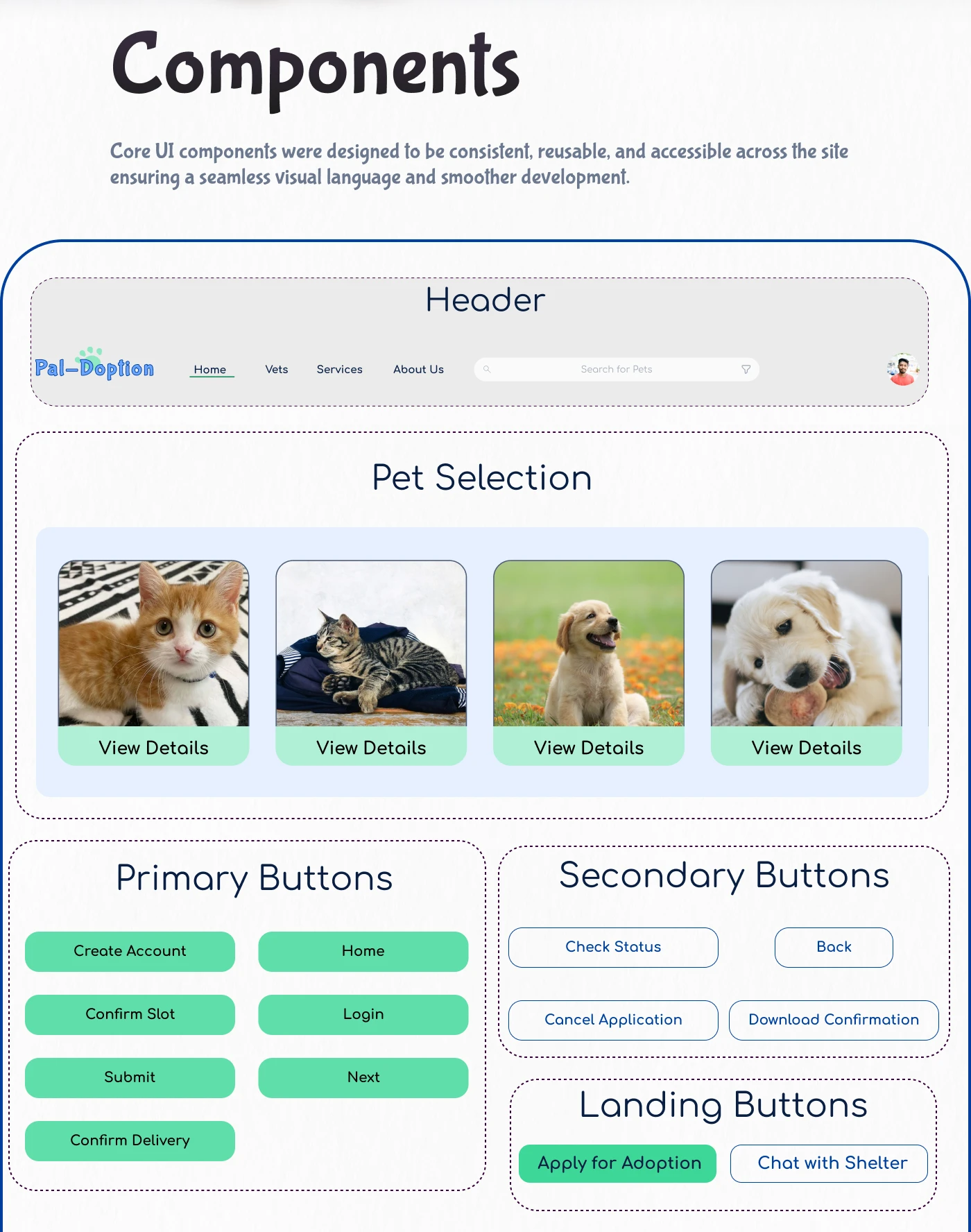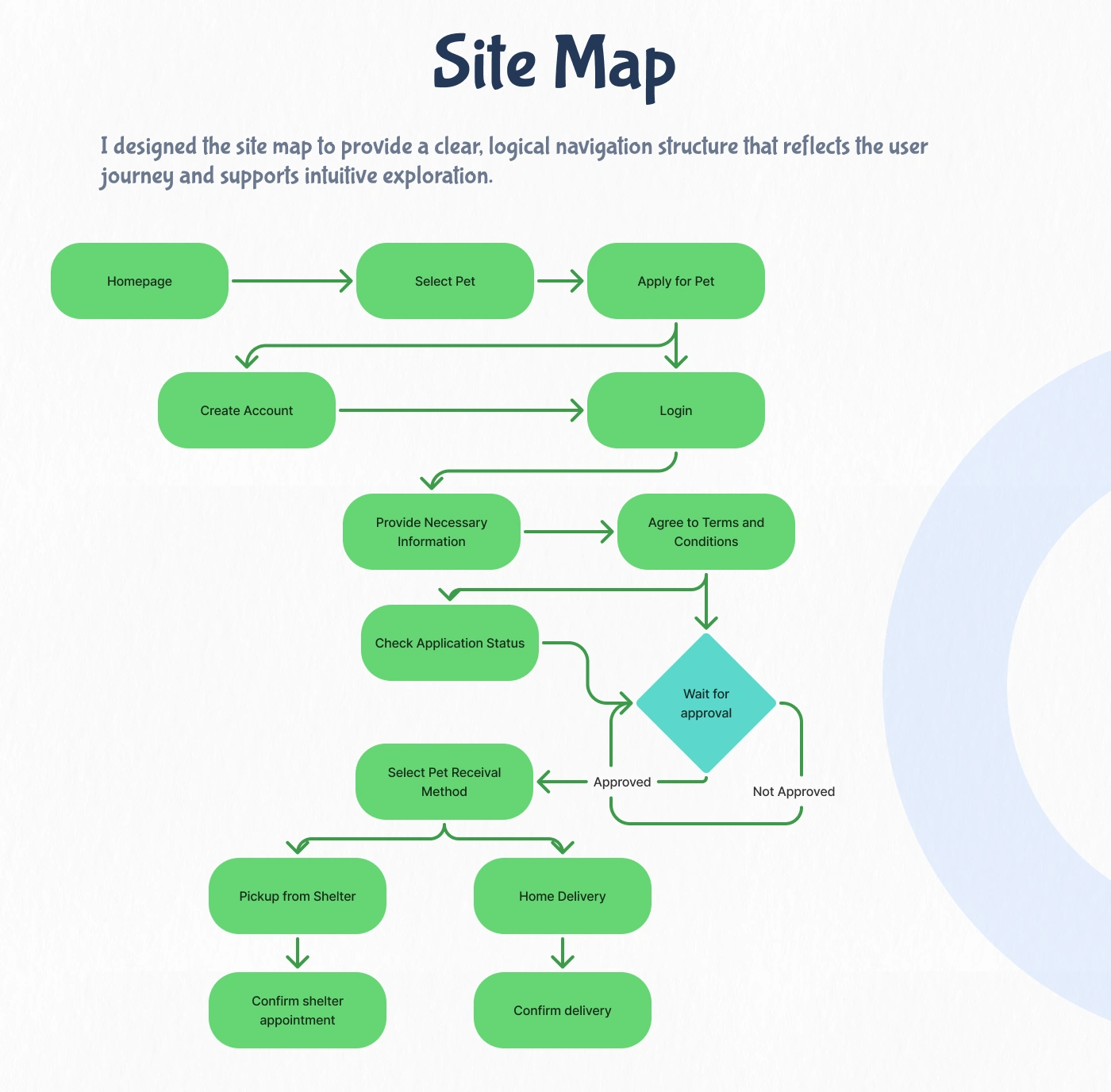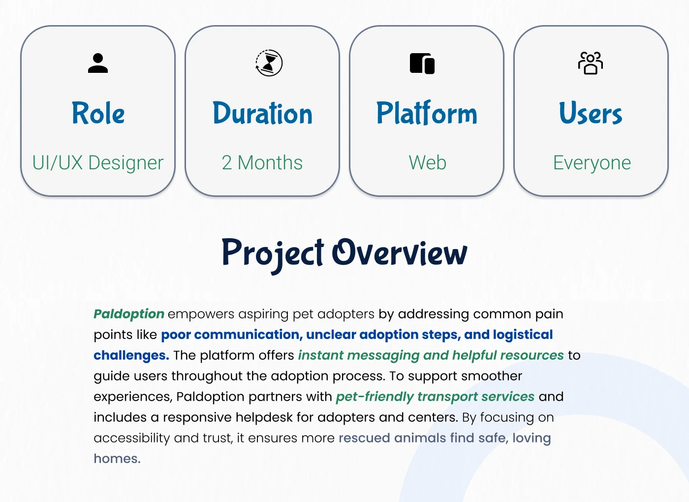 Designed a responsive pet adoption web app with improved navigation, accessible UI, and a streamlined adoption process for a smoother user experience.