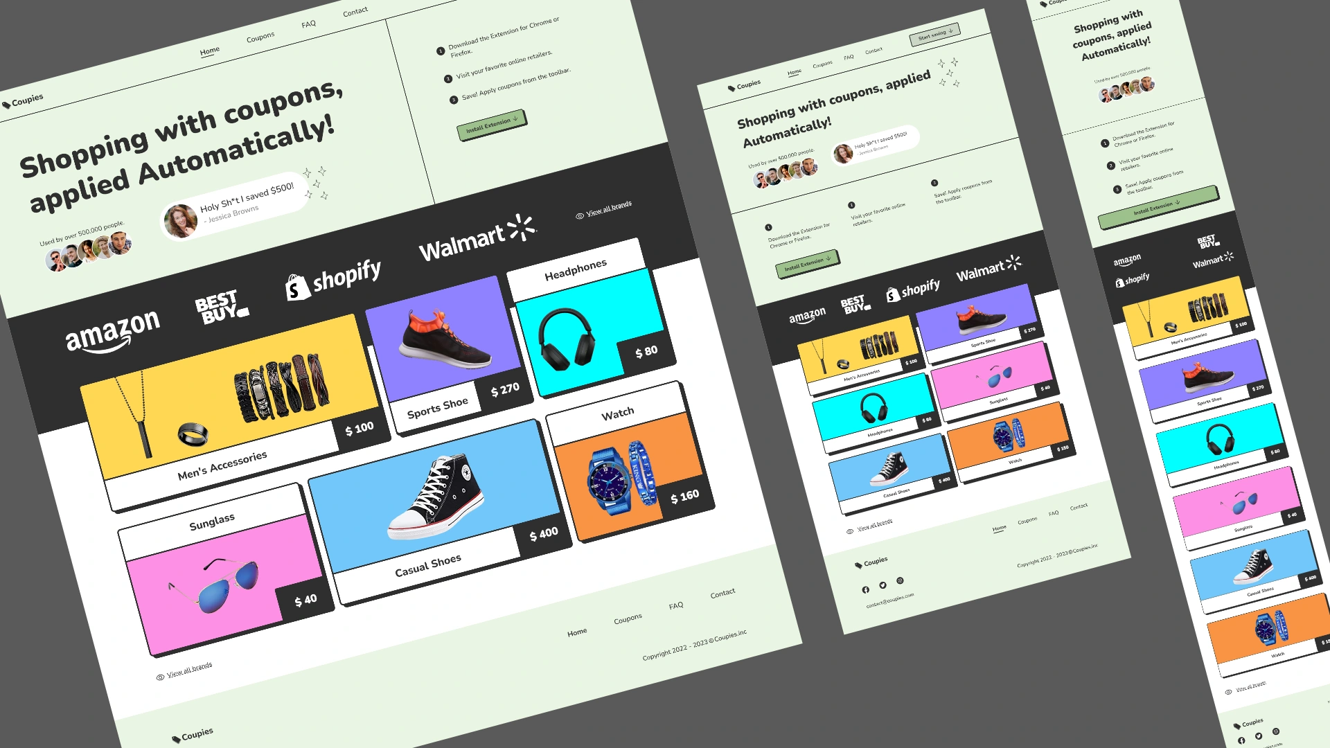 Shopping interface design for a coupon platform, focused on automatically applying deals, clear product cards, and a smooth, user-friendly browsing experience.