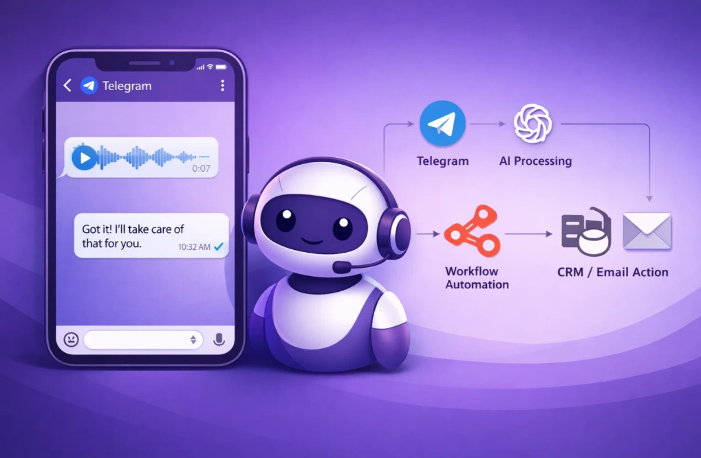 The assistant understands both text and voice messages, extracts key details, updates CRM records automatically, and triggers email follow-ups — all without leaving Telegram.
