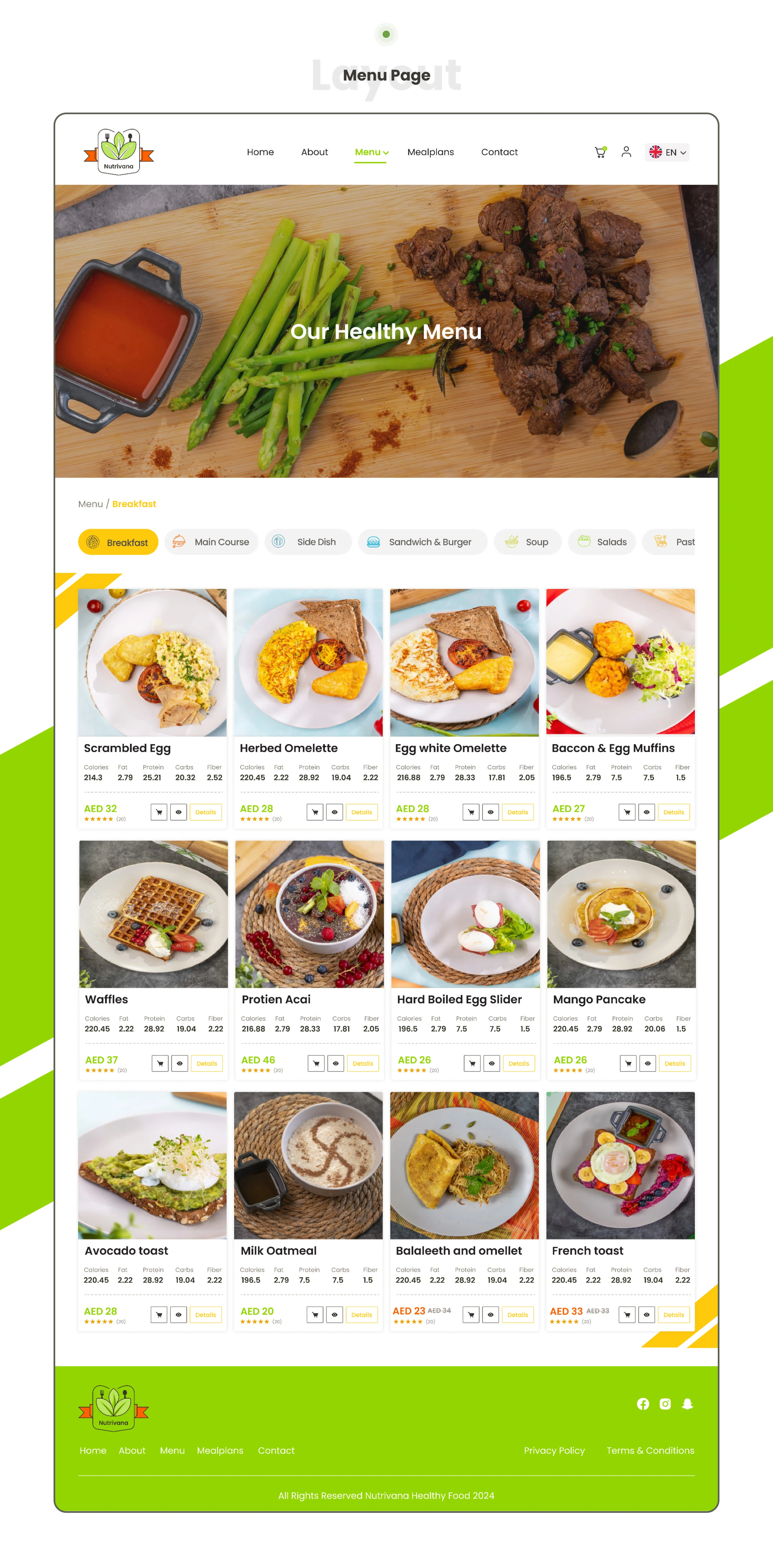 Curated Healthy Menu – A diverse range of nutrient-packed dishes catering to dietary preferences like vegan, keto, and gluten-free, available for dine-in, takeout, and delivery.