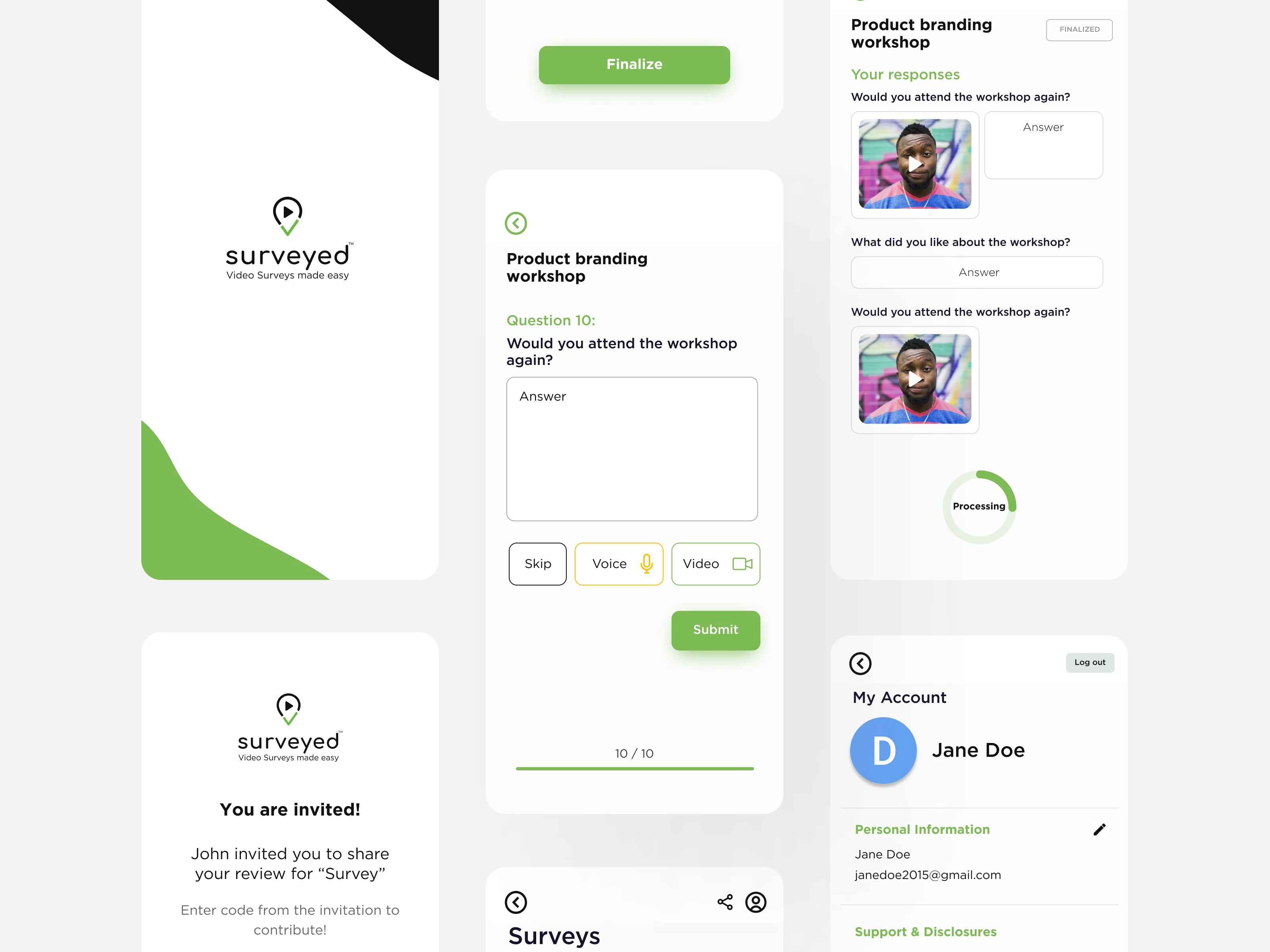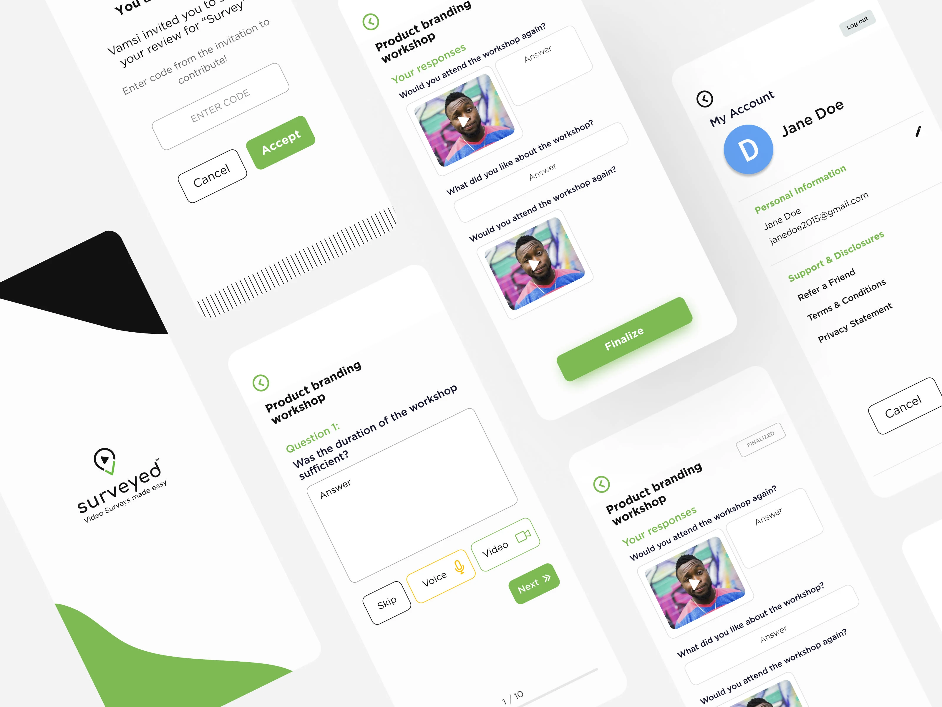 With a video based survey service being the primary focus, the app was designed for both iOS & Android. Alongside the app, the website was also kept in mind to match the interface of the app in terms of visuals and user interface. The website design includes a main landing page as well as an admin page, which gives an overview of the existing surveys.