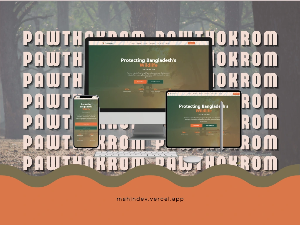 Pawthokrom is a heartfelt charity website built to support the welfare of endangered and stray animals in Bangladesh. Created entirely pro bono.