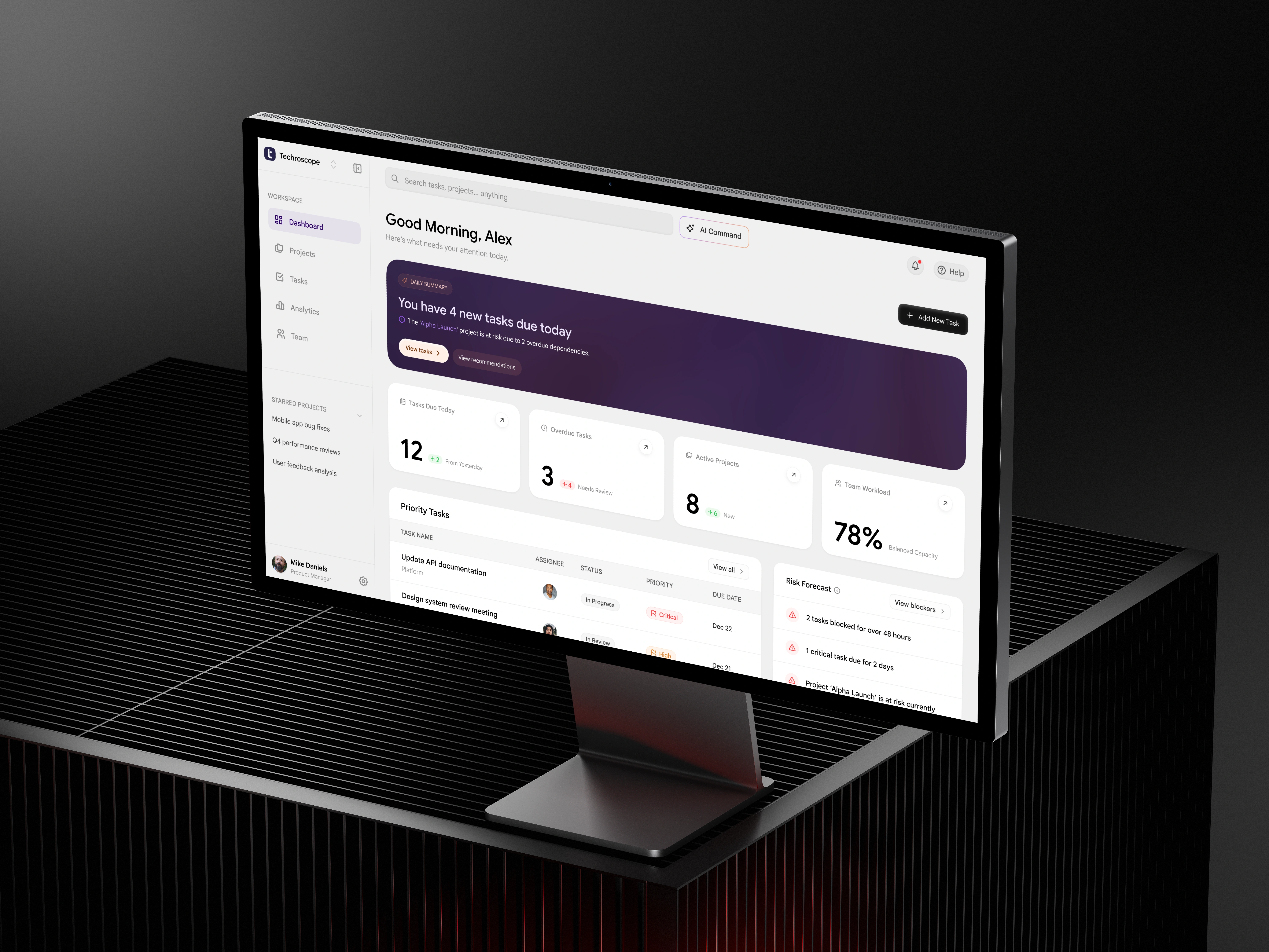 Managers waste time scanning dashboards, opening multiple views, and manually interpreting task lists, reports, and workload distribution. Existing tools surface information, but they do not provide clarity or prioritization, especially under time pressure.