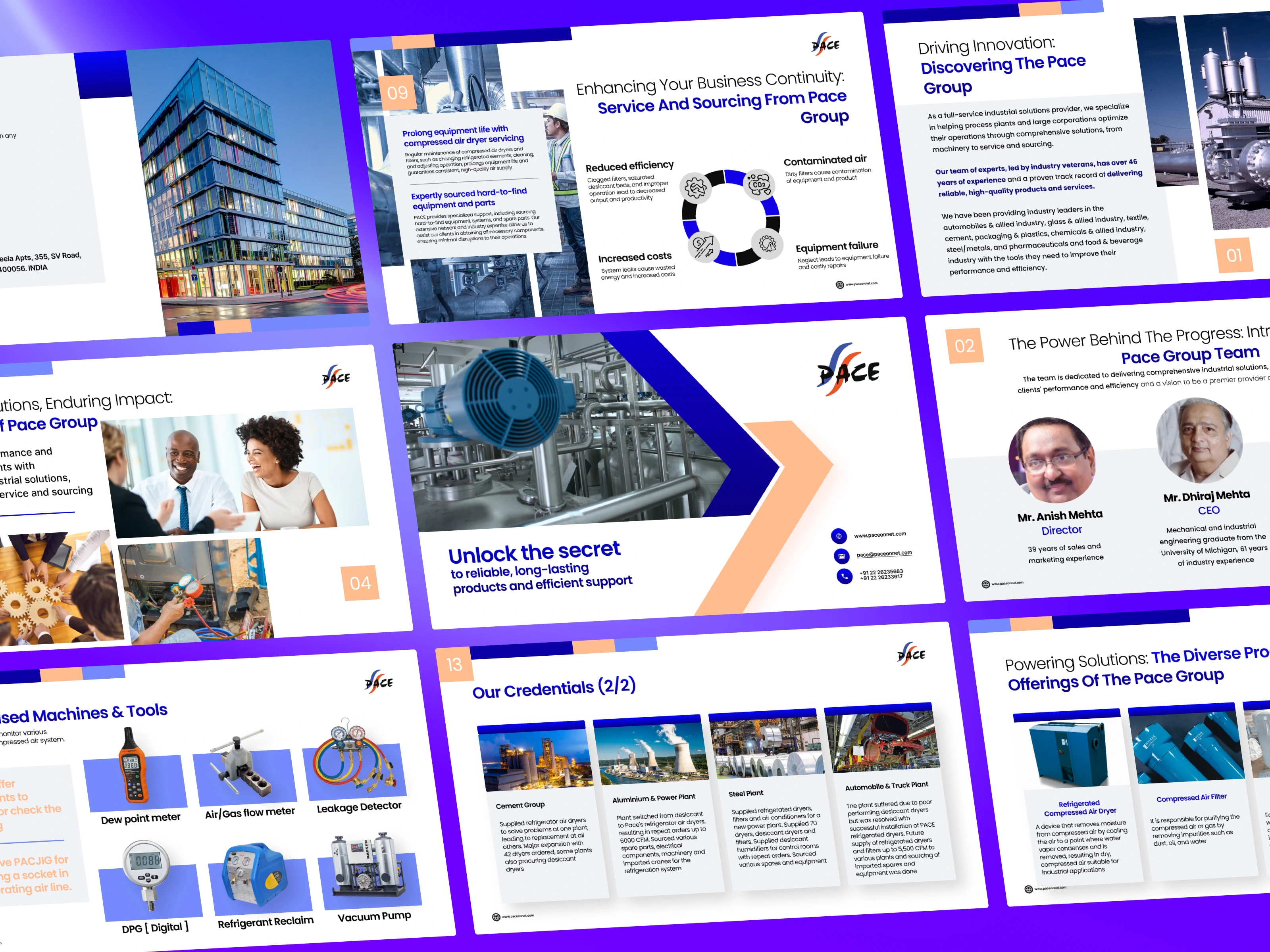 I redesigned PaceOnNet’s company profile to clearly articulate their capabilities across compressed-air systems, industrial equipment, turnkey installations, and maintenance services. Through a detailed audit of existing materials and discussions with technical and operations teams, I transformed complex product specifications and service workflows into a cohesive, business-ready narrative. The new deck highlights credibility markers such as industry experience, solution reliability, technical expertise, and long-term client support. I also established a unified visual and content structure that strengthens brand perception and positions PaceOnNet as a dependable, full-spectrum industrial solutions partner.