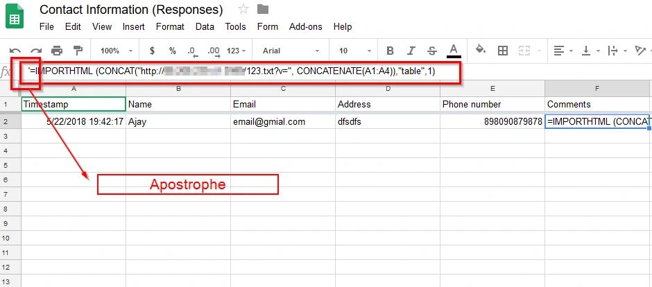 Google provide functionality to create forms and receive responses, which later can be accessed using Google sheets. We attempted to exploit this issue by submitting a malicious formula in the comments section of the respective Google form. However, Google was performing sanity checks on responses submitted and it automatically added an (‘) apostrophe before the formula, thus stopping the formula from executing.