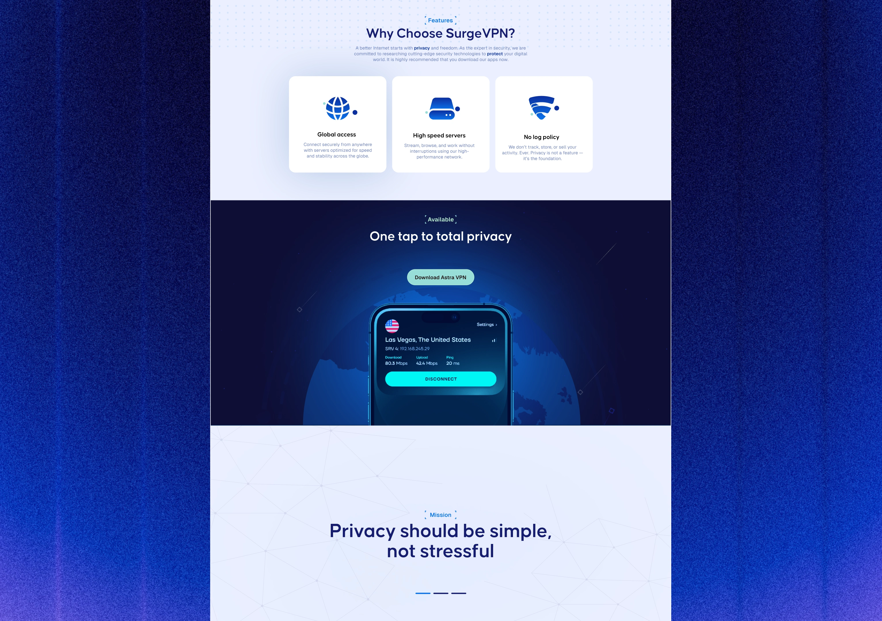 Context: SurgeVPN had a functional app but limited visibility on the Play Store, with only a few thousand ratings. The landing page and app screenshots didn’t fully communicate the app’s value or drive conversions. The client wanted a modern, intuitive design to attract more users and boost downloads.