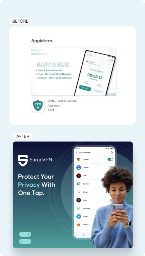 Between 2024 and 2025, SurgeVPN’s Play Store downloads jumped from a few thousand to over 5M, reflecting strong growth in user acquisition. The redesigned landing page and app screenshots played a key role in boosting visibility, engagement, and conversions.