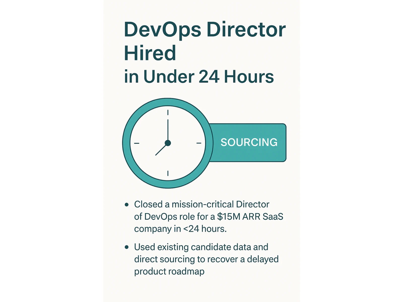 Hired a DevOps Director in under 24 hours for a $15M ARR SaaS firm. Used sourcing + pipeline data to recover a delayed product roadmap.