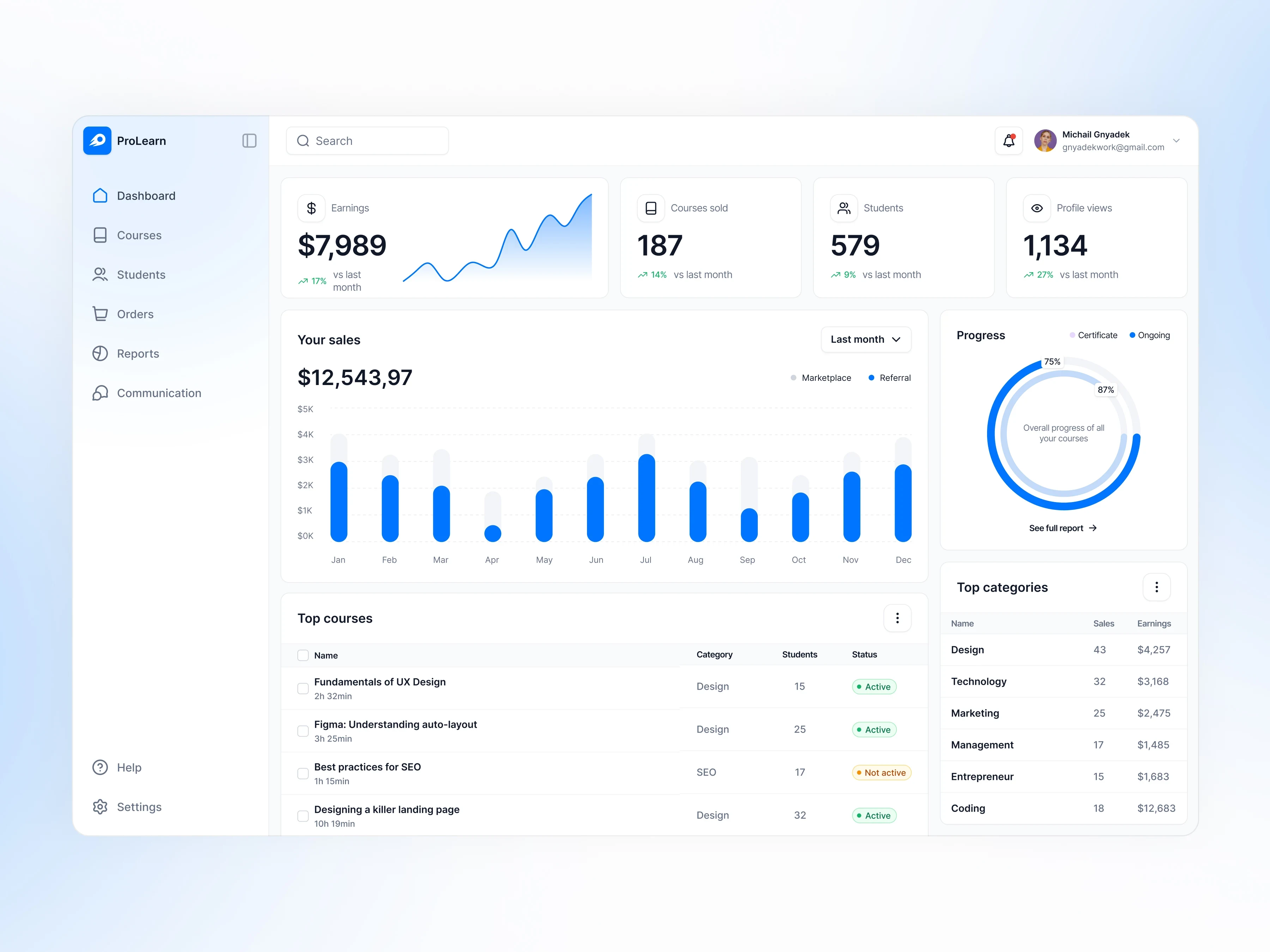 The interface uses a soft gradient background, structured content blocks, and an intuitive sidebar navigation to help users quickly move between courses, orders, reports, and communication tools. Detailed analytics — including monthly sales, top-performing categories, and course statistics — allow instructors to make informed decisions and improve student engagement.