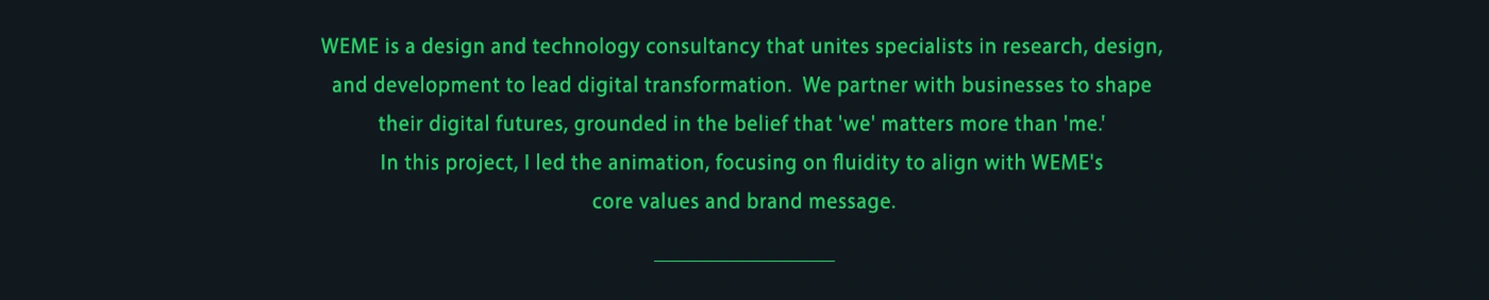 Led animation for WEME, crafting fluid visuals that reflect their collaborative values and mission to drive digital transformation through design and tech.