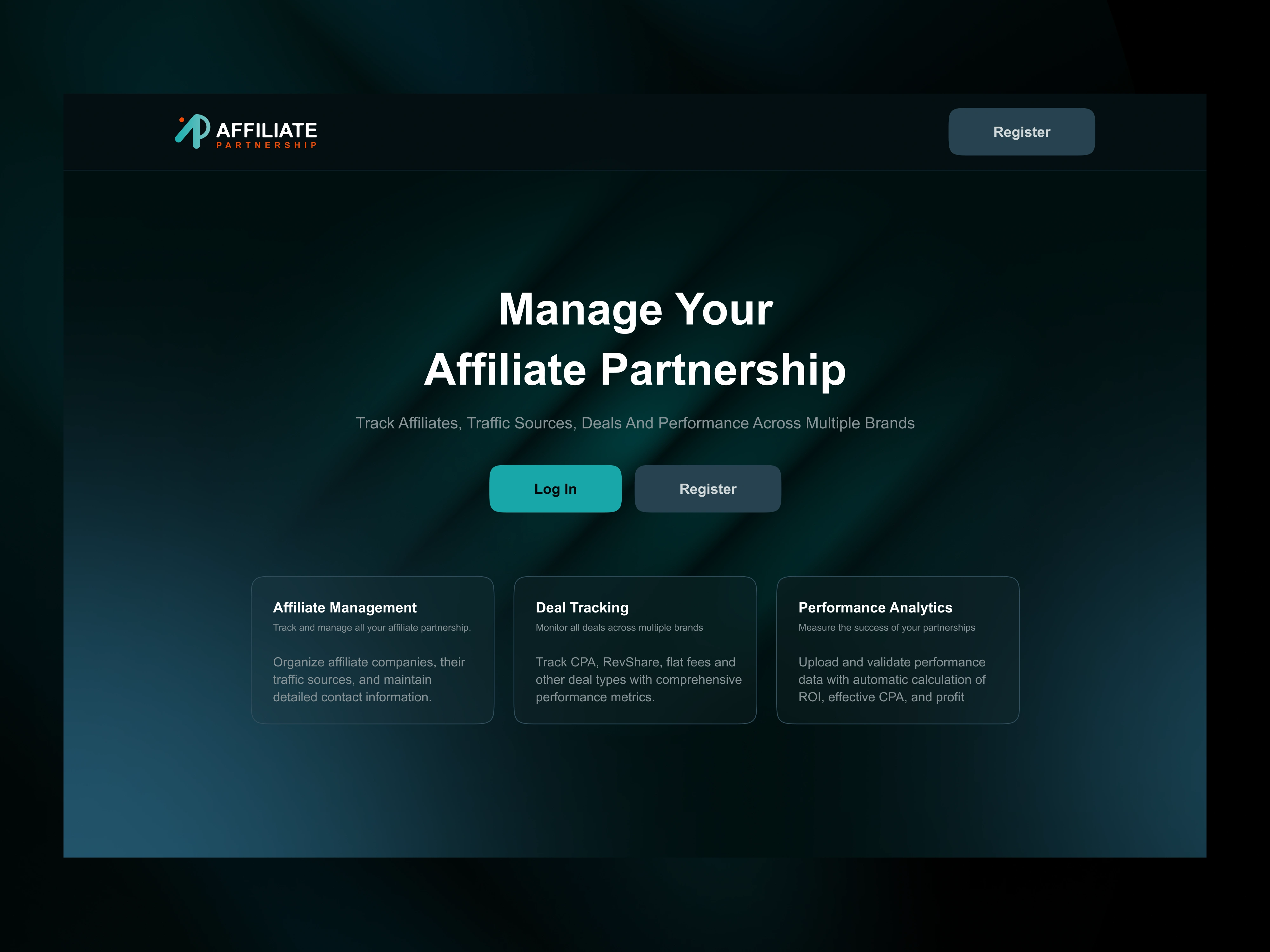 This website’s top section helps users manage affiliate deals easily. It shows clear buttons to log in or register and explains features like tracking partners, deals, and earnings. The design is modern, with a dark background and simple layout. ✨