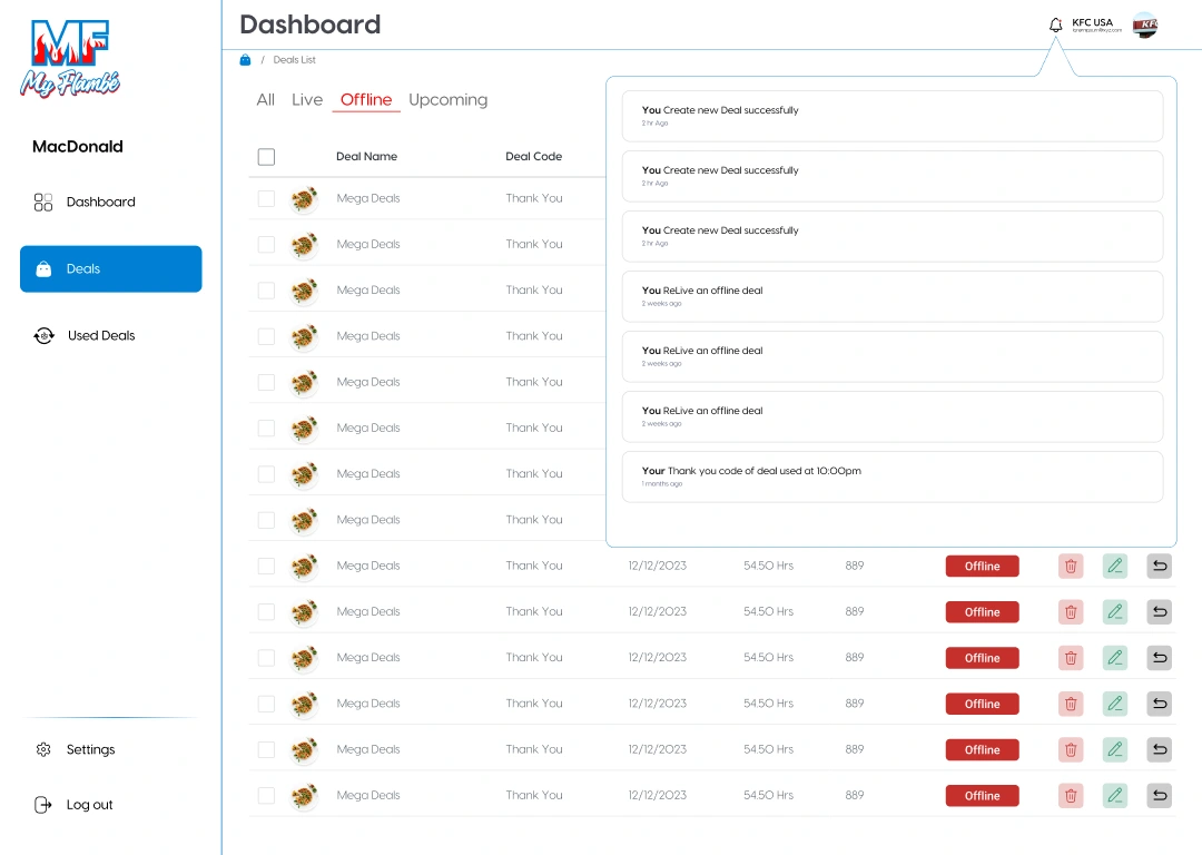 Flambe by Selim is a comprehensive dashboard and analytics platform designed to help restaurant managers and business owners track key metrics, monitor deals, and view system notifications in real time. Built with a modular structure and optimized visuals, this dashboard enables better decision-making and operational clarity across multiple layers of restaurant performance.