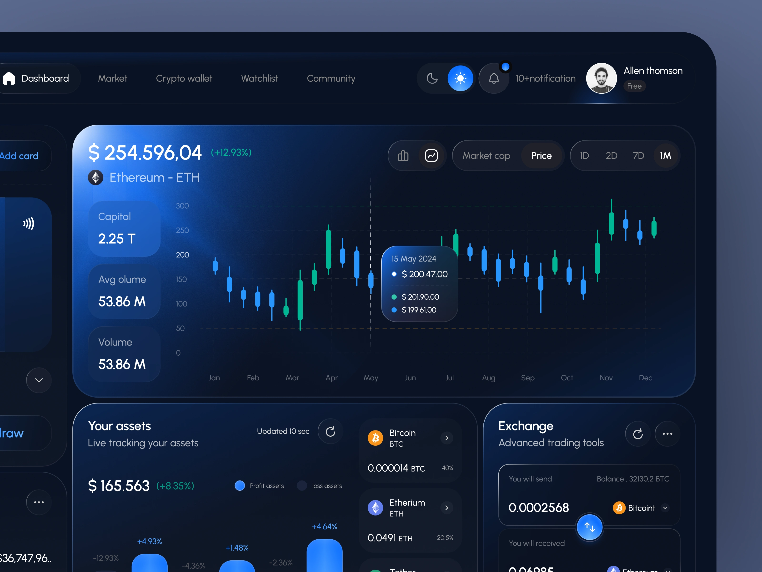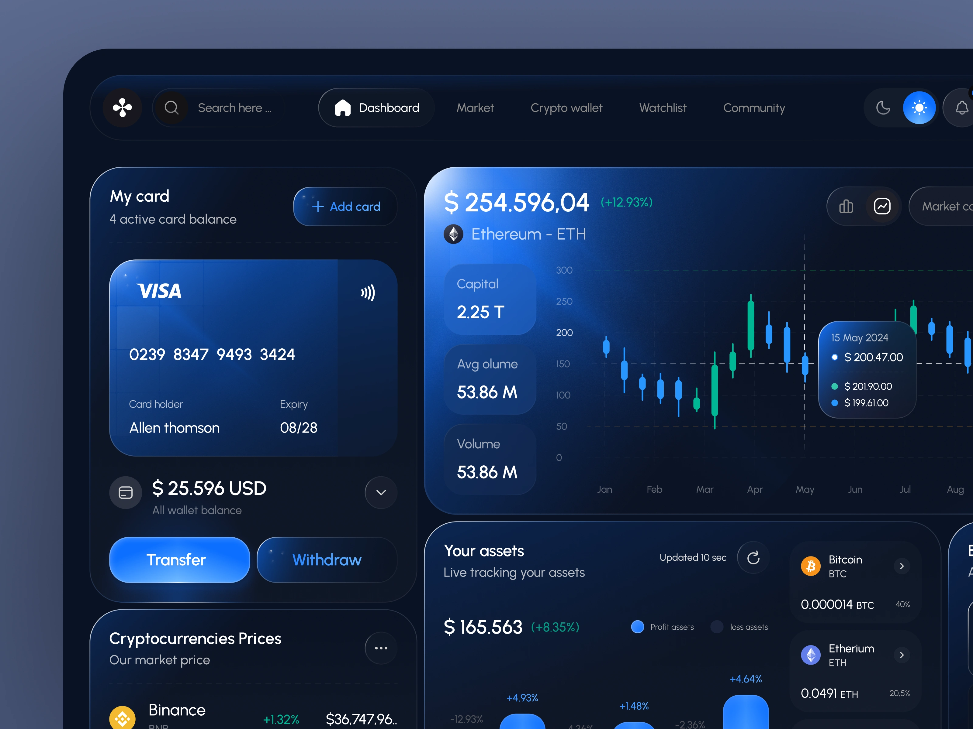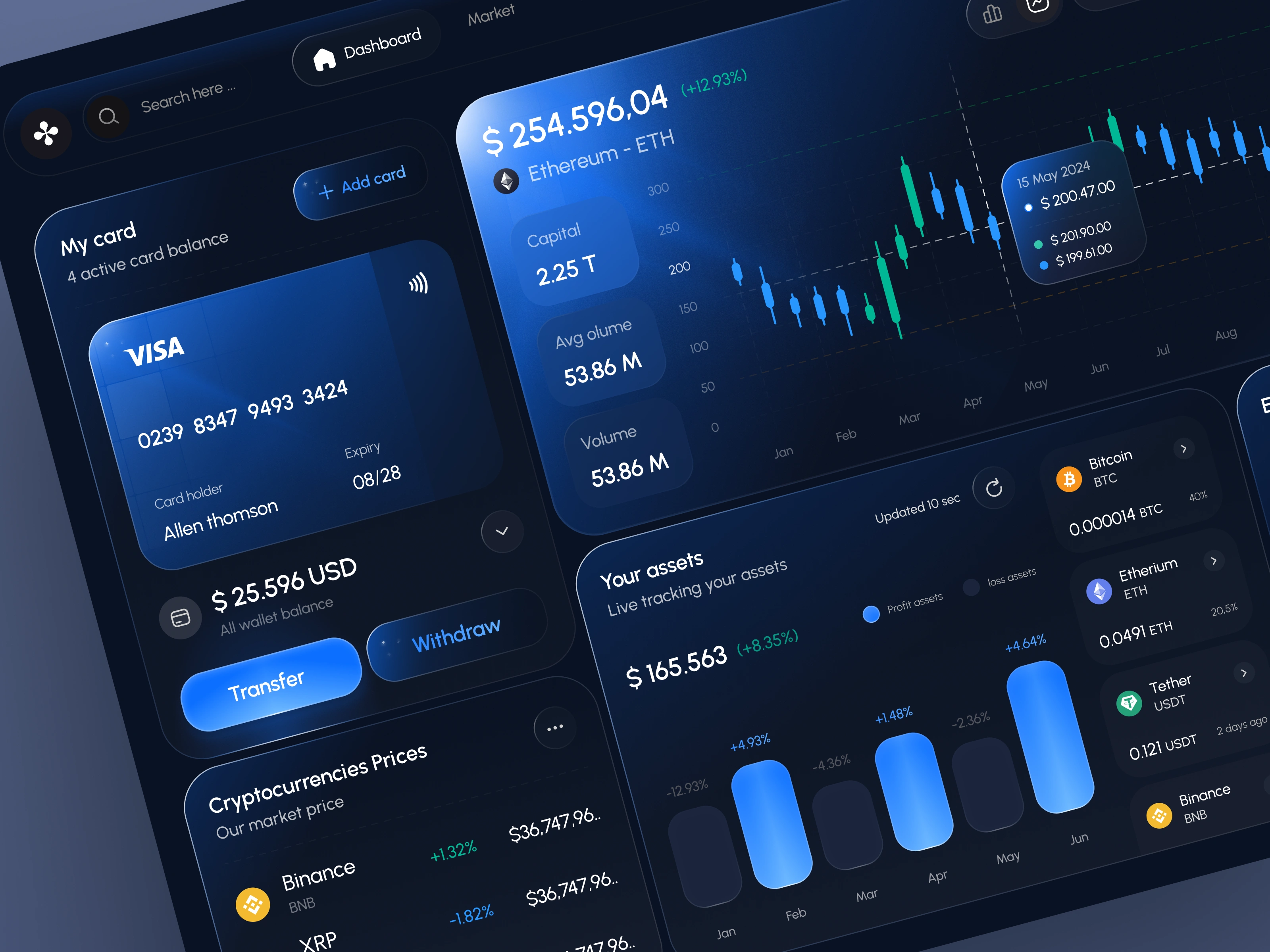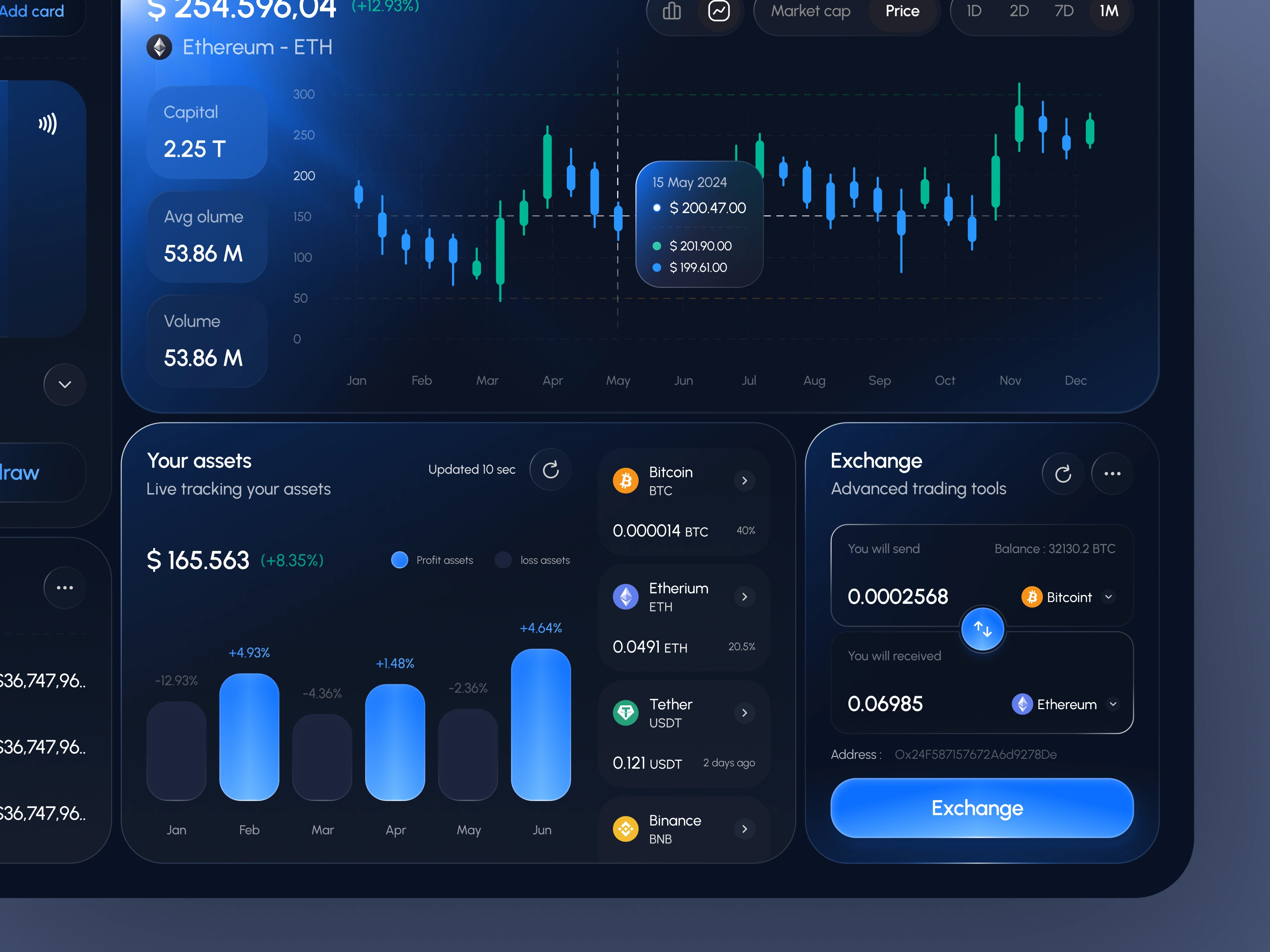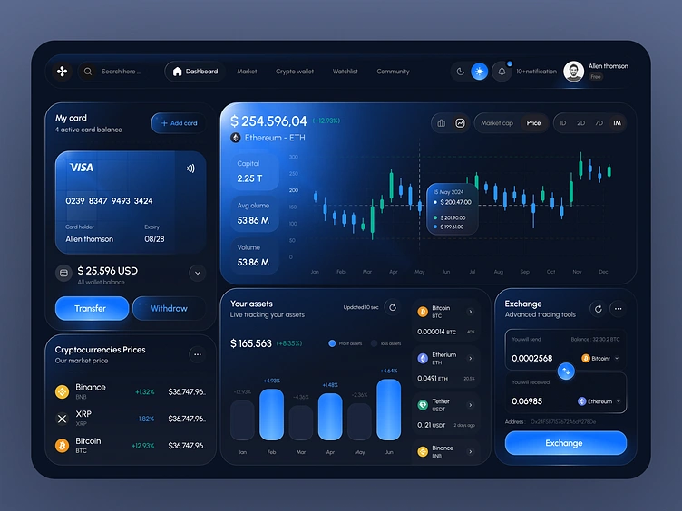 Vault brings the future of cryptocurrency management to life with a visually engaging dashboard. The design prioritizes user experience, providing a seamless interface for monitoring market fluctuations, asset performance, exchange coints, and transaction history. The dashboard’s clean layout, combined with interactive elements, enhances user engagement and simplifies complex data visualization.