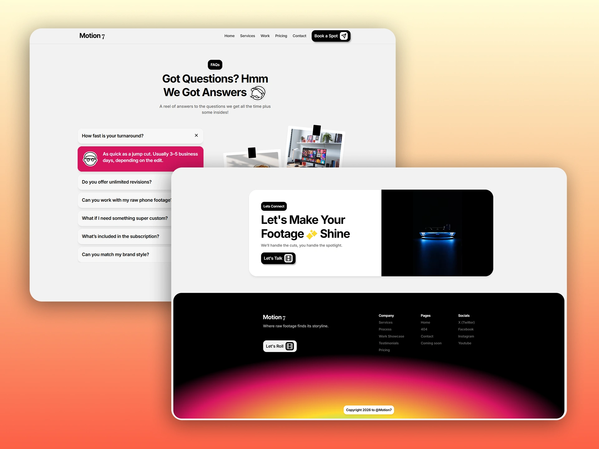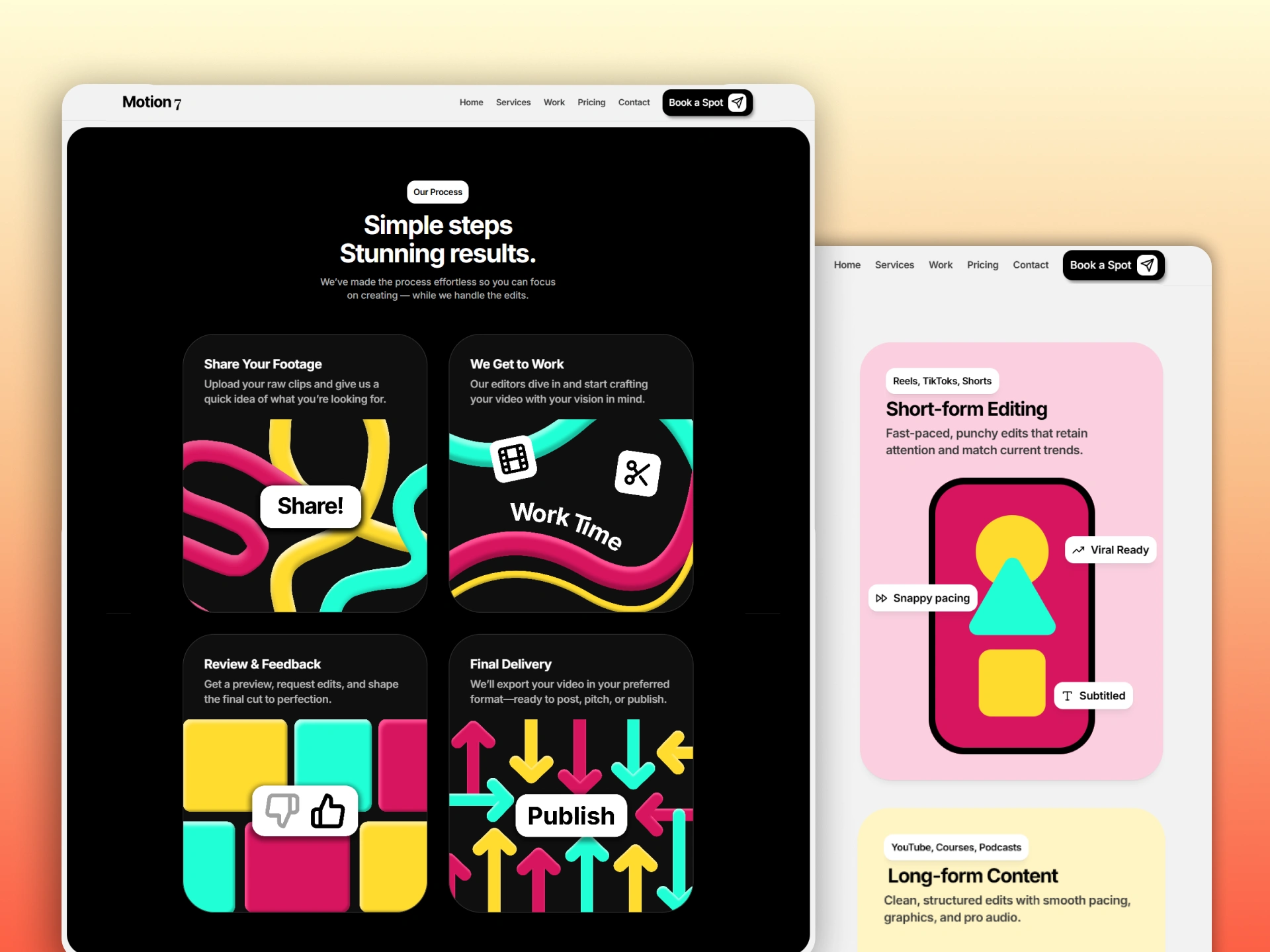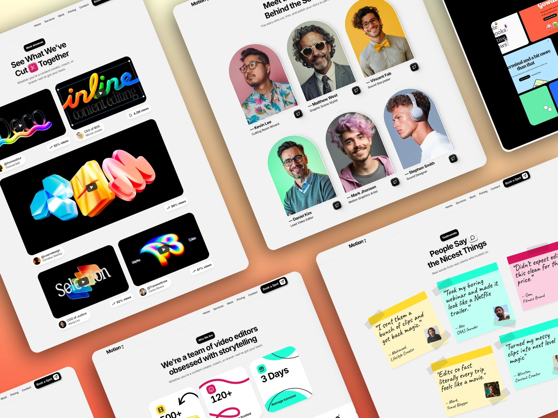 I designed Motion7 as a vibrant, motion-inspired template with playful layouts, bold typography, and unique sections like a bento “What Makes Us Different” grid, case studies, pricing, testimonials, and team showcases. The idea was to blend fun + professional so editors can showcase their work in a way that feels alive.