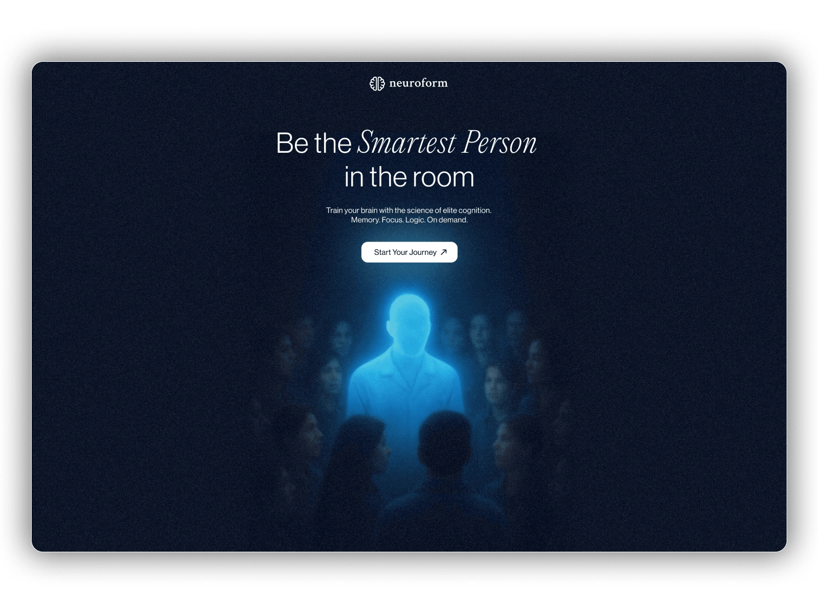 Designed a high-impact, emotionally resonant landing page for Neuroform, a cognition enhancement brand. The visual narrative revolves around the theme of standing out through mental excellence, captured through an ethereal, spotlighted figure surrounded by a blurred crowd.