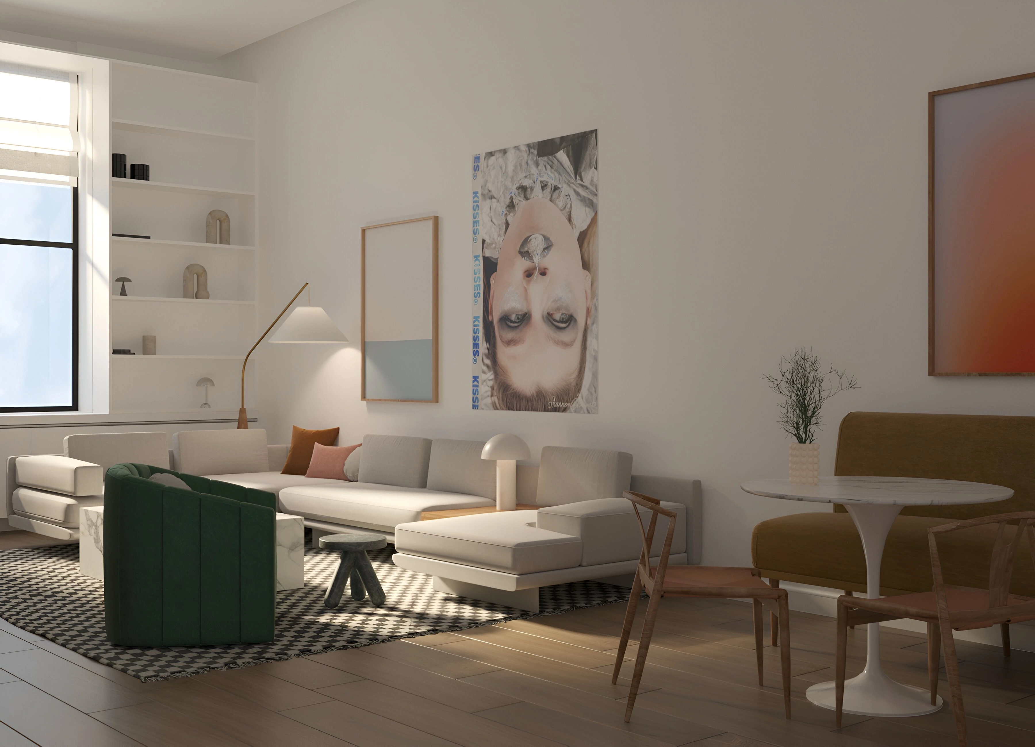Visualize a vibrant and stylish New York apartment designed for short-term rentals — a space that feels both modern and comfortable while reflecting a playful, curated aesthetic.