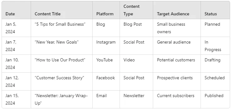 Example Content Calendar: