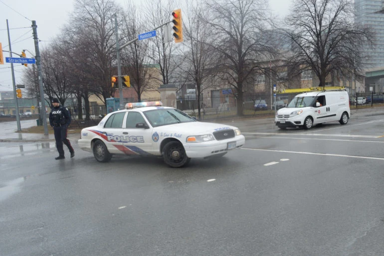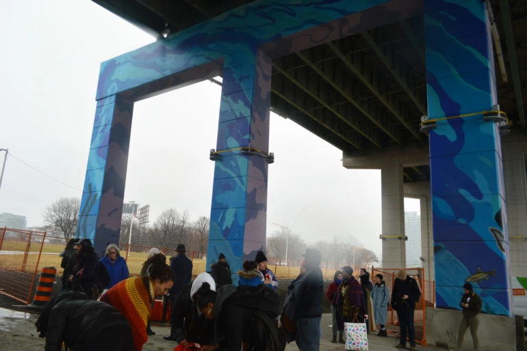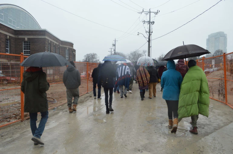 Quiet tears streamed down the cheeks of some faces during a drum circle. Grandmother Pauline Shirt was there as an Elder offering prayers and ceremony. Following a procession from the beneath a Fort York overpass to Coronation Park with the misty Lake Ontario over the horizon. She asked everyone to hold tobacco in their left hand, the hand closest to their heart, to pray, and let the leaves go into the lake. Strawberries and blueberries were offered as part of the tradition too. Toronto Police closed off the intersections along the walk from drivers along Strachan Avenue.