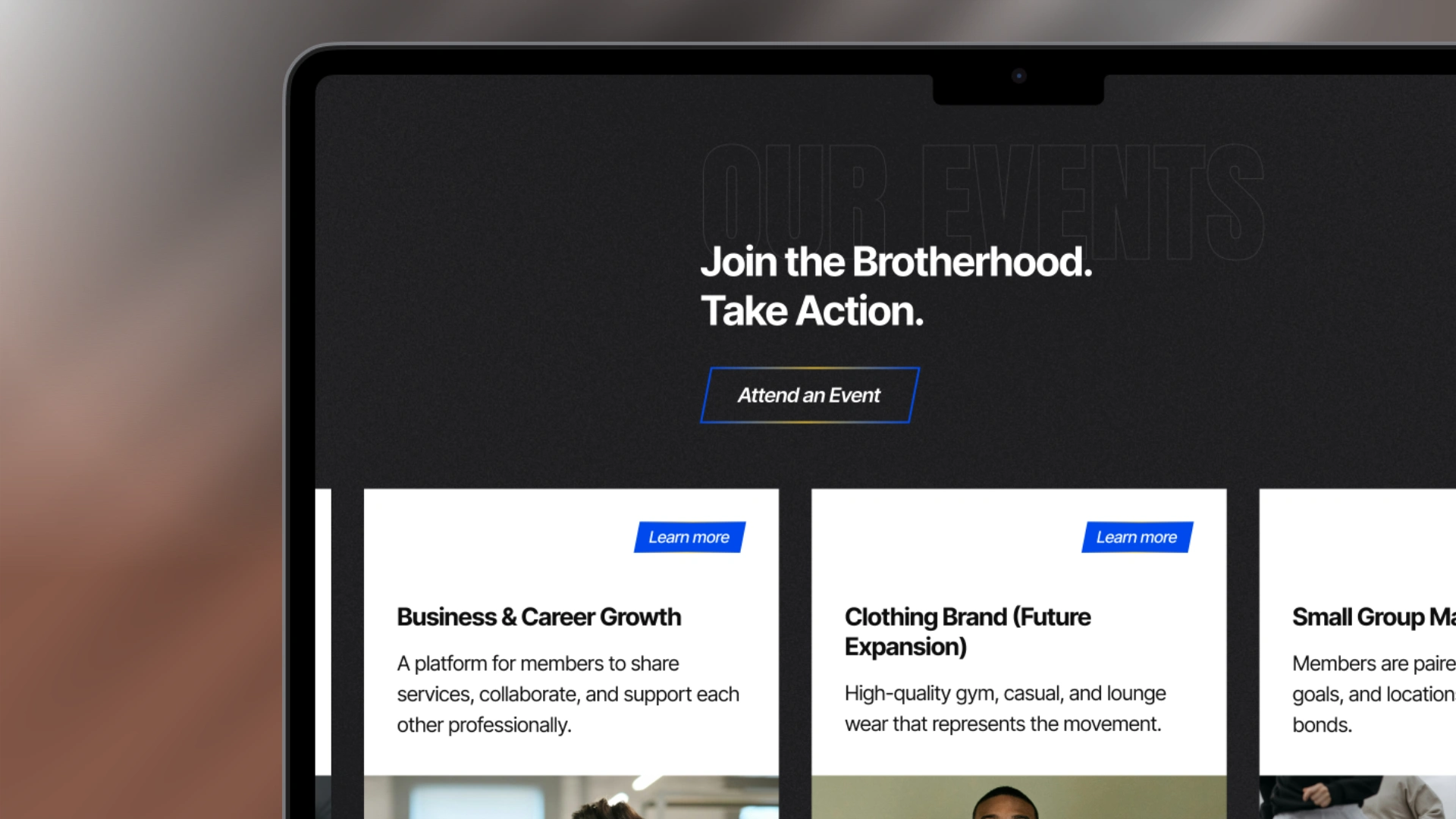 I designed the site to reflect the values of the community, blending striking visuals with structured messaging. The goal was to create a platform that not only informed but also inspired men to connect, engage, and grow within the movement.