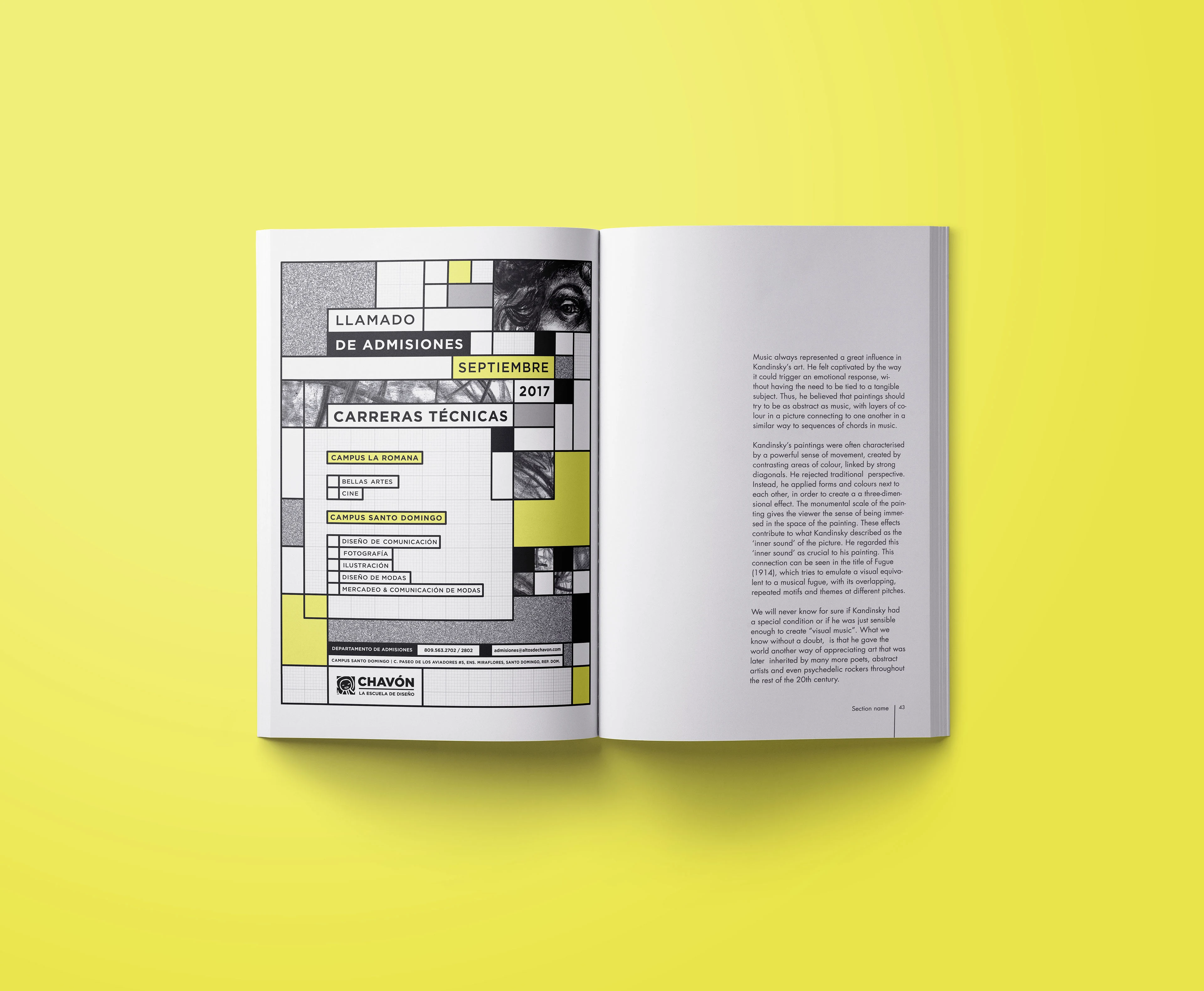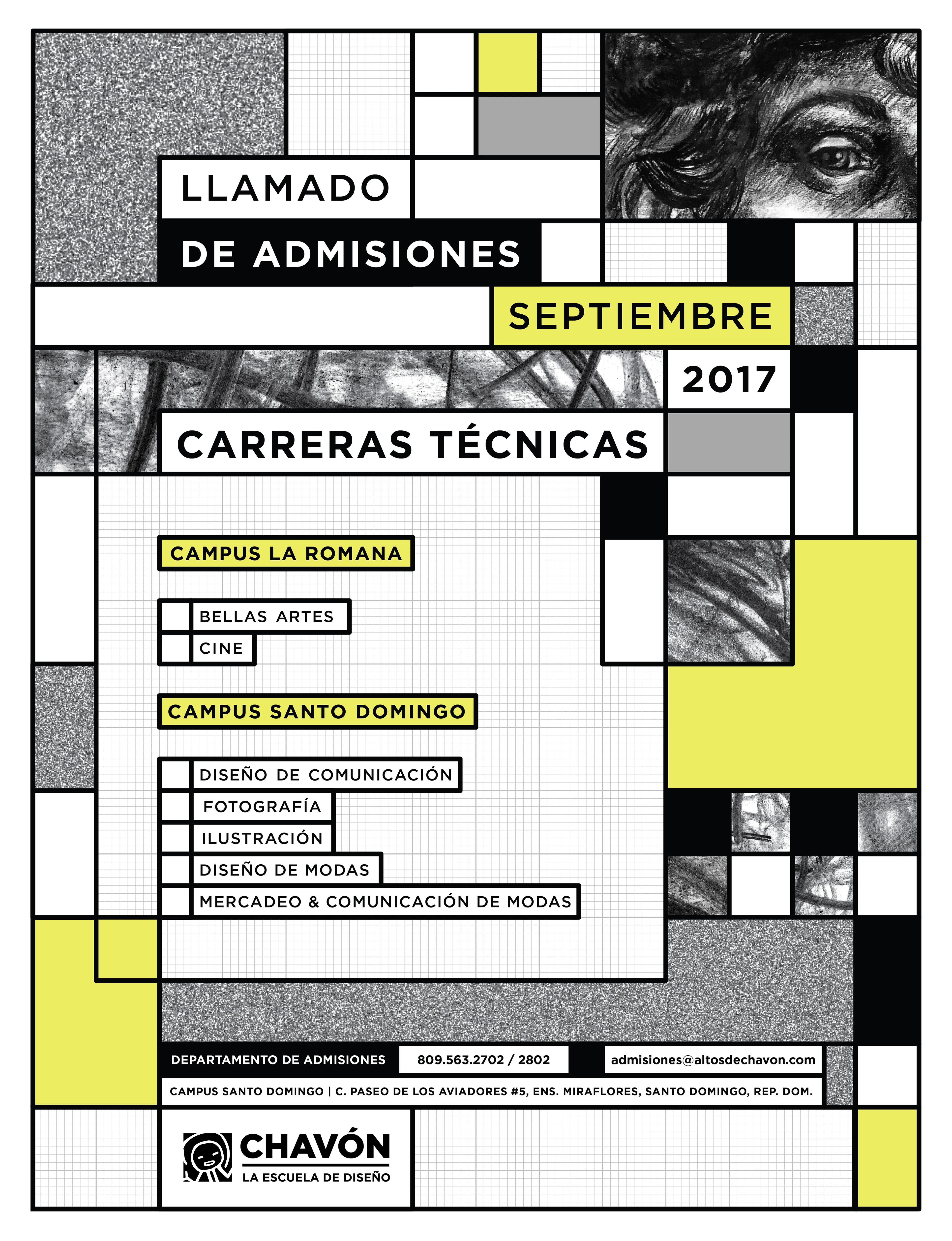 I was asked to design a campaign to advertise Chavón’s college level programs across various platforms. Since it is the only school completely specialized in Design in the Dominican Republic, it was a requirement to look different from the rest of the ads placed by other local superior education institutions. Another communication goal was to transmit the teaching methodology of the school, since it offers a technical learning approach that relies heavily on hands-on practice.