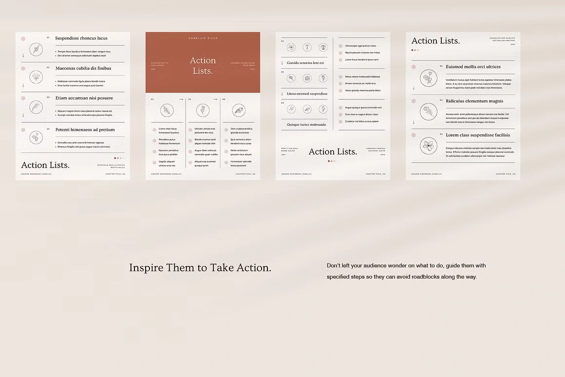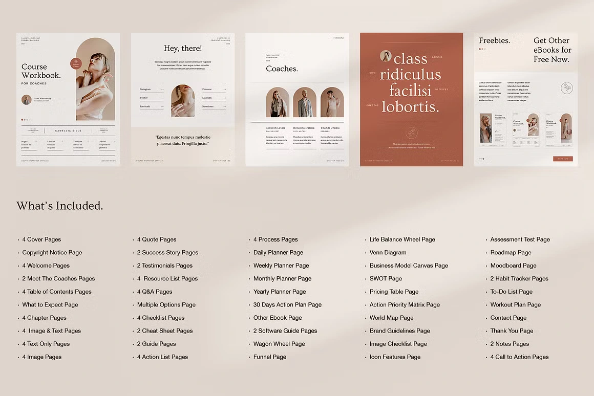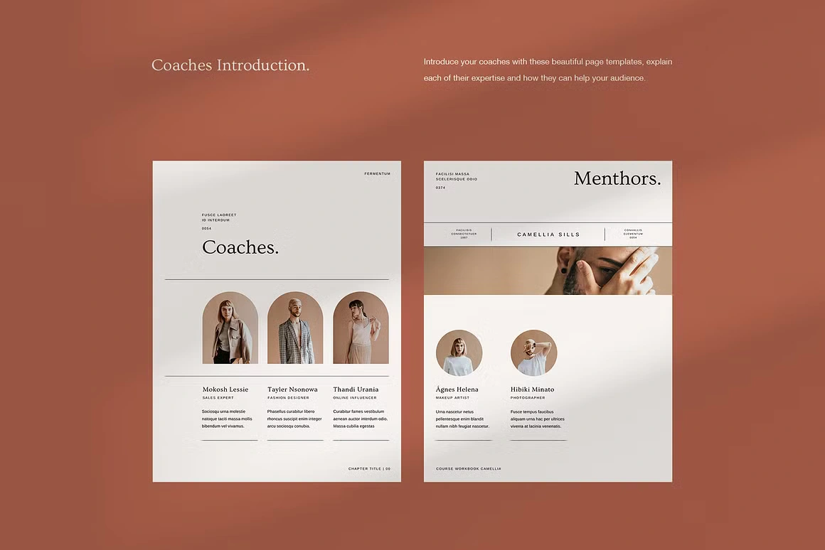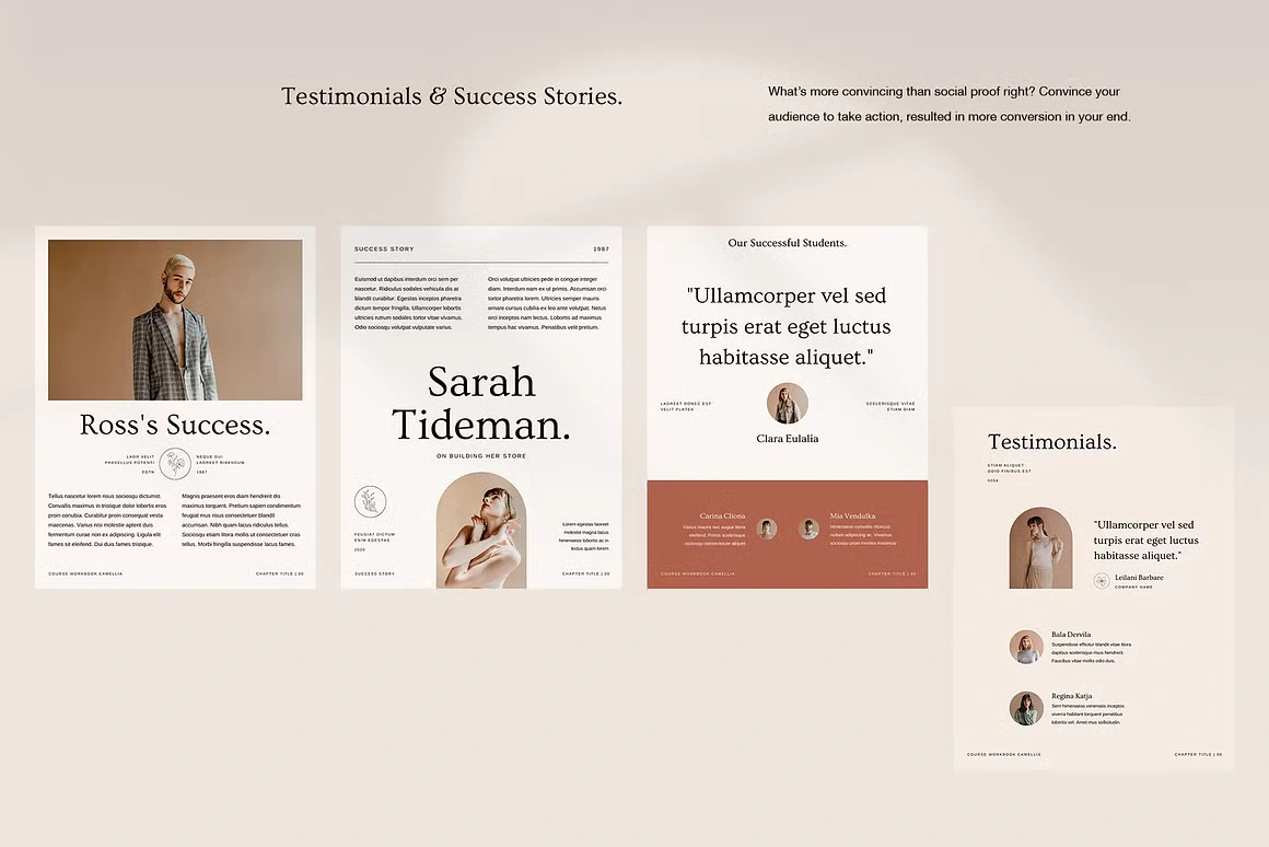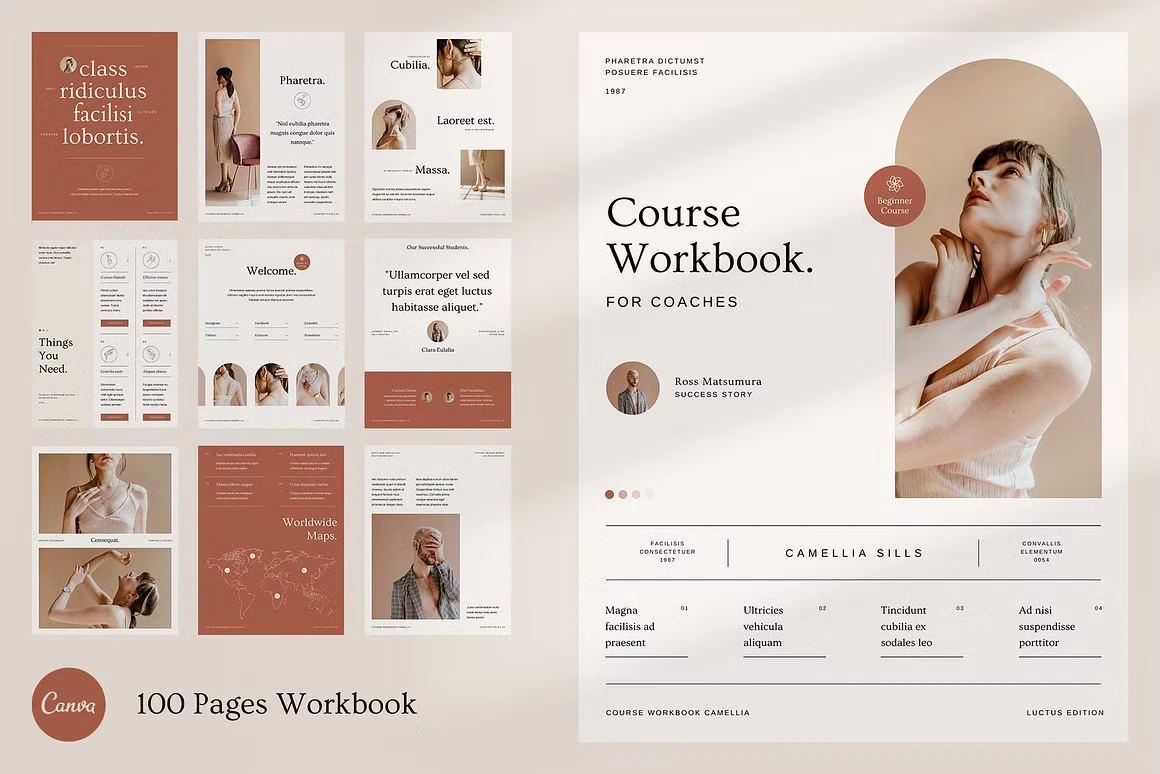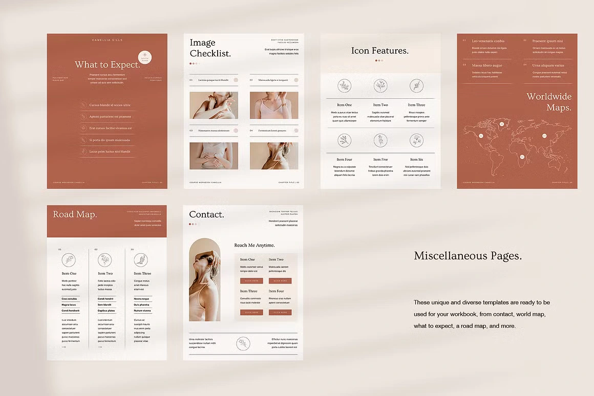Every layout feels considered: from the full-bleed chapter openers and editorial content pages to testimonial spreads, success stories, roadmaps, image checklists, and worldwide maps. Built for coaches, Camellia covers every page type you need to deliver a complete, polished course experience, without sacrificing an ounce of class.