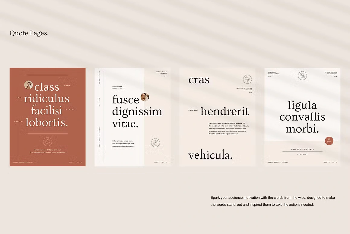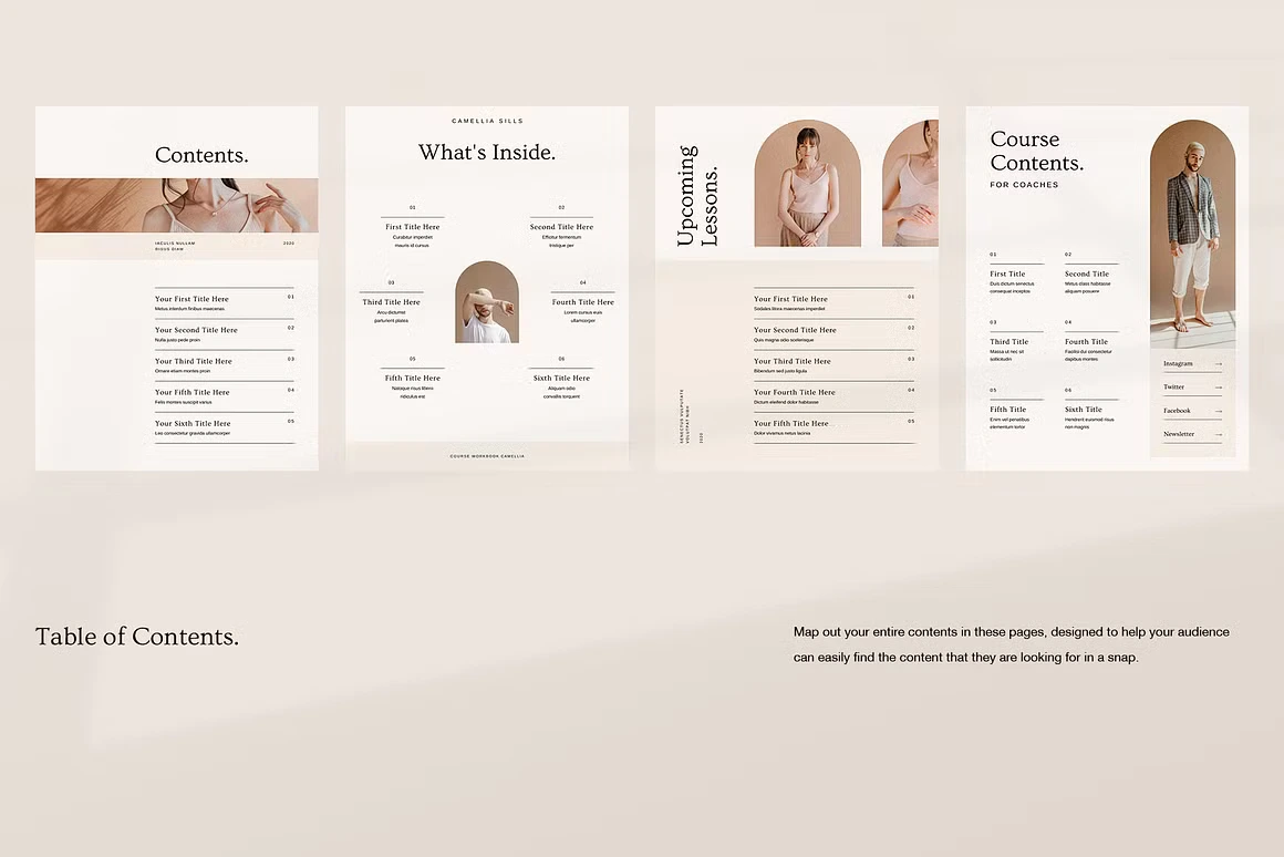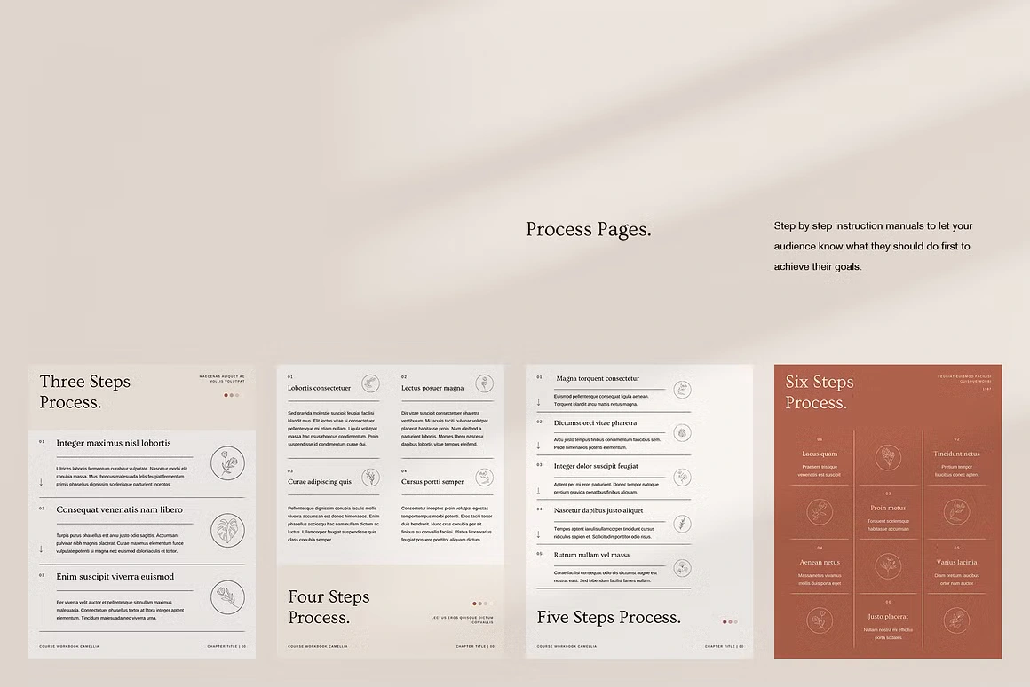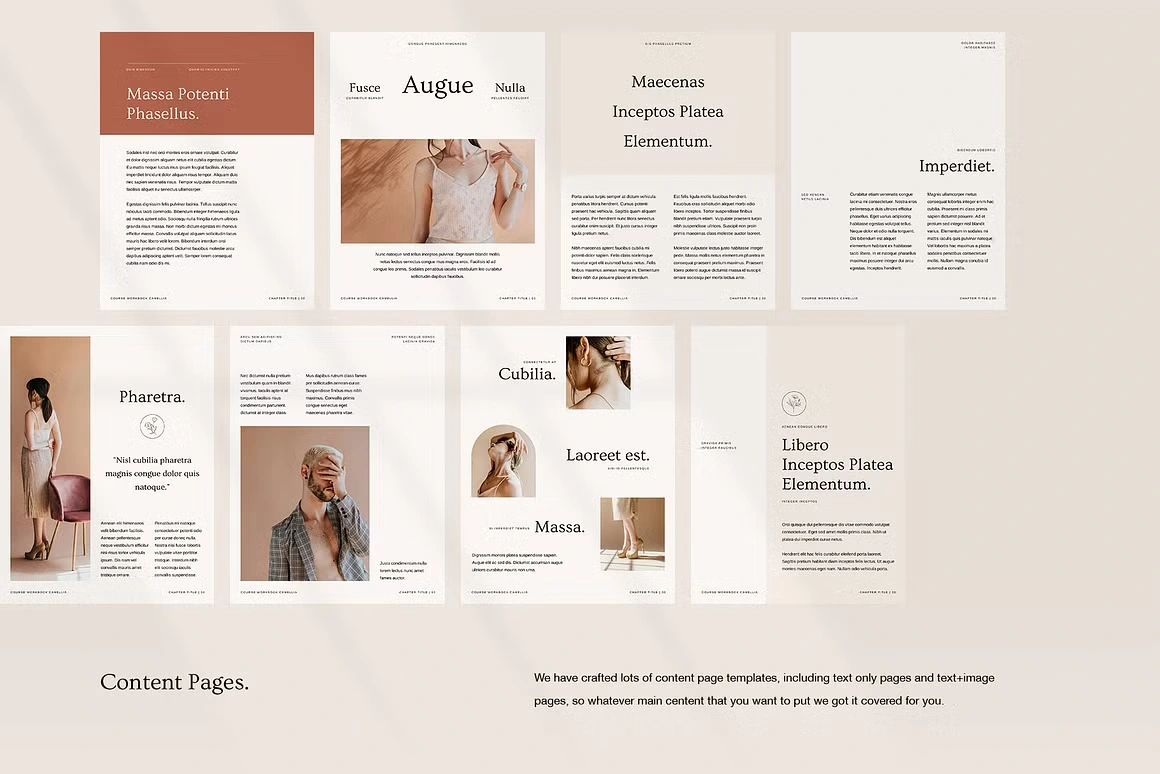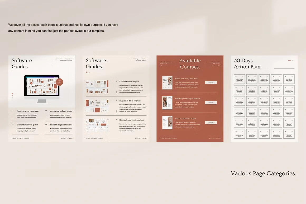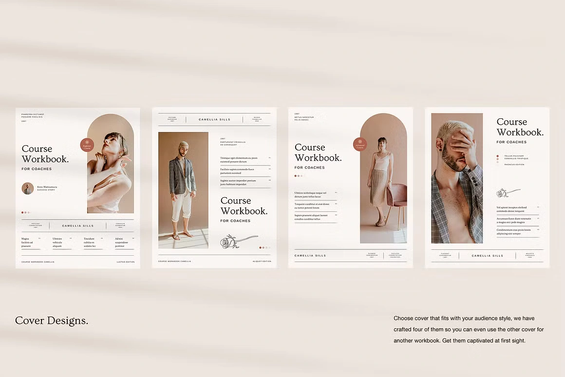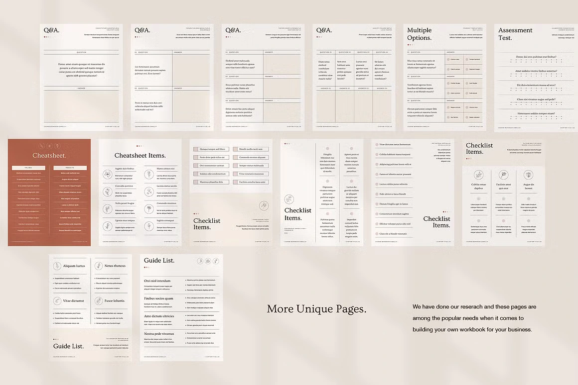 Every layout feels considered: from the full-bleed chapter openers and editorial content pages to testimonial spreads, success stories, roadmaps, image checklists, and worldwide maps. Built for coaches, Camellia covers every page type you need to deliver a complete, polished course experience, without sacrificing an ounce of class.