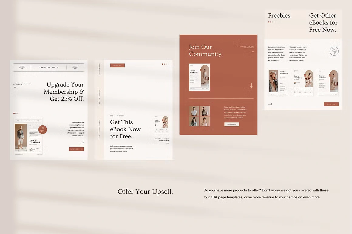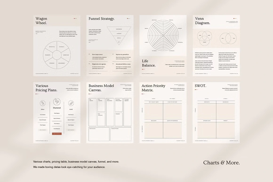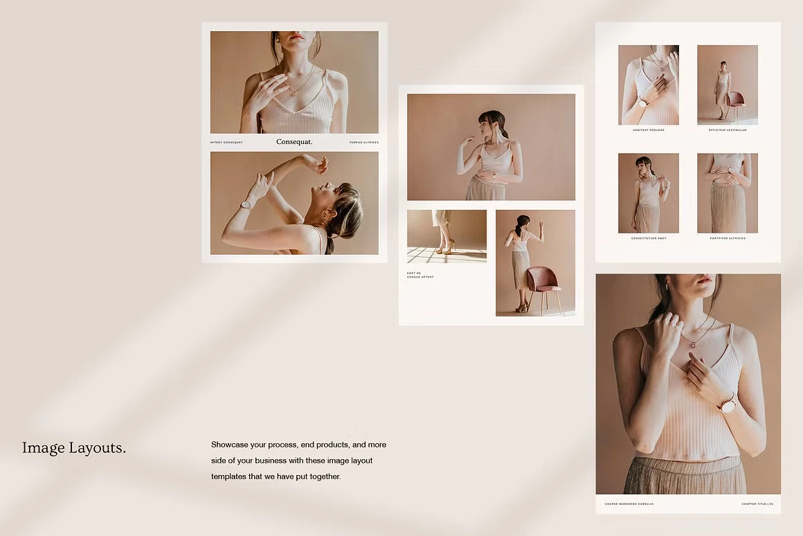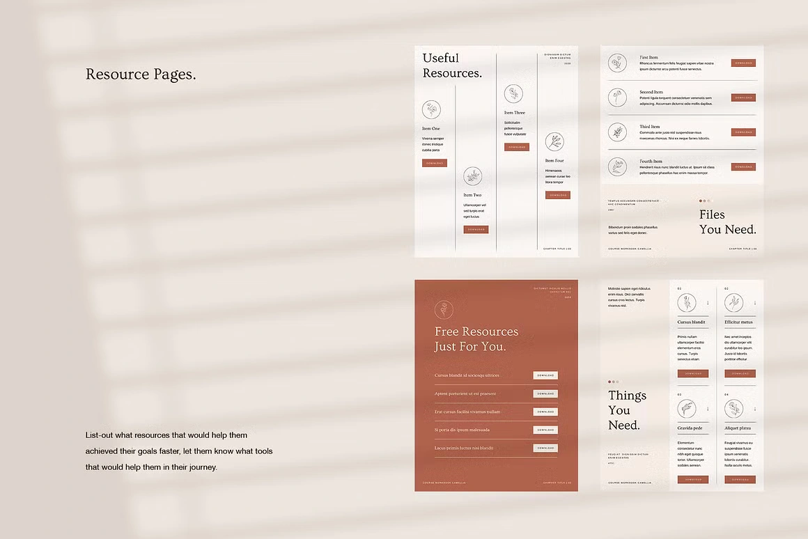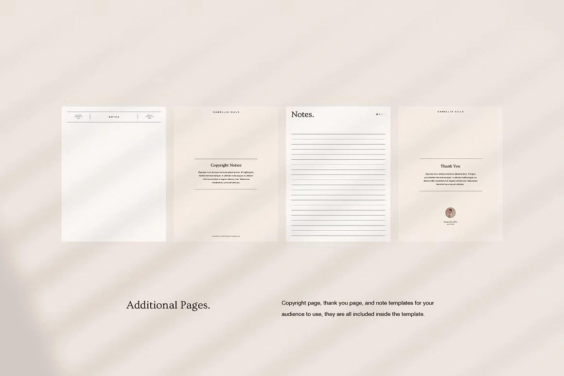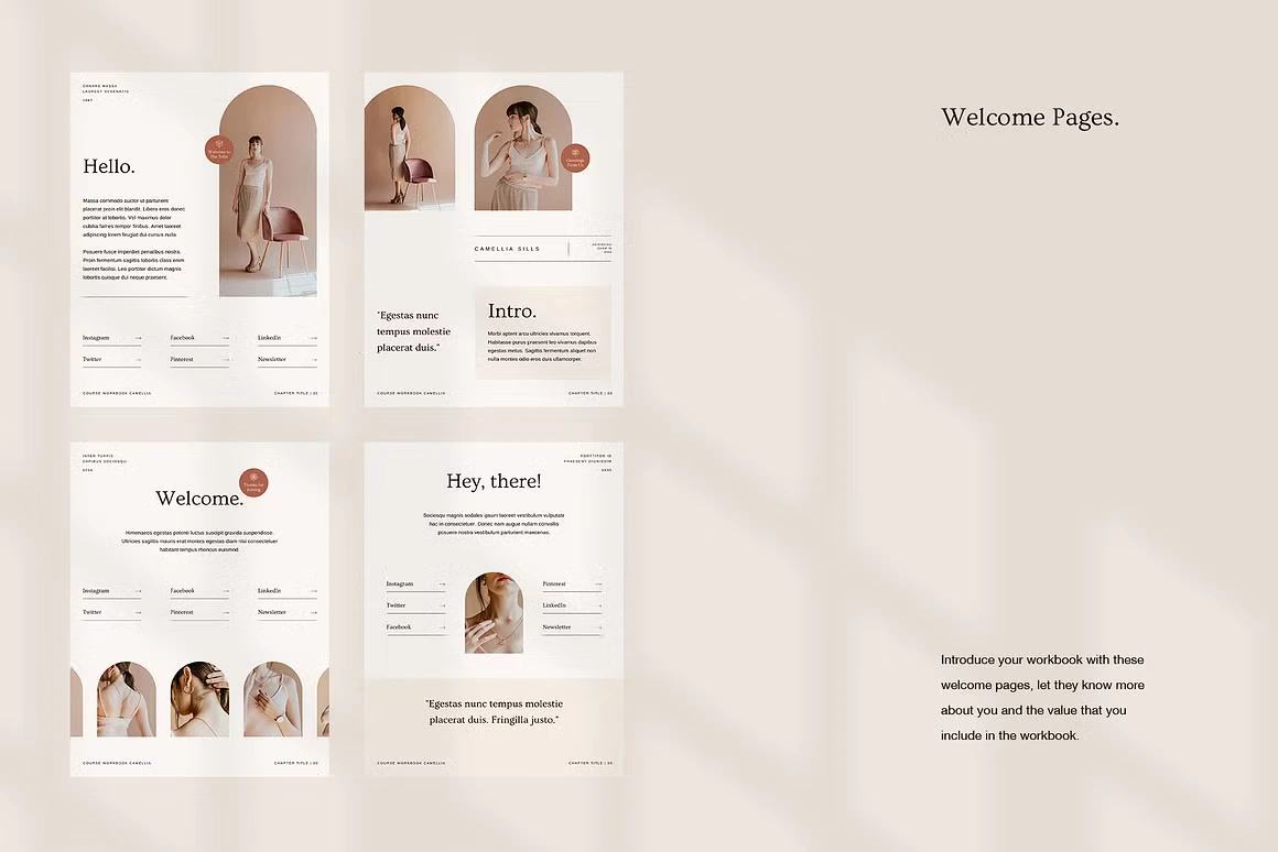 Every layout feels considered: from the full-bleed chapter openers and editorial content pages to testimonial spreads, success stories, roadmaps, image checklists, and worldwide maps. Built for coaches, Camellia covers every page type you need to deliver a complete, polished course experience, without sacrificing an ounce of class.
