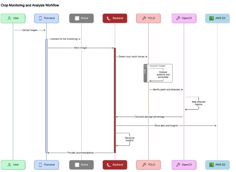 Farmers upload images of crop fields through a ReactJS-based frontend or connect drones equipped with cameras for live monitoring.