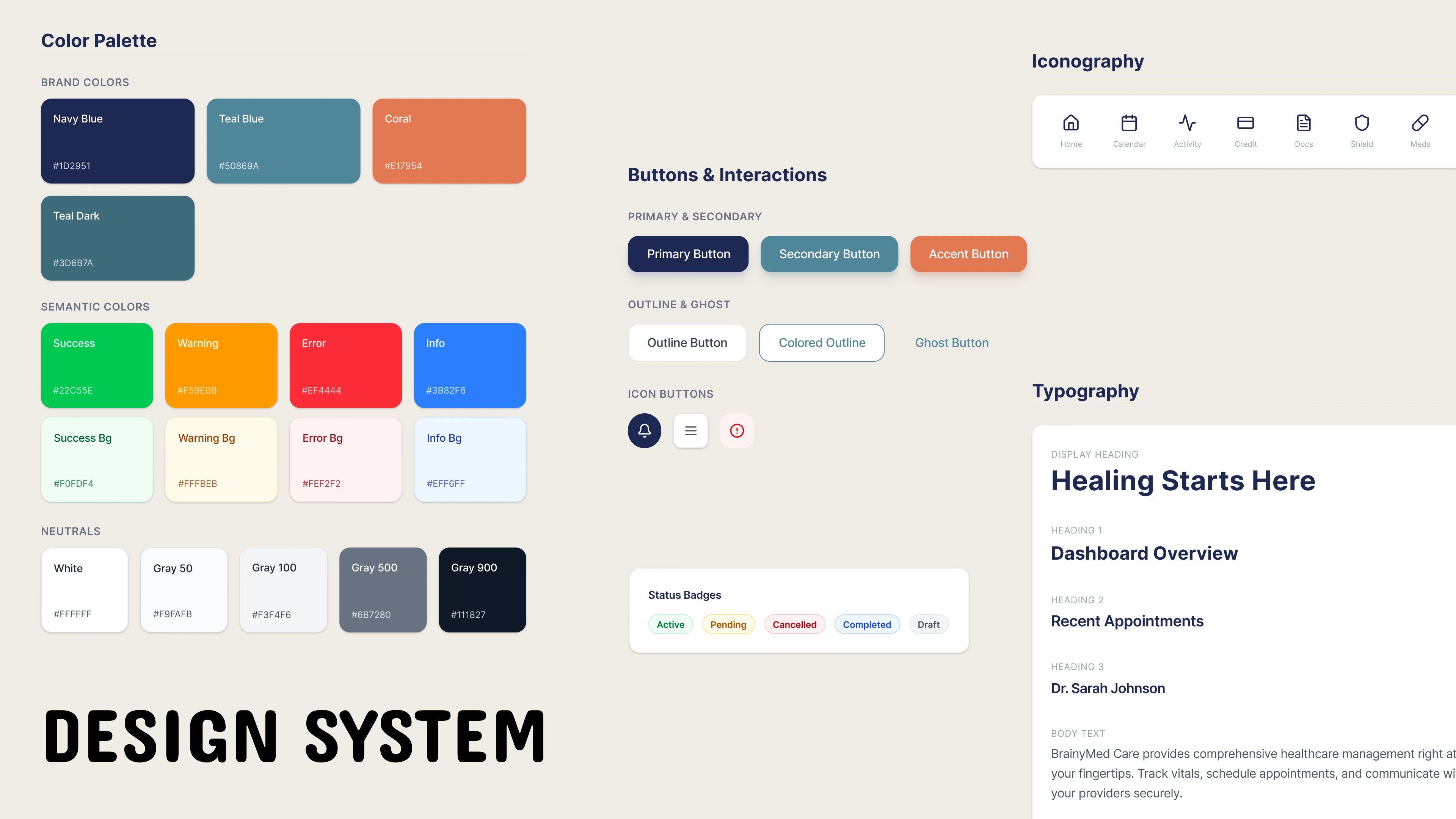 Spacing & Grid: An 8pt grid system standardized all padding and margins, creating professional, clean data density required for clinical tables and patient records.