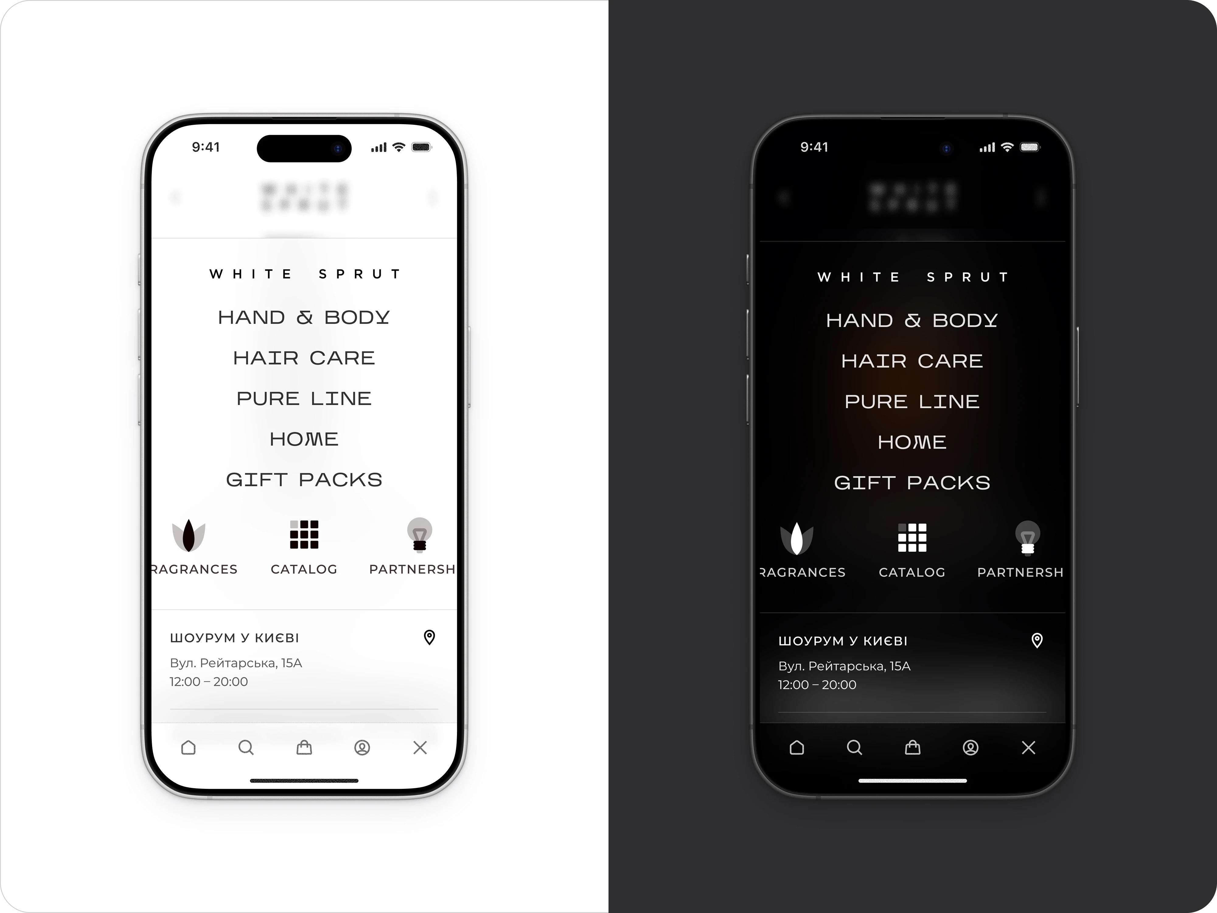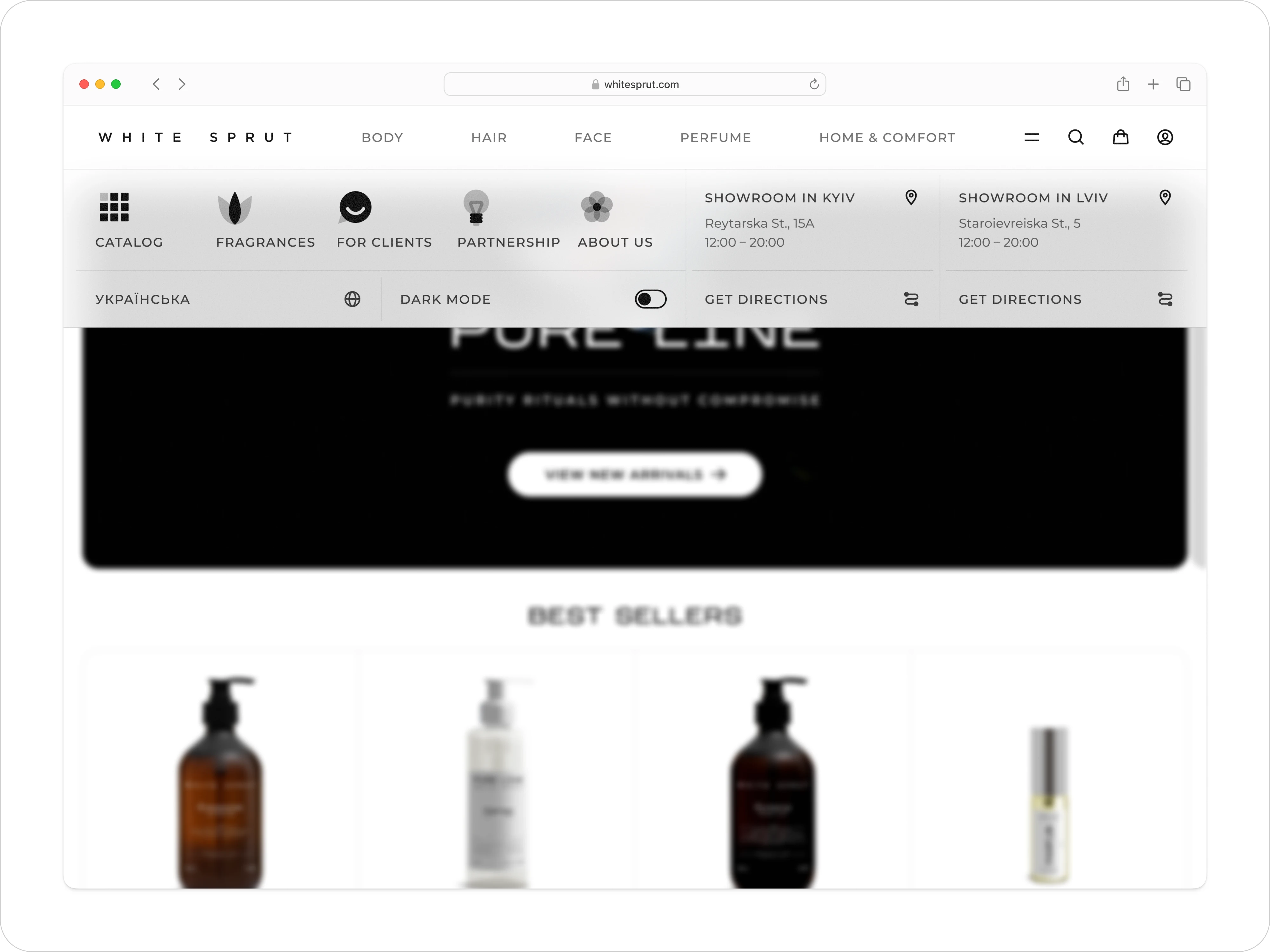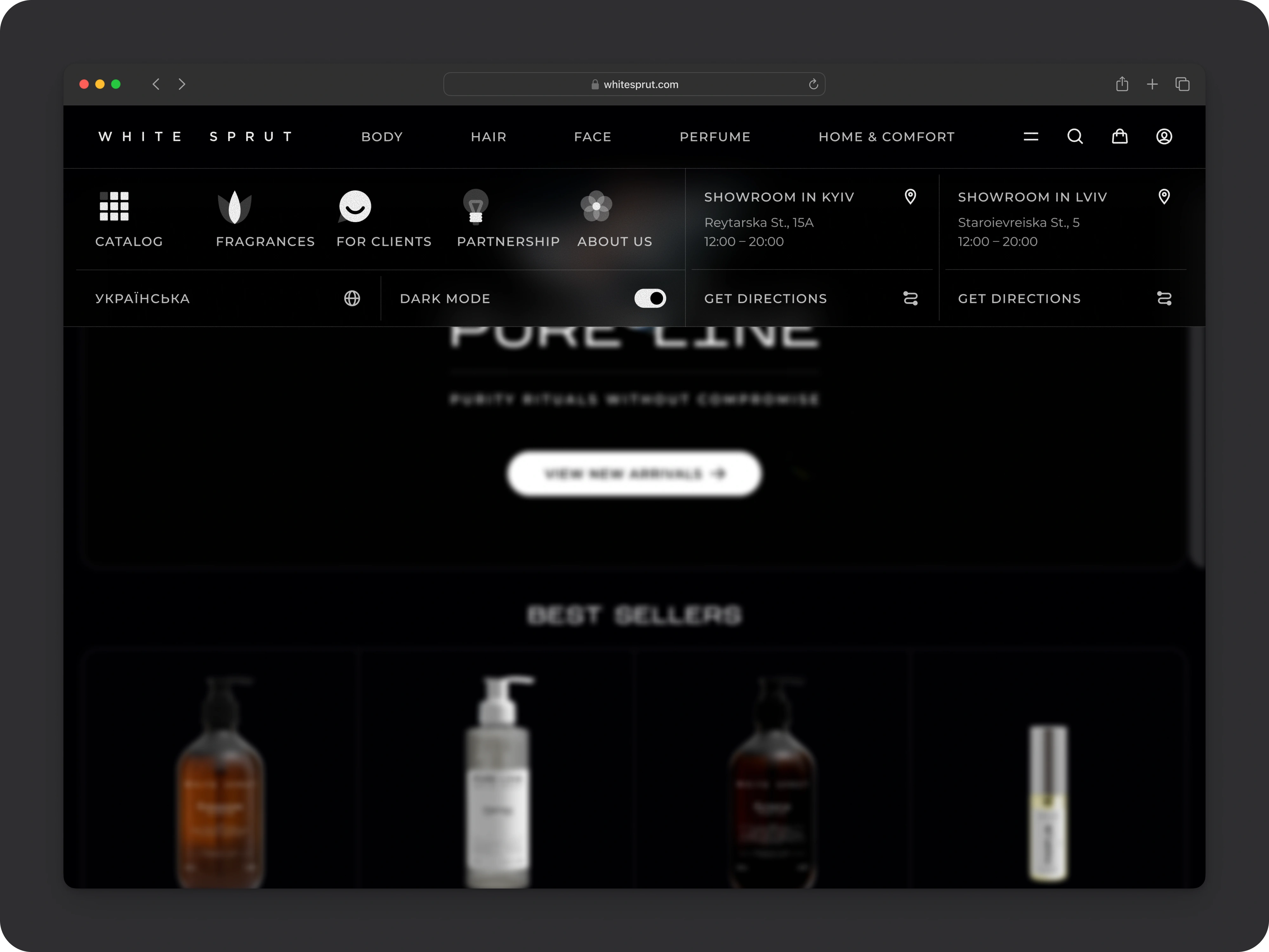 Top-bar categories (“Body”, “Hair”, “Face”, “Perfume”, “Home & Comfort”) live in a clean rail, with an always-visible dark-mode toggle tucked into the menu panel. On mobile, icon-driven tabs and a full-screen menu ensure exploration feels effortless — no more buried links.