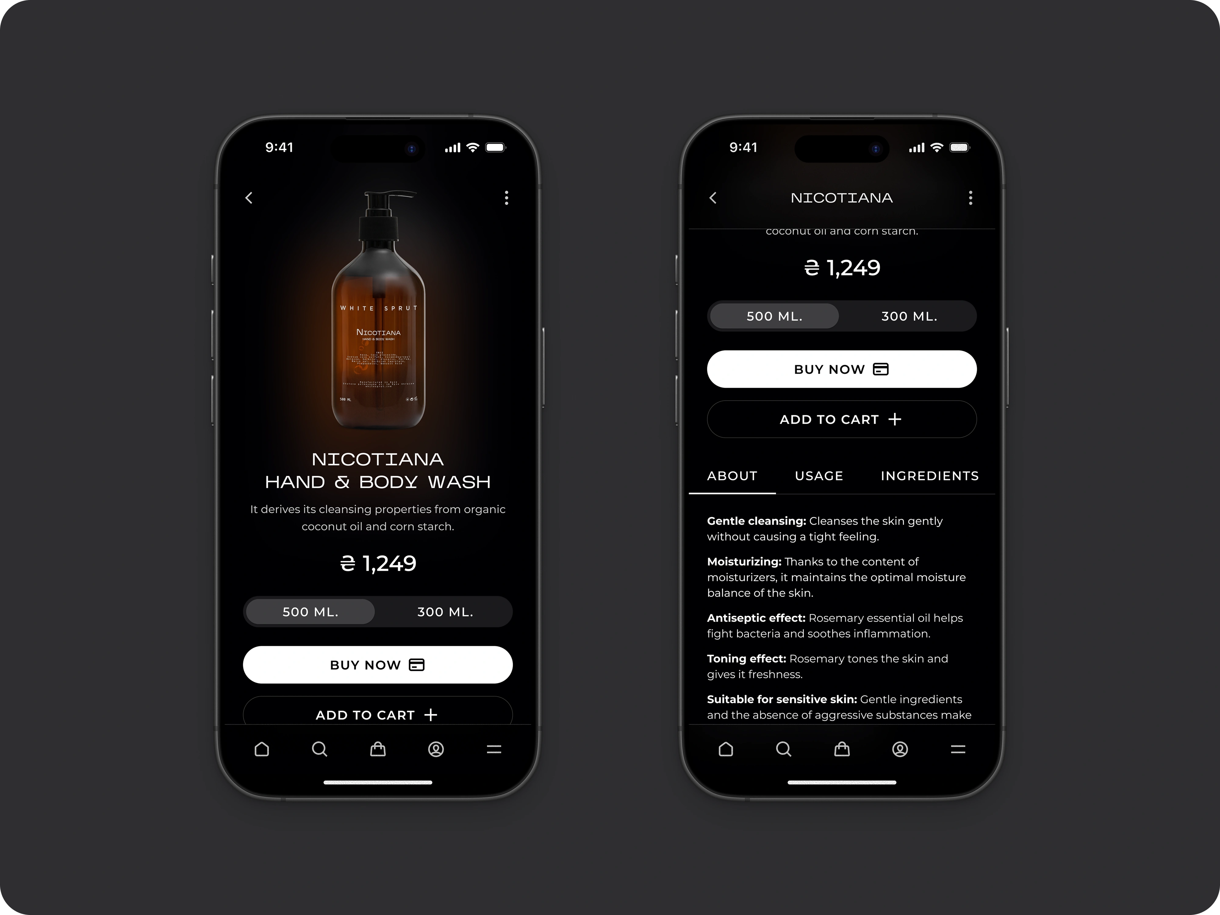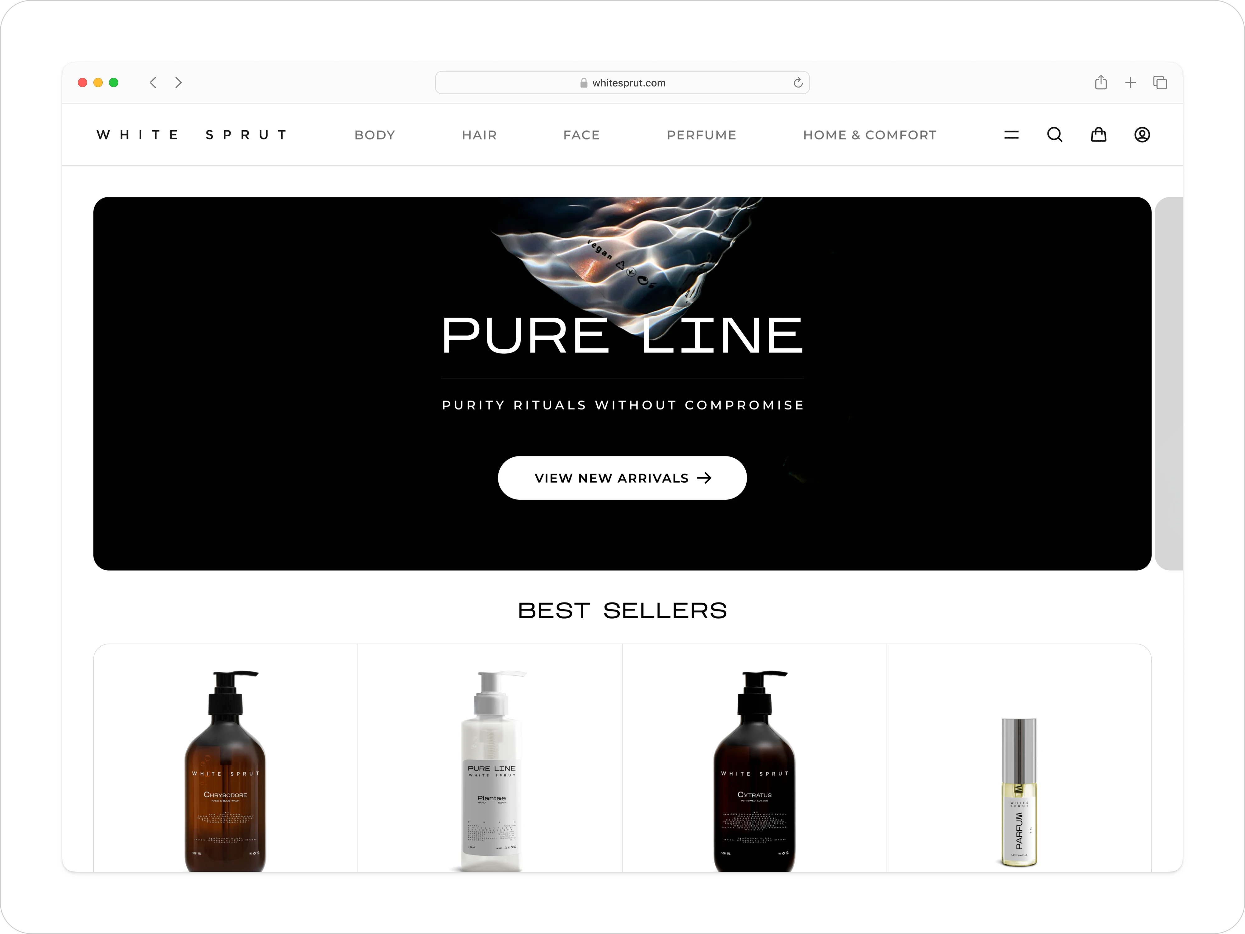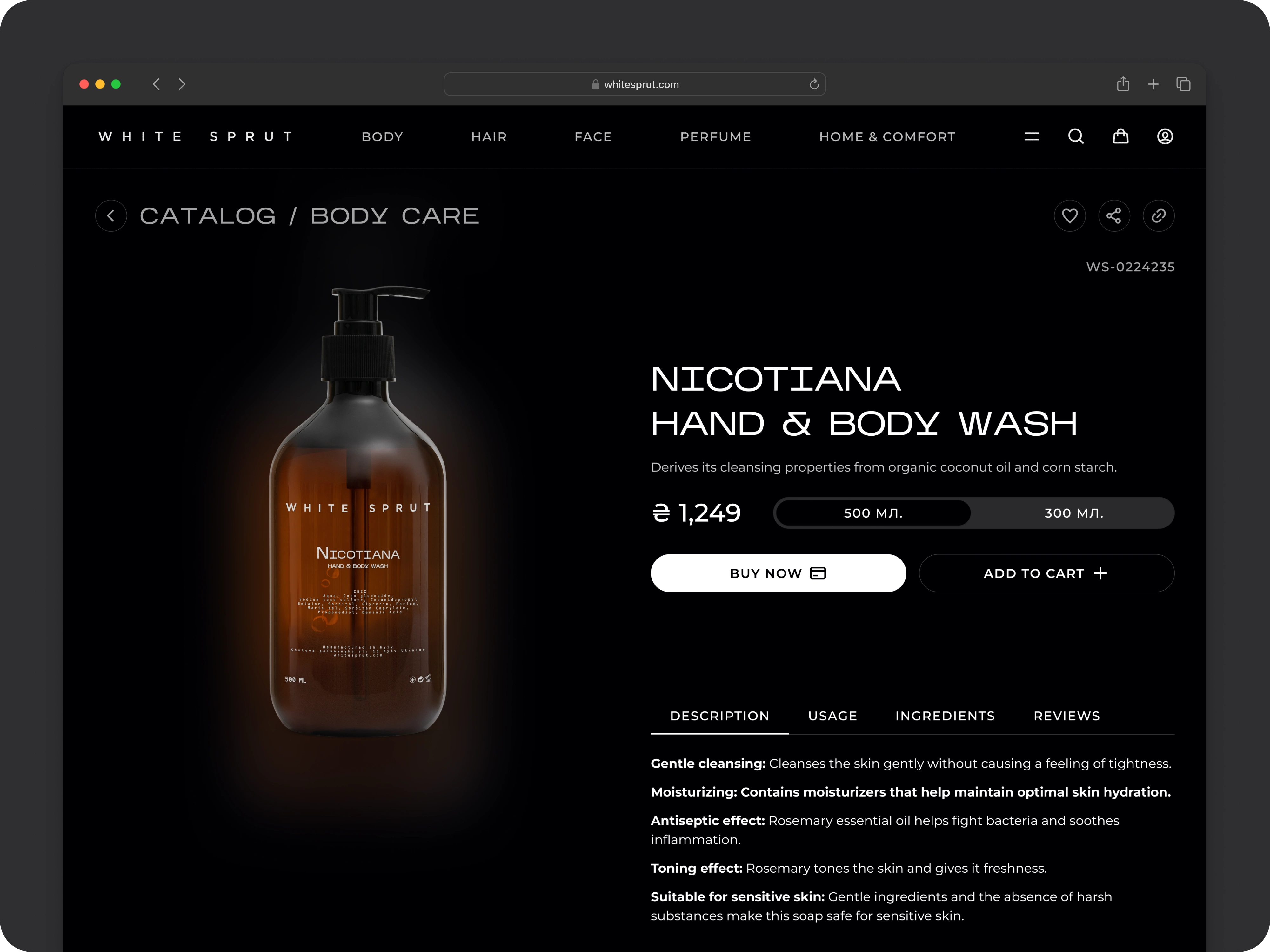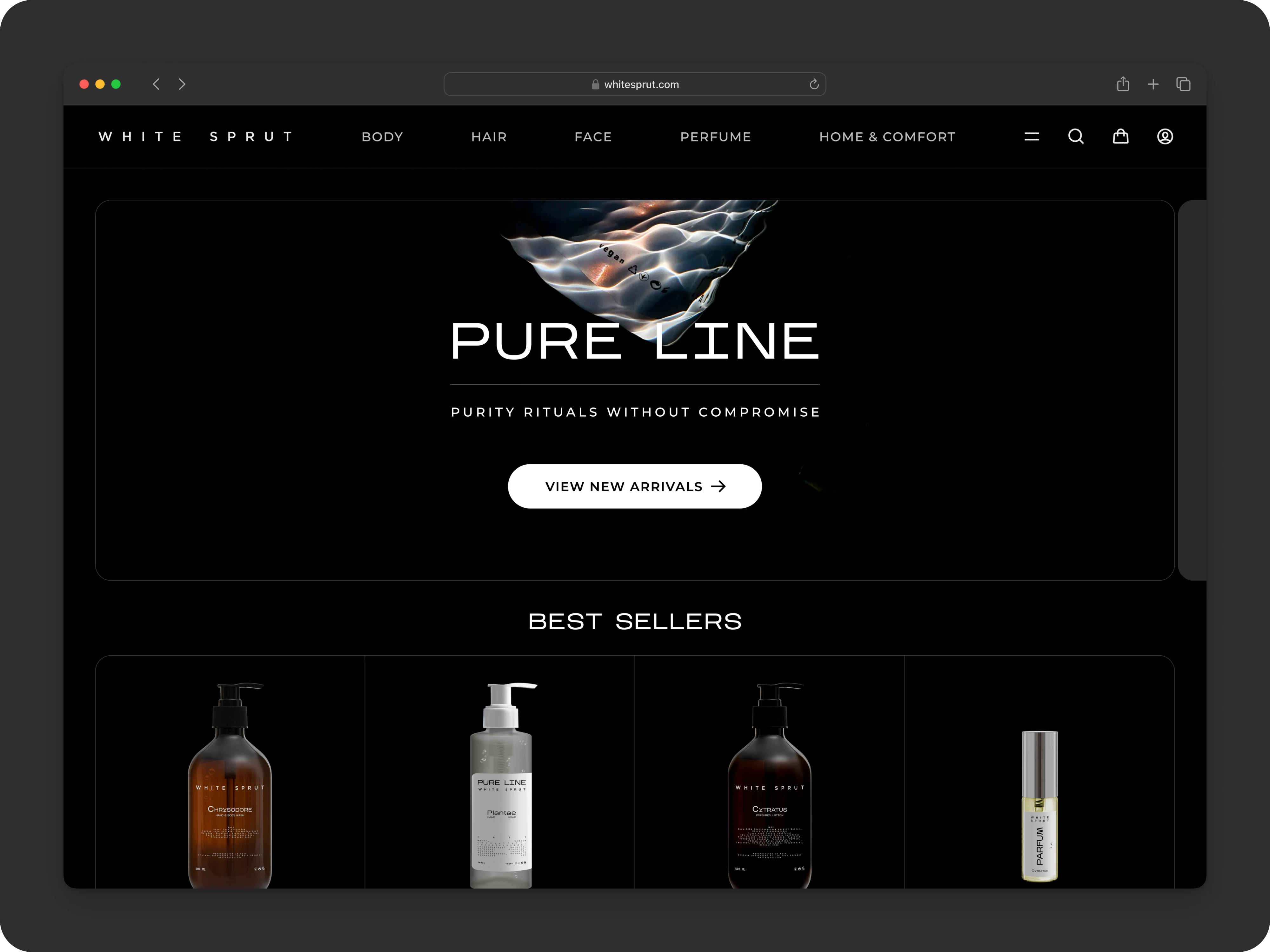 Top-bar categories (“Body”, “Hair”, “Face”, “Perfume”, “Home & Comfort”) live in a clean rail, with an always-visible dark-mode toggle tucked into the menu panel. On mobile, icon-driven tabs and a full-screen menu ensure exploration feels effortless — no more buried links.