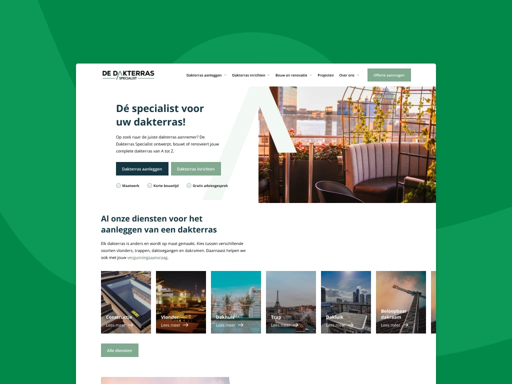 Transformed an outdated Squarespace site into an SEO-optimized website for De Dakterras Specialist. Comprehensive service info drives consistent new leads.