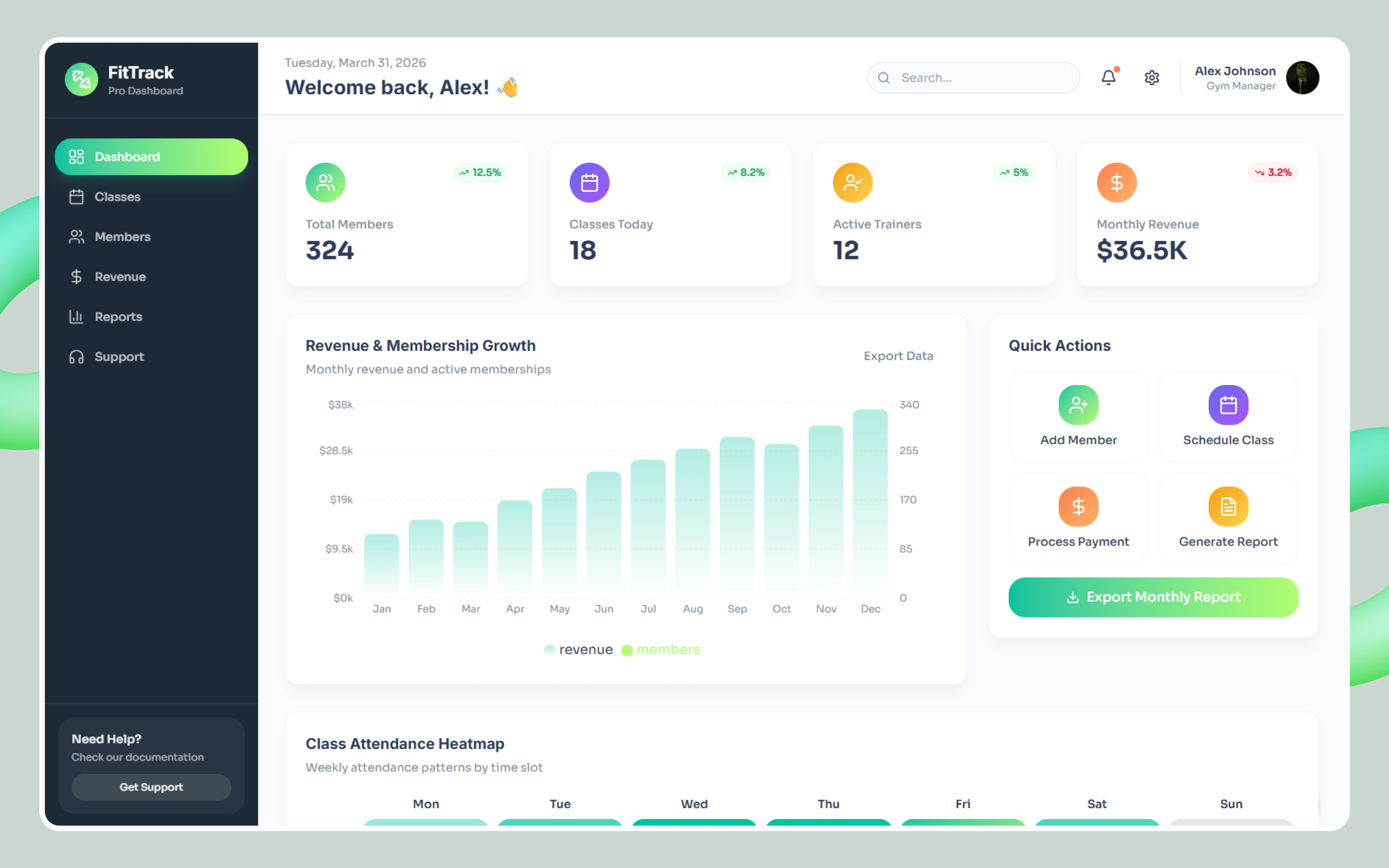 We designed a clean, user-focused experience that transforms chaotic gym operations into a simple, actionable workflow. Our role included UX planning, dashboard architecture, visual direction, and interactive design—ensuring that all data points are clear, actionable, and easy to navigate for gym owners, managers, and trainers.