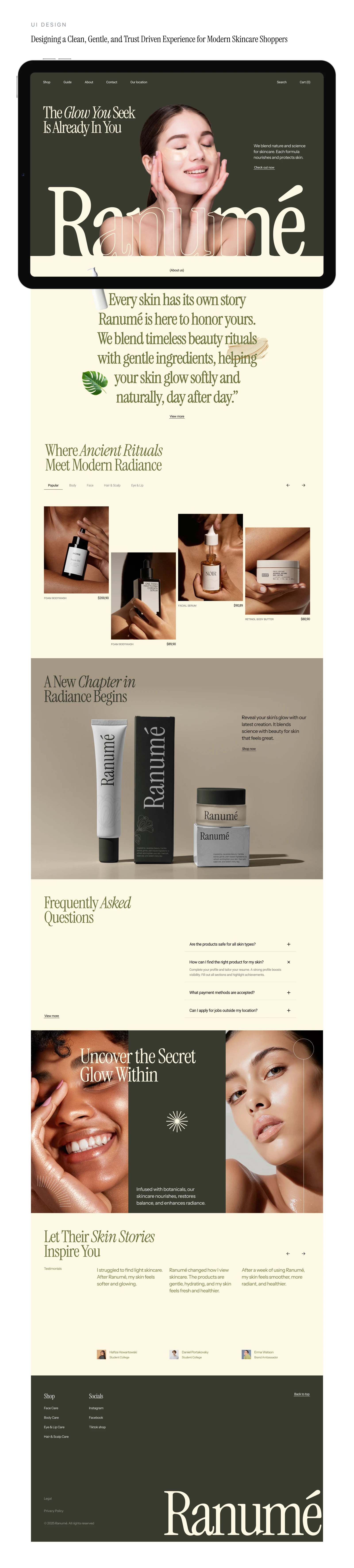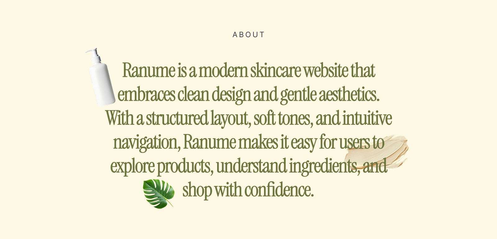 Ranume is a modern skincare website designed with clean minimalism and soft, calming aesthetics. Its structured layout and intuitive navigation make it effortless for users to discover products, learn about ingredients, and shop with confidence. Fully responsive and thoughtfully crafted, Ranume delivers a serene, elegant experience across every device reflecting the purity and care at the heart of the brand.