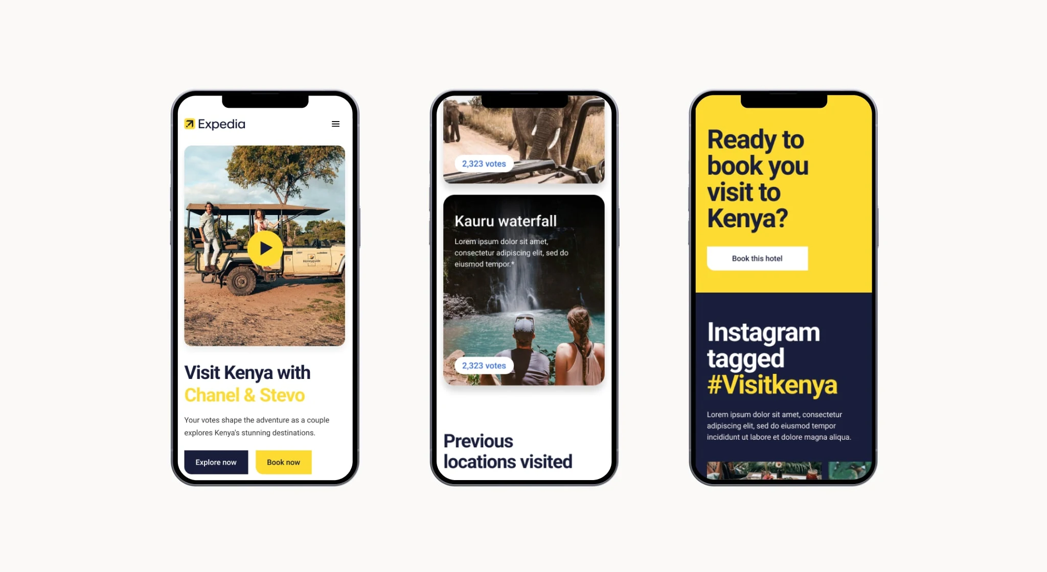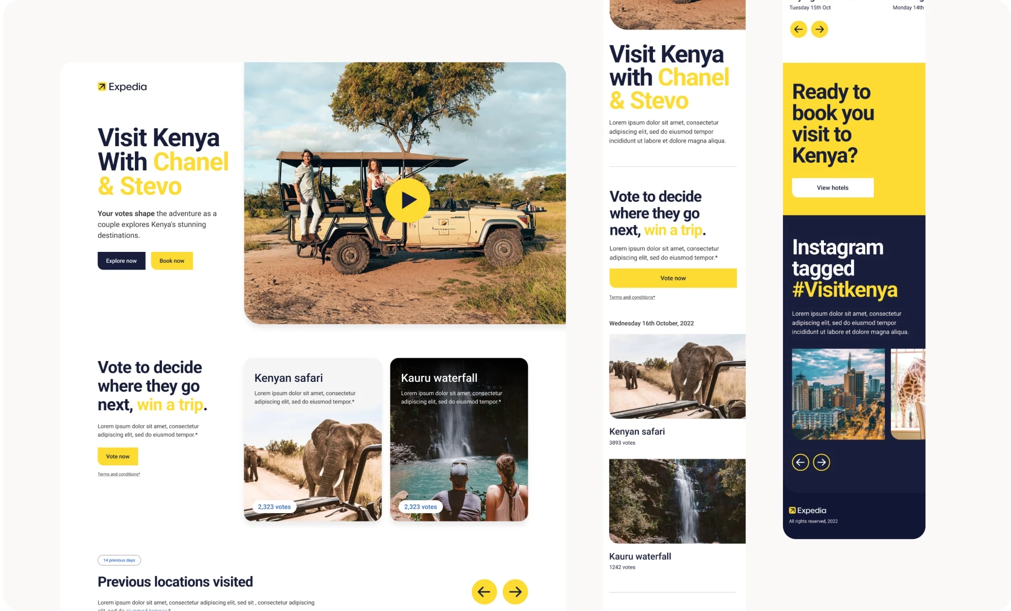 Expedia wanted to work with 2 key travel influencers to promote visiting Kenya while also giving away prizes. The work included a strong visual design at pace, light wireframe work but showcasing key hotel features, locations of interest and other travellers instagram photos.