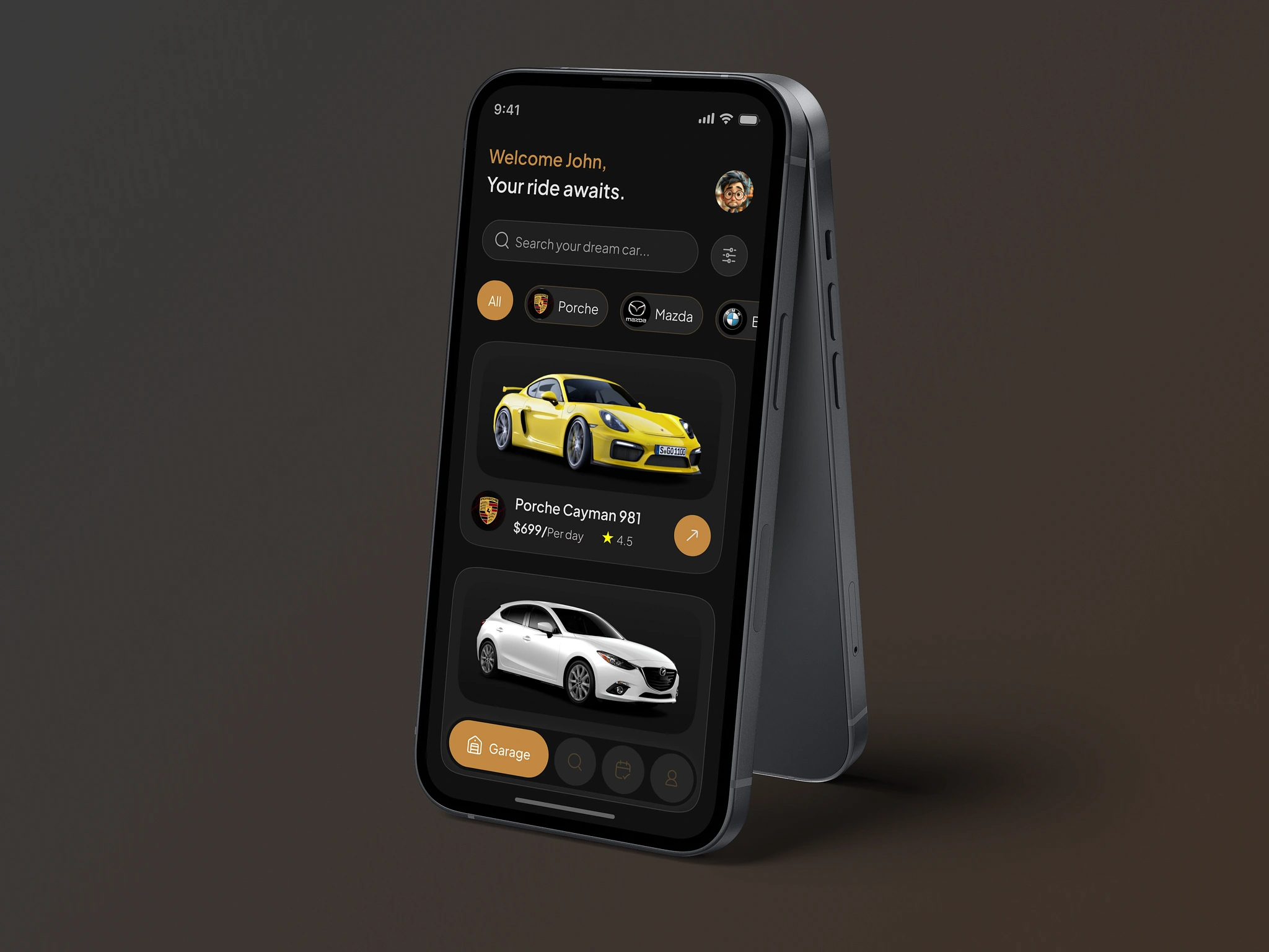 Discover the seamless experience of luxury car rental with this dark-themed mobile UI. This design combines sophistication and power, featuring high-end performance cars like the Porsche Cayman 981. The interface focuses on user comfort, effortless booking, and premium aesthetics.