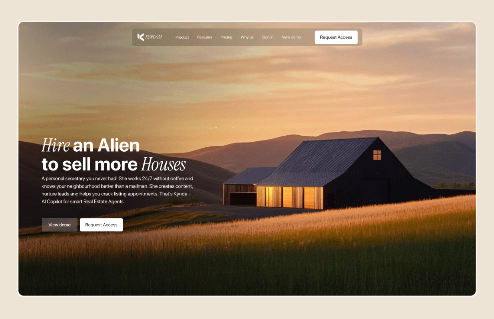 To create a landing page for Kyndom that stands out in the real estate industry. The aim was to make the page look modern, professional, and more appealing than competitors. The focus was to introduce Kynda, an AI assistant for real estate agents, in a way that’s easy to understand and grabs attention.