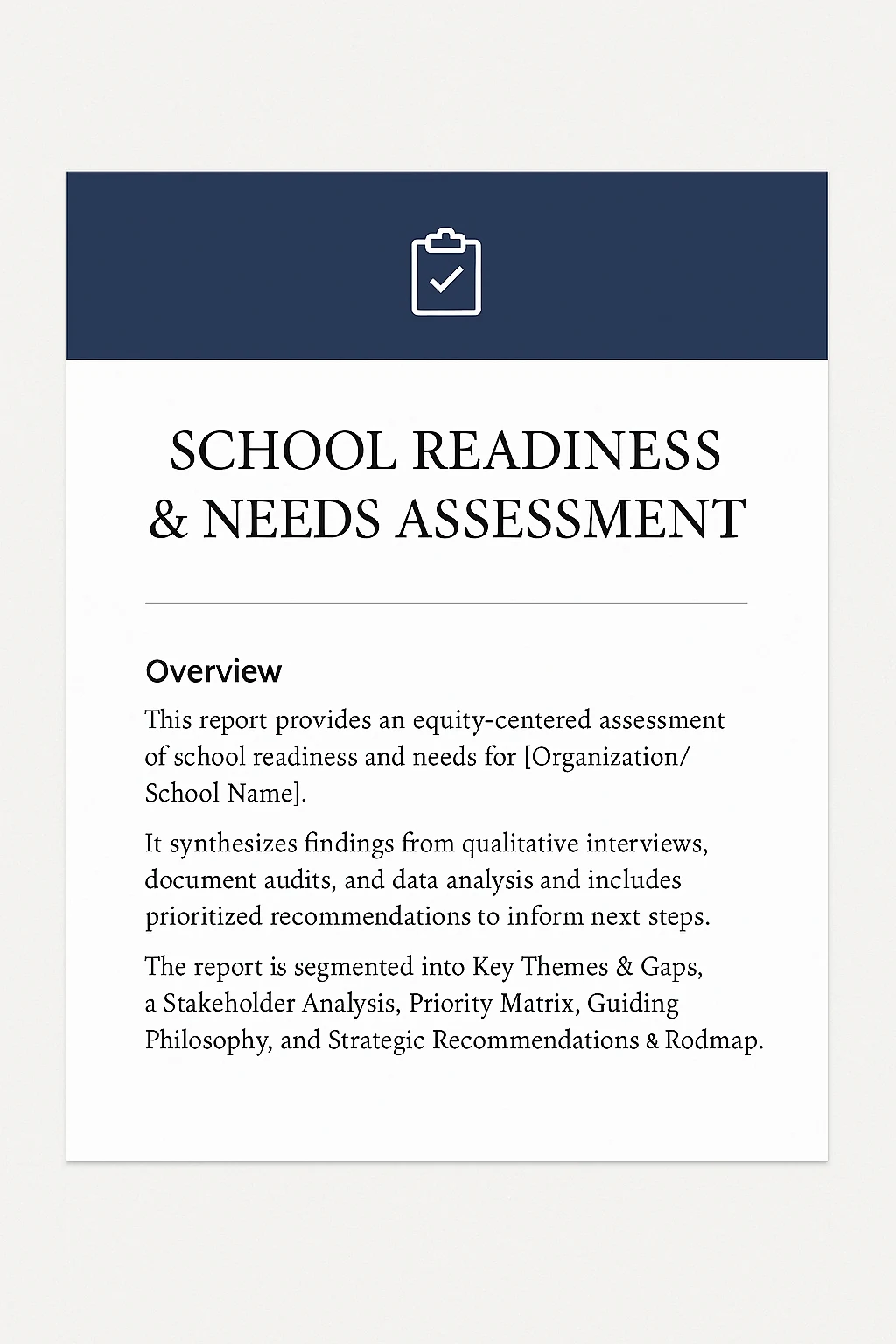 Delivered an equity-centered needs assessment for a school system, identifying key service gaps and prioritizing next-step recommendations.