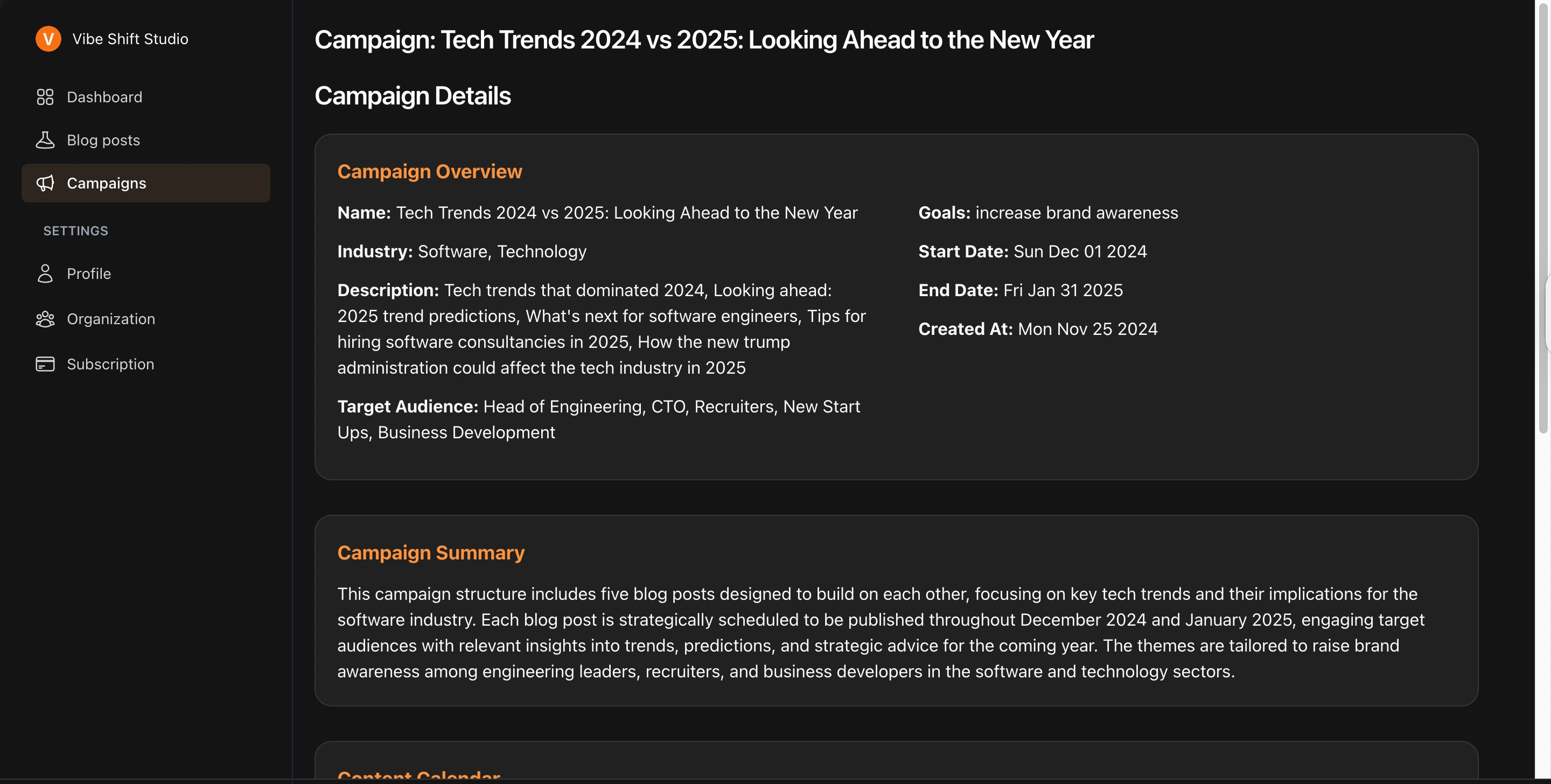 Generated content calendar for the start of the 2025 content campaign for a tech consultancy