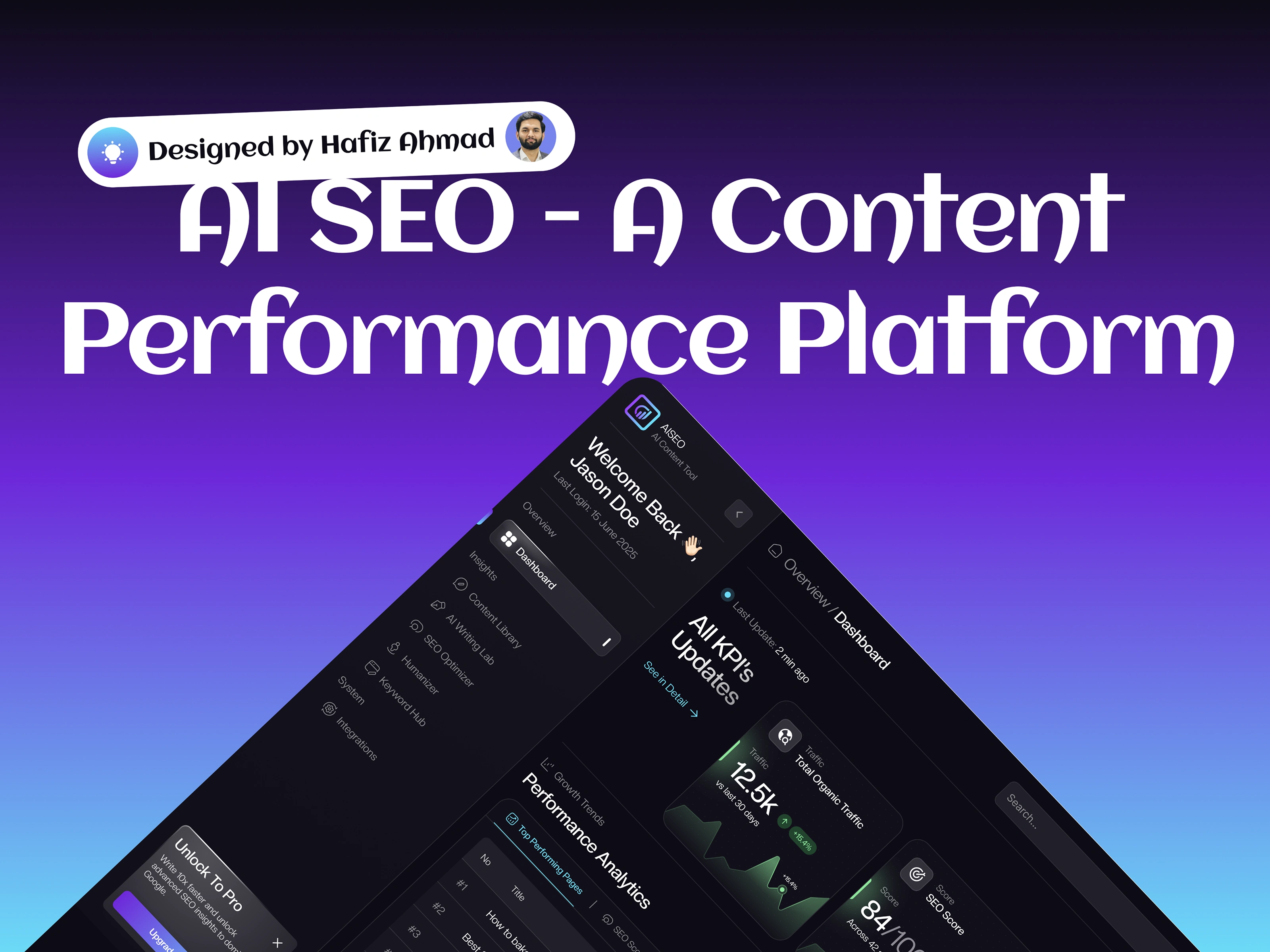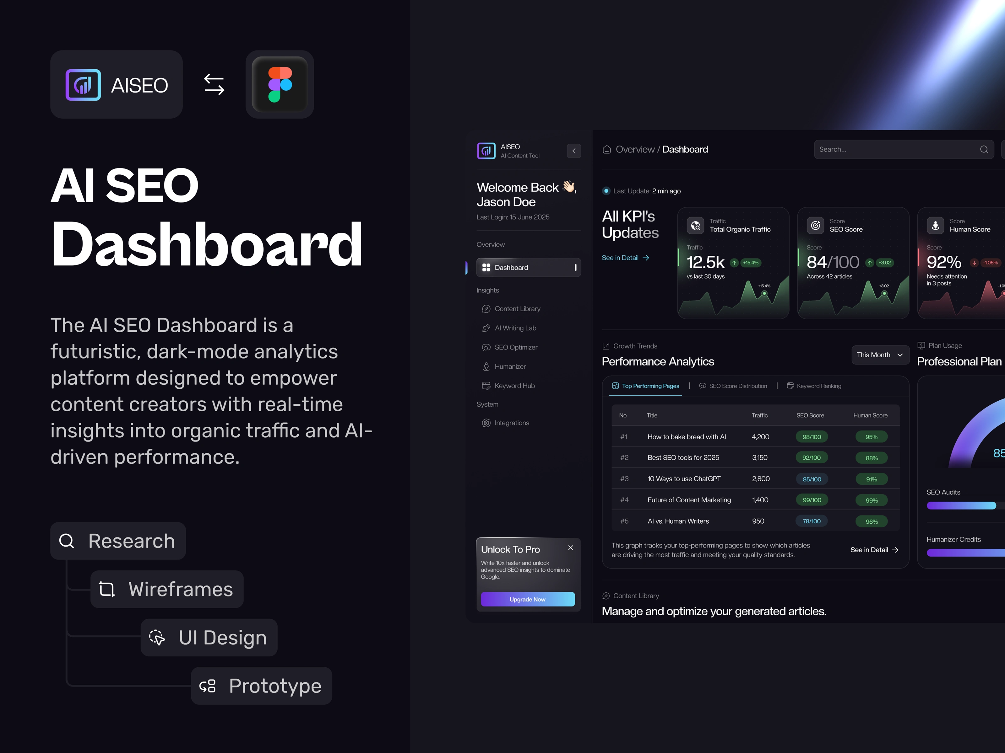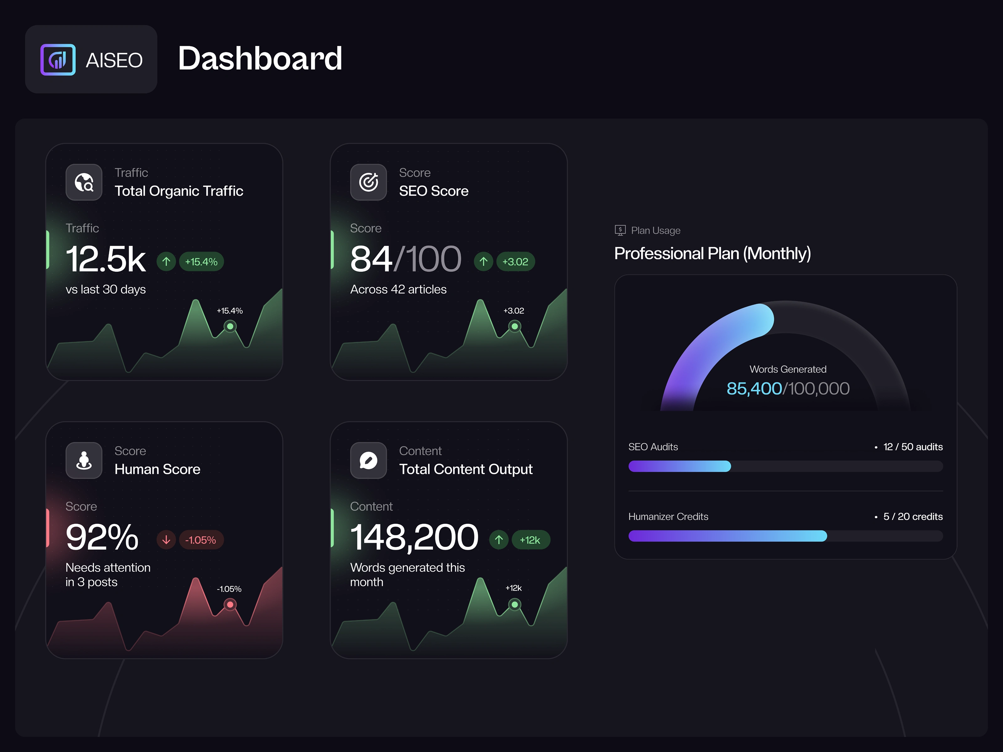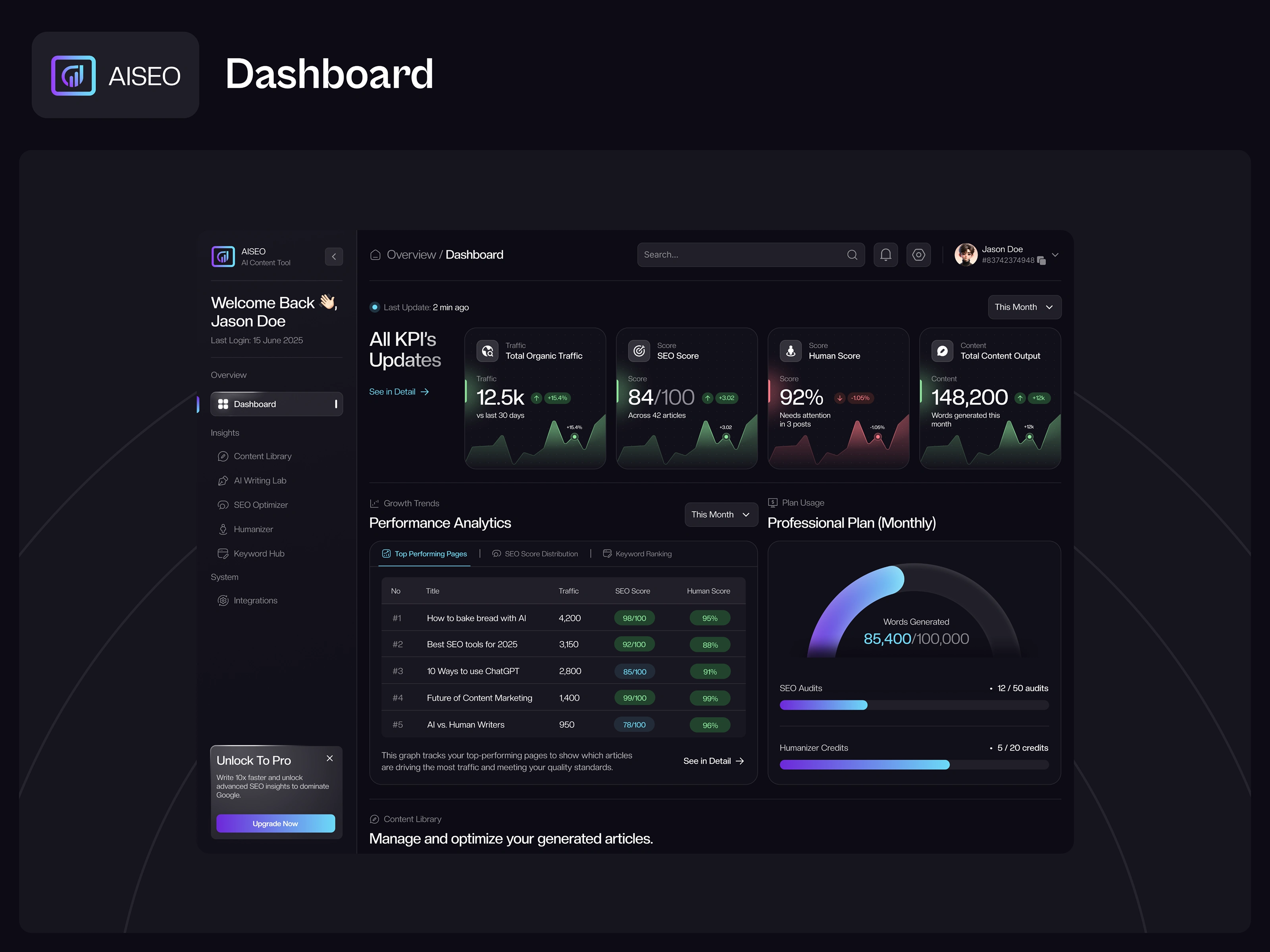 The AI SEO Dashboard is a high-performance analytics interface designed for content strategists to monitor organic traffic, SEO health, and AI-driven content production. The platform features a top-tier "KPI Updates" row that tracks vital metrics like SEO scores and "Human Scores," providing immediate insight into how well AI-generated text is performing.