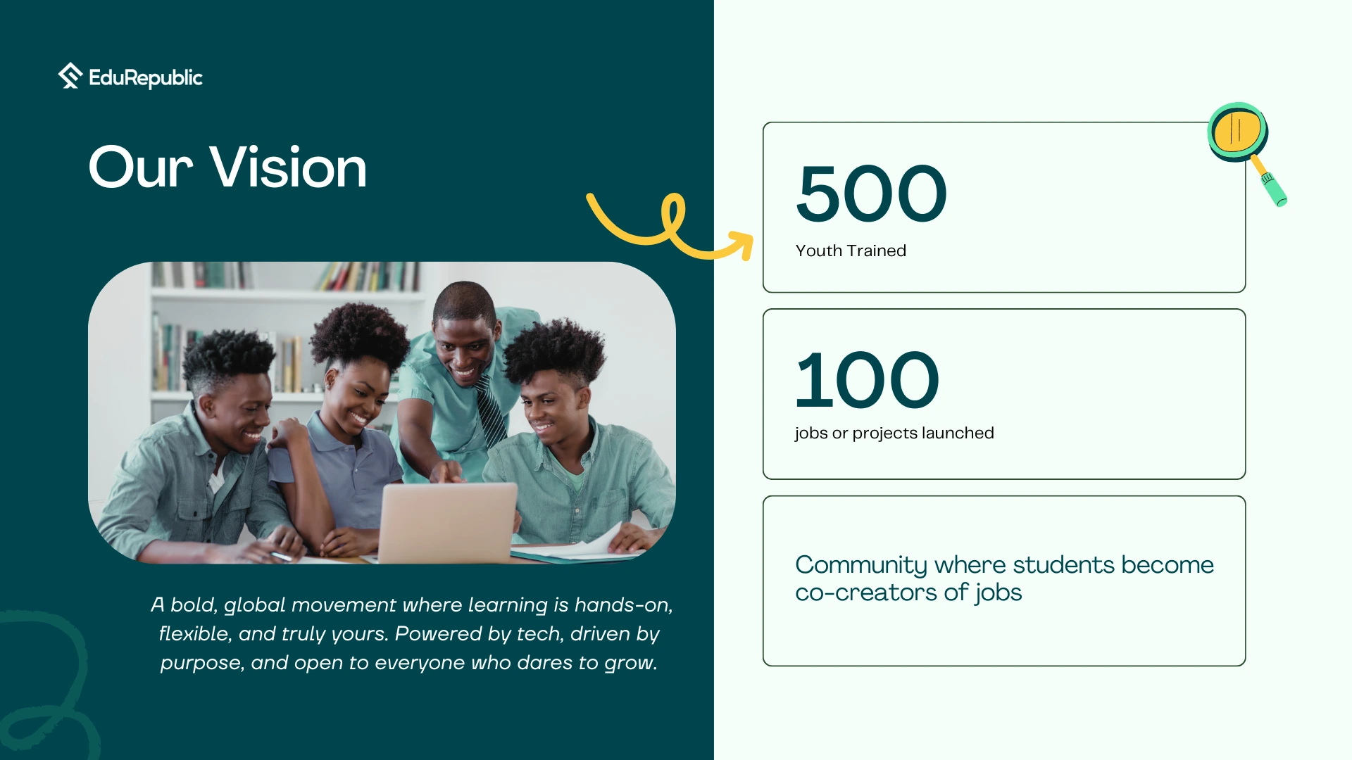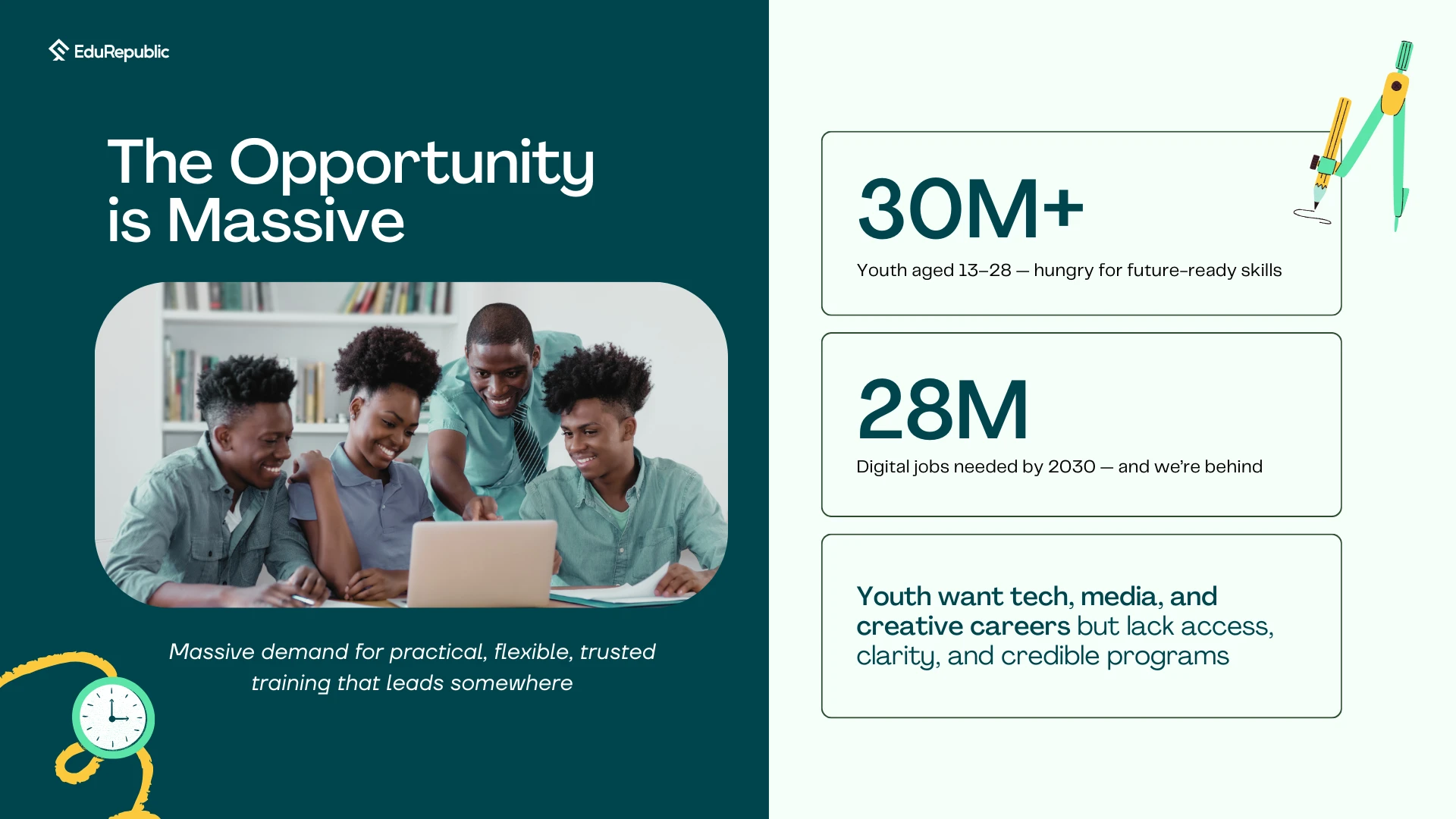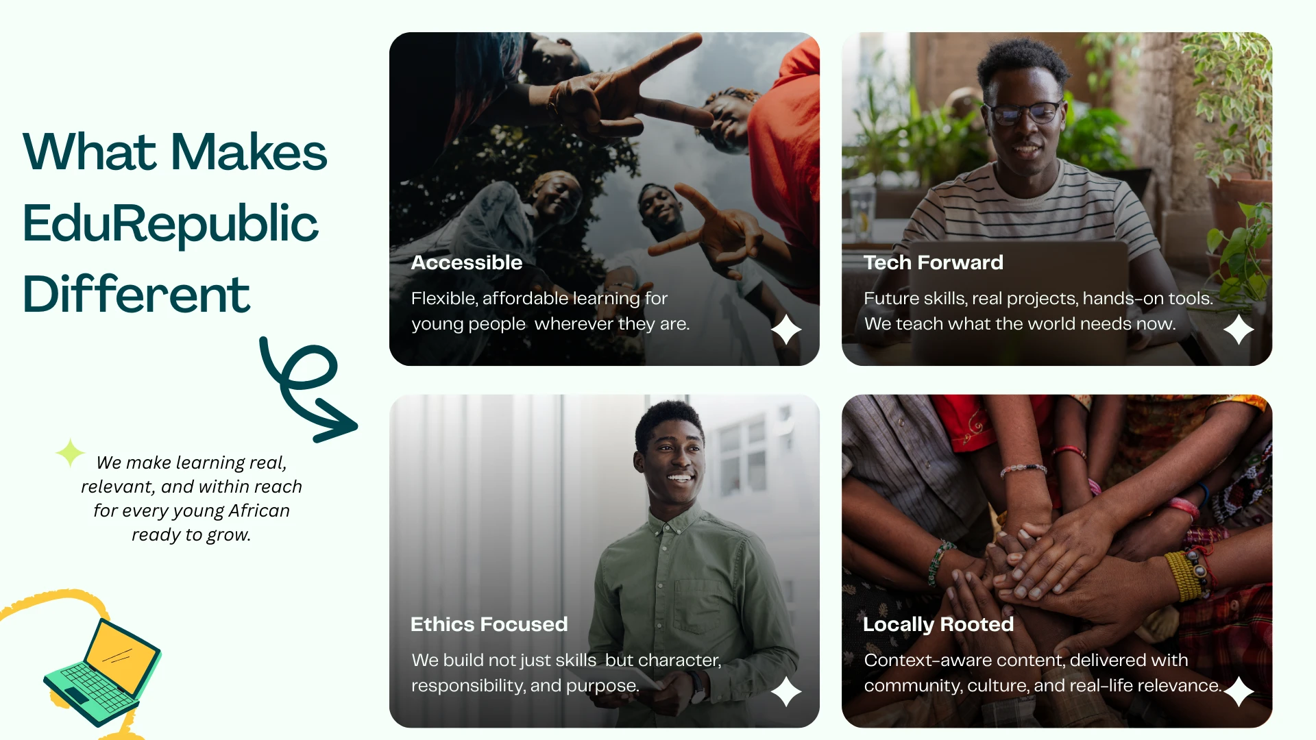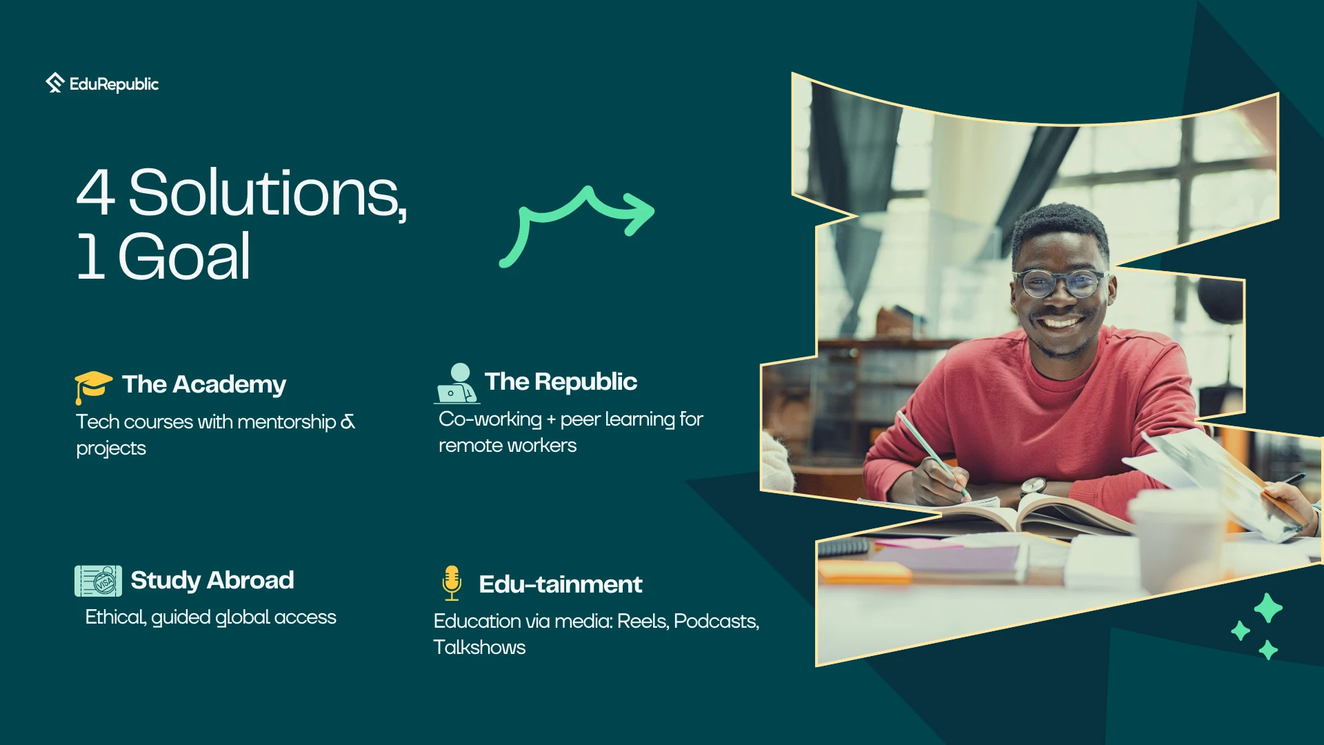 EduRepublic is an ambitious education startup focused on reimagining learning for young Africans through tech education, co-working spaces, global study access, and edu-media. The project required a compelling investor- and partner-ready pitch deck that could clearly communicate the problem, vision, opportunity, and multi-solution ecosystem in a visually engaging and emotionally resonant way.