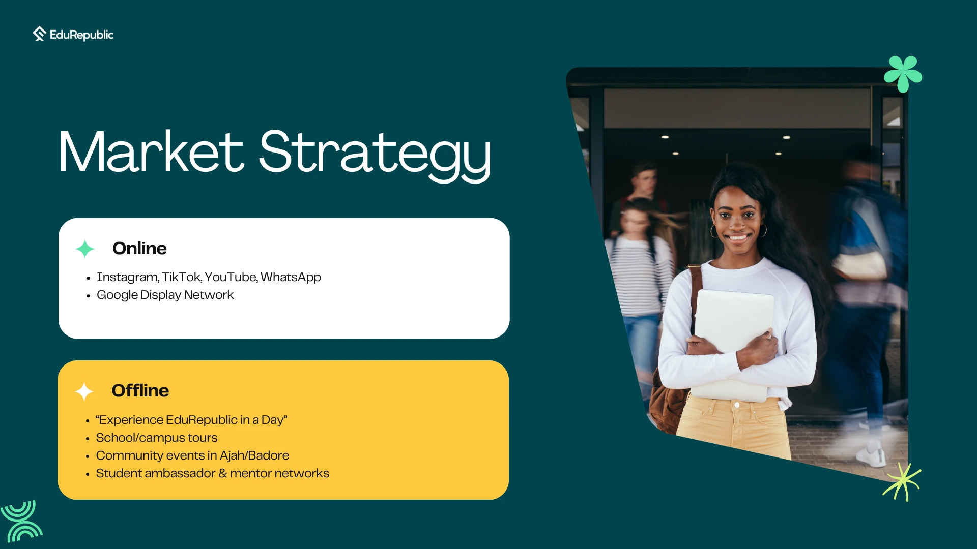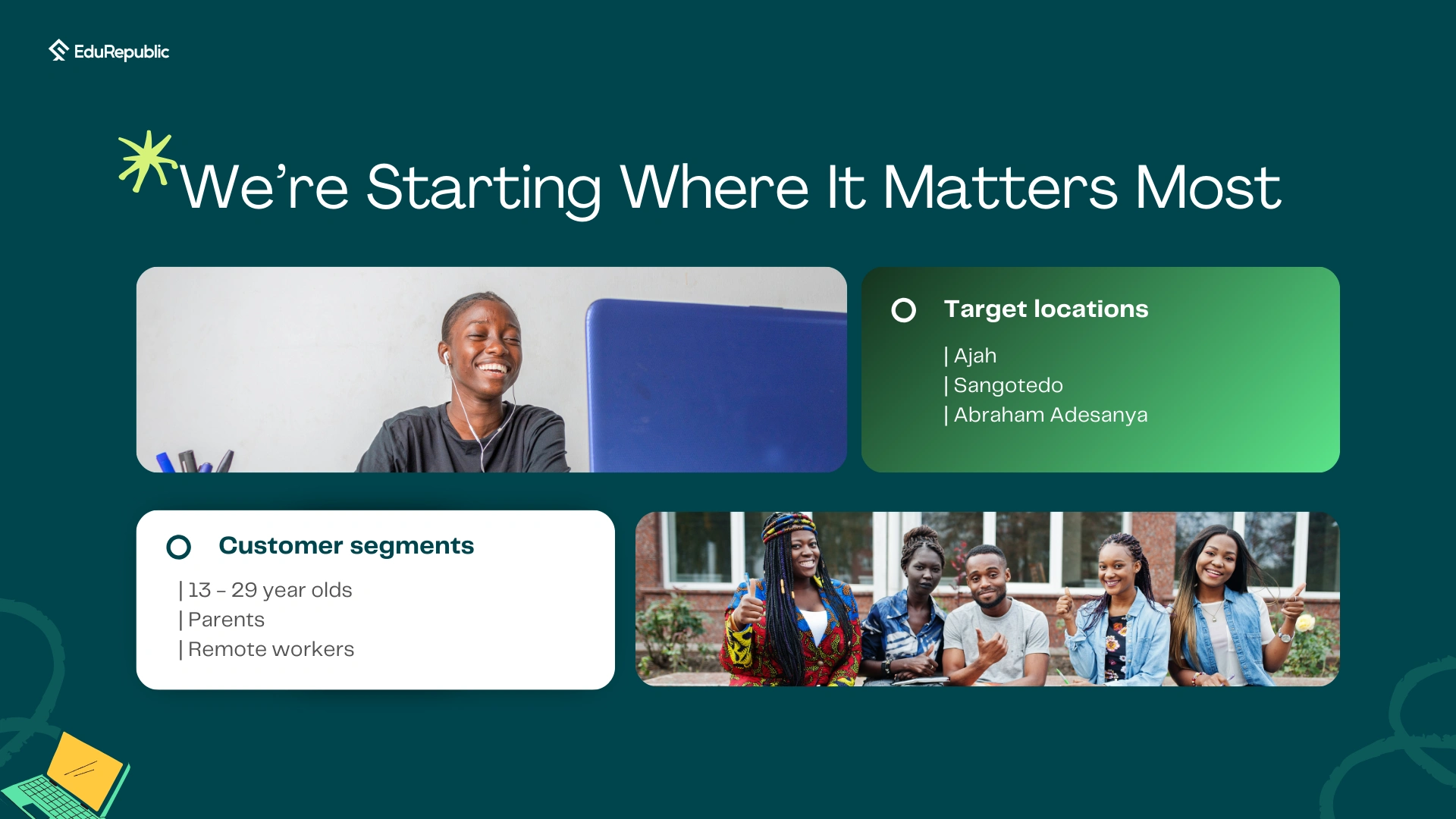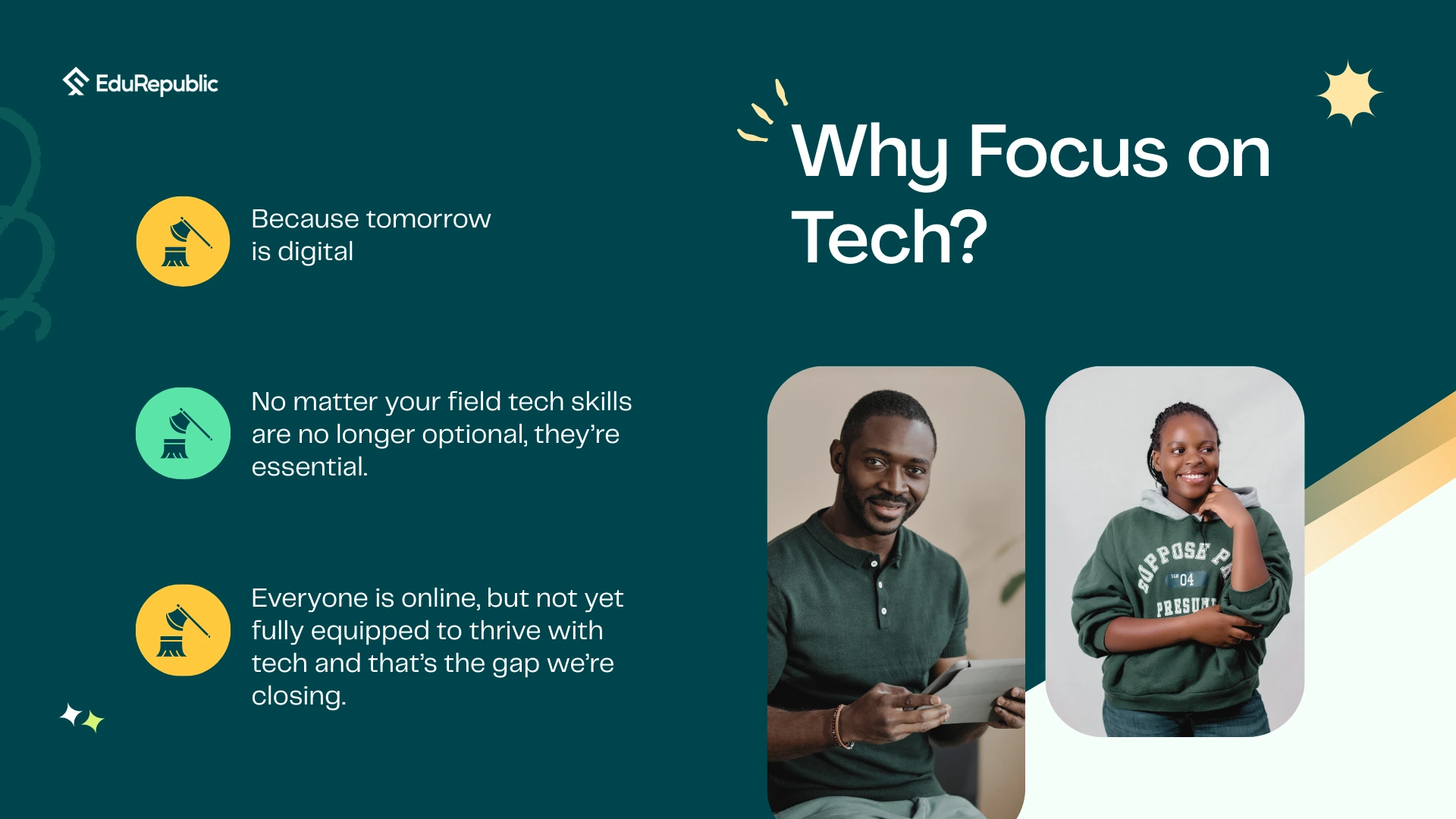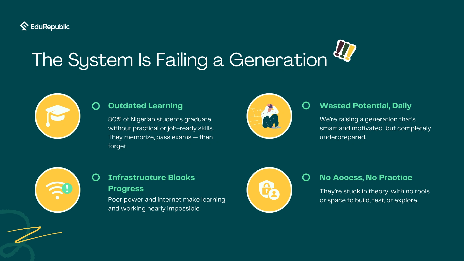 EduRepublic is an ambitious education startup focused on reimagining learning for young Africans through tech education, co-working spaces, global study access, and edu-media. The project required a compelling investor- and partner-ready pitch deck that could clearly communicate the problem, vision, opportunity, and multi-solution ecosystem in a visually engaging and emotionally resonant way.